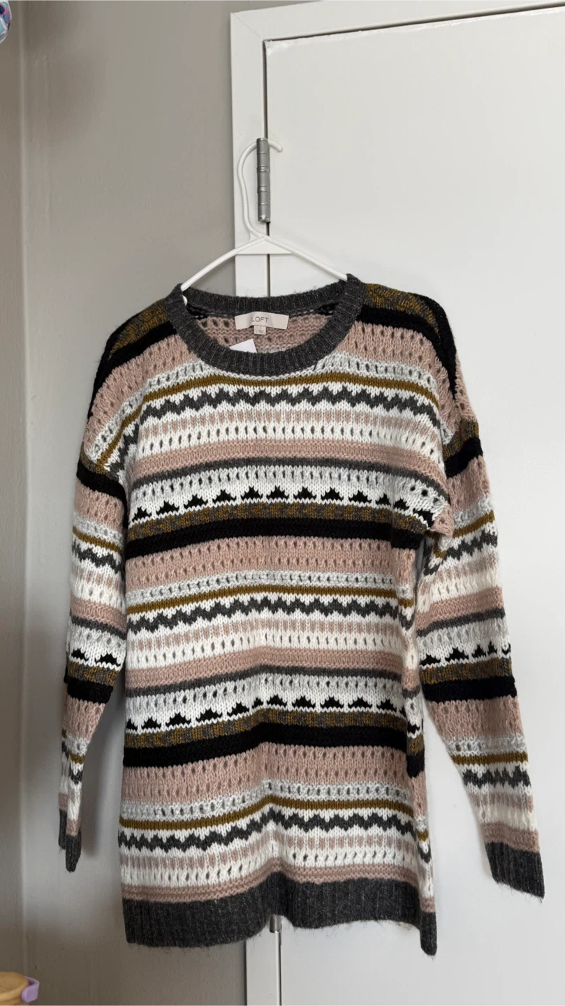 60Here's a cute Loft sweater in size L! It has a lovely striped pattern with colors including pink, white, black, and gray, perfect for adding a cozy touch to your wardrobe