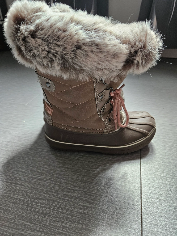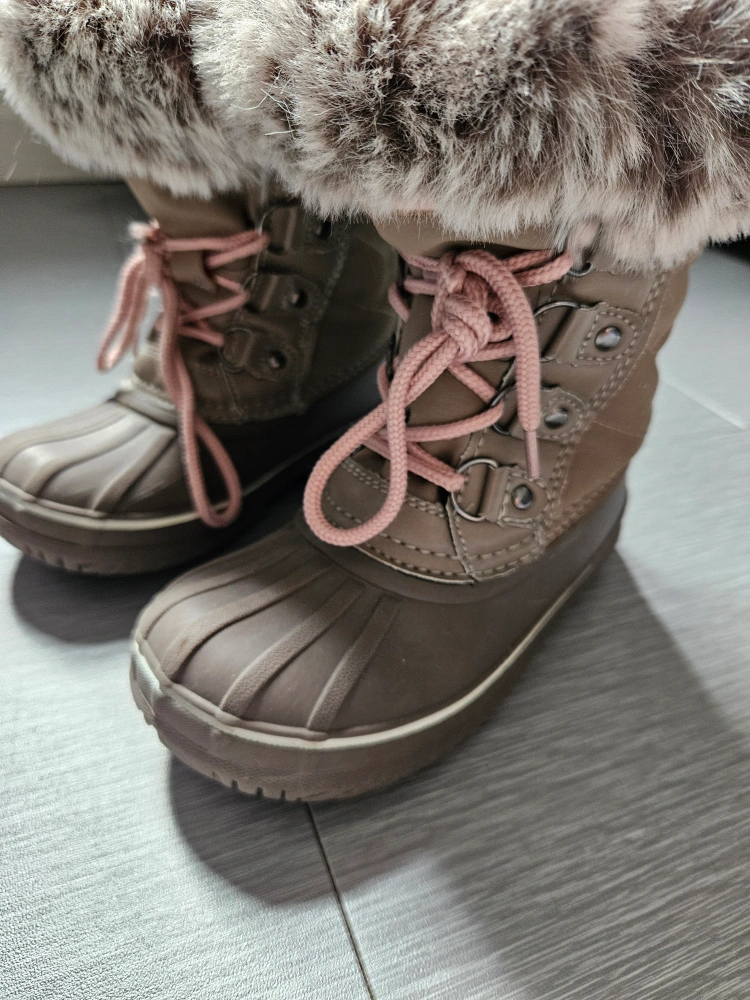 Brown snow boots. Faux fur trim. Pink laces. Water resistant. Good for winter. Toddler/Little kid size.