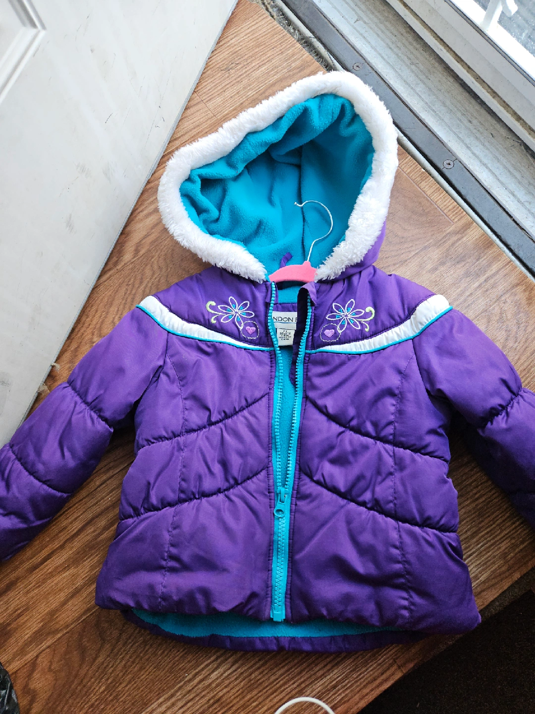 10Here's a cute purple puffer jacket from London Fog! It's a size 2T and has a cozy, furry hood. The jacket features a vibrant blue lining and sweet floral details on the front. Perfect for keeping your little one warm and stylish!