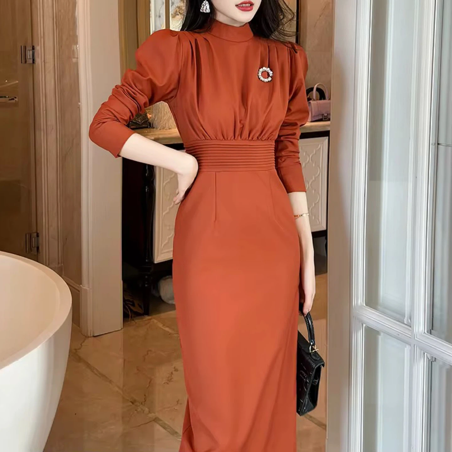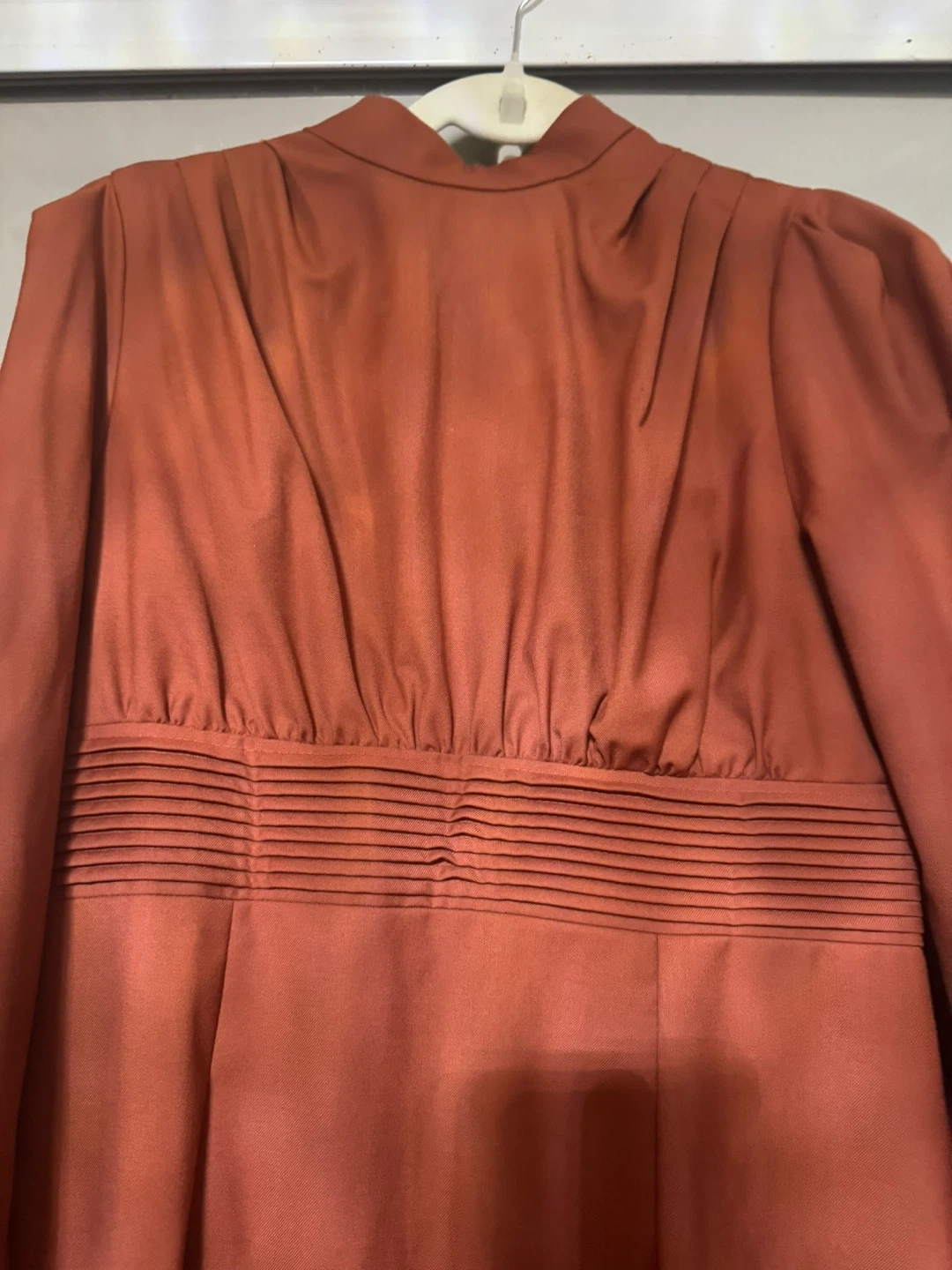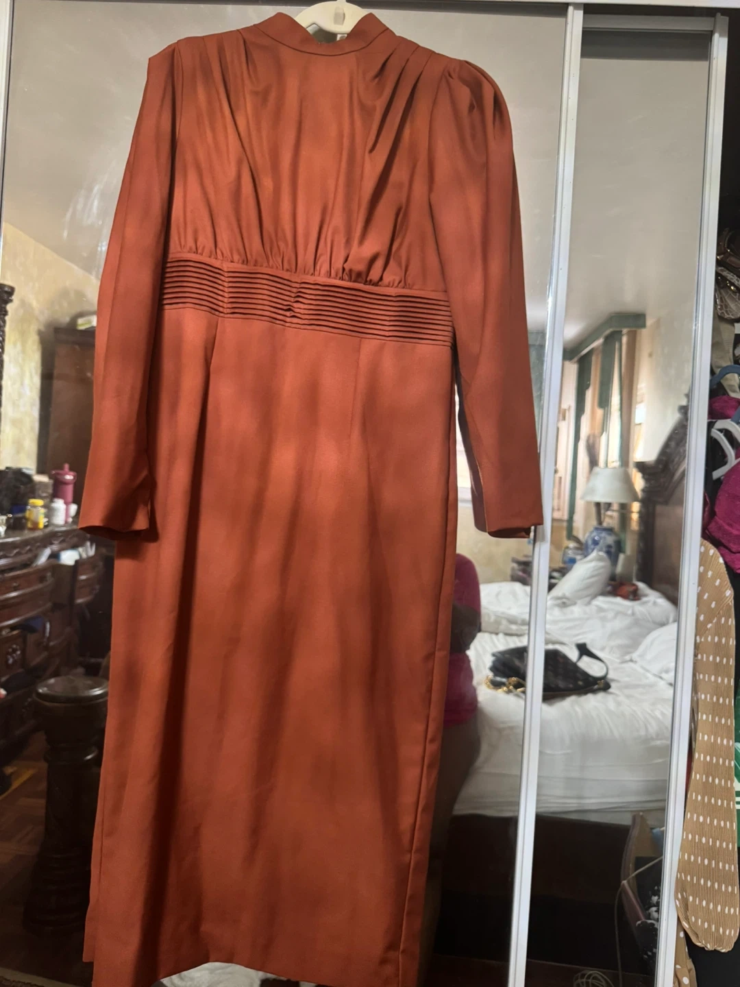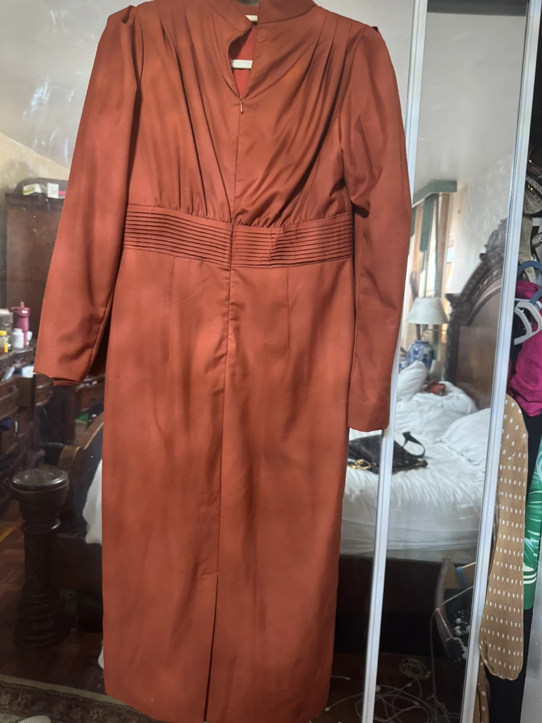 Selling a long sleeve dress in a rust color. It has a high neckline and a fitted waist. Perfect for a special occasion!