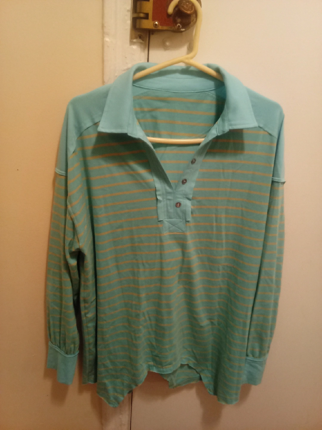 135Here's a cute striped long sleeve polo shirt! It features a light blue color with orange stripes. Perfect for a casual and comfy look