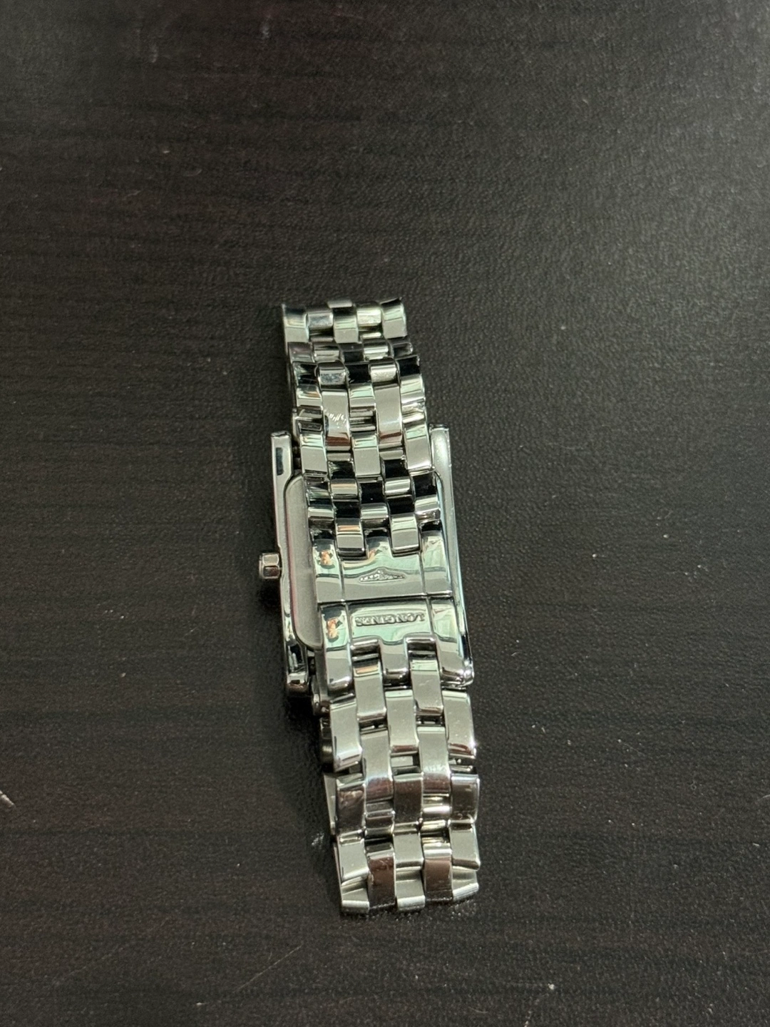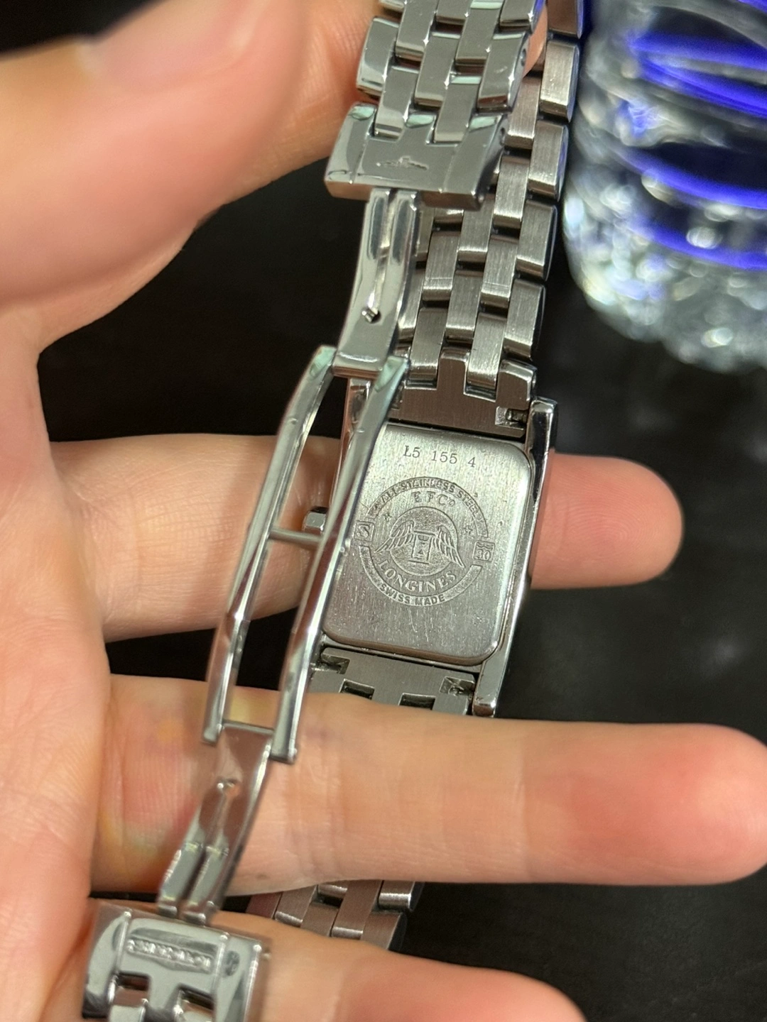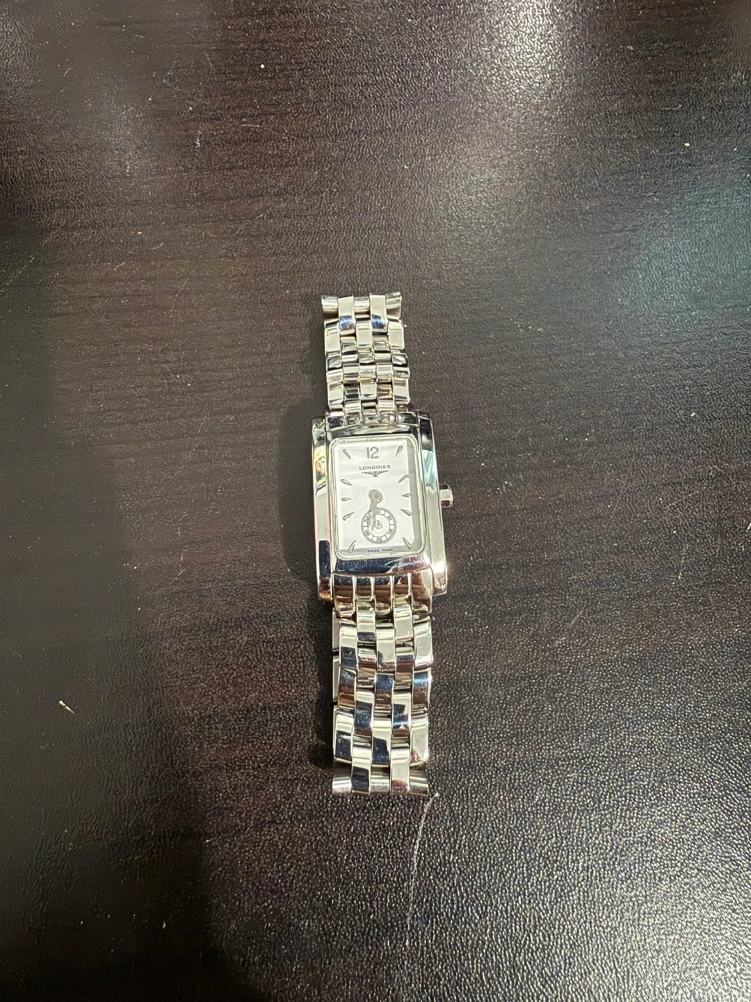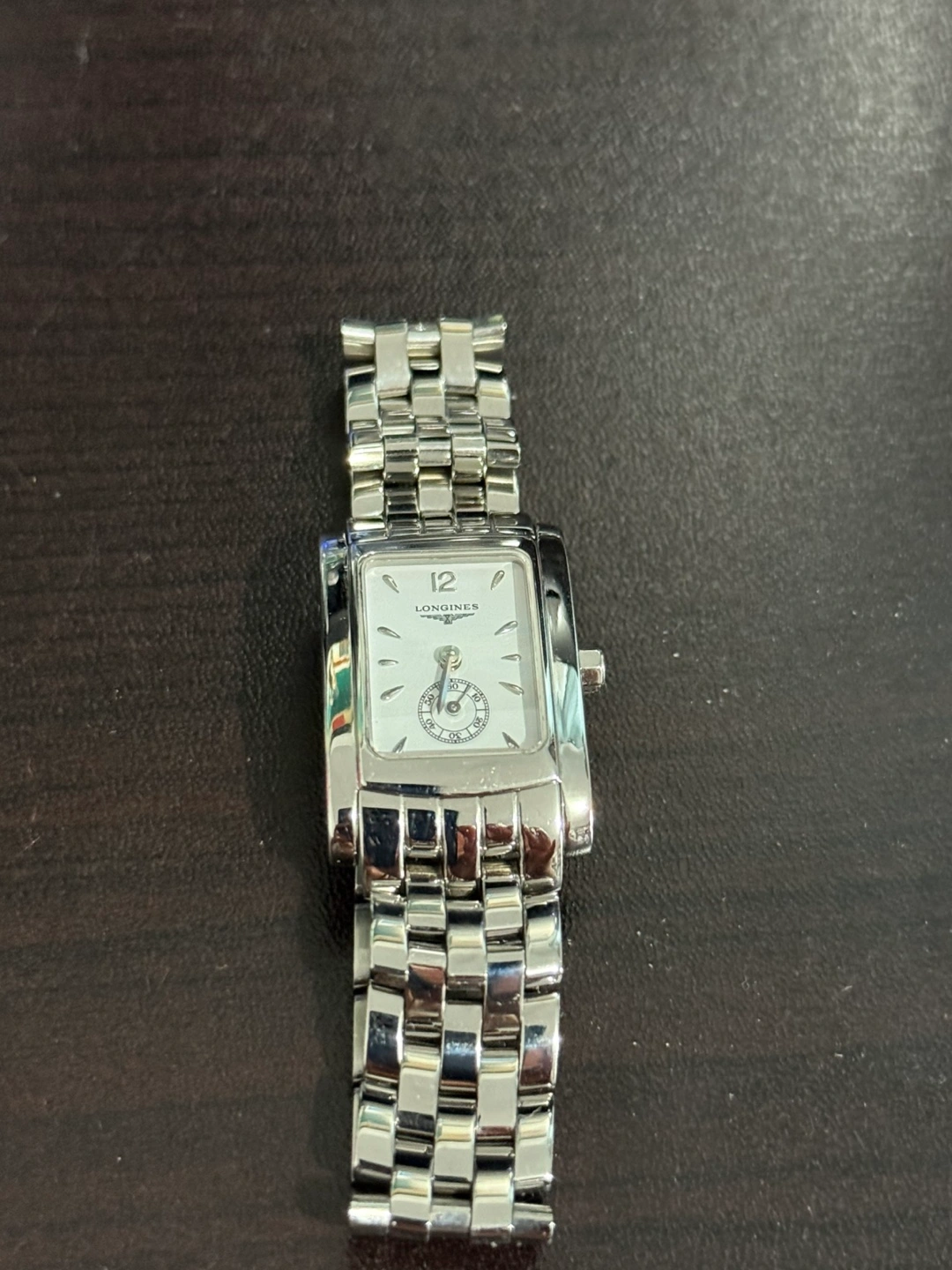 65Elegant Longines watch. Rectangular face, silver-tone metal band. Quartz movement. Pre-owned.