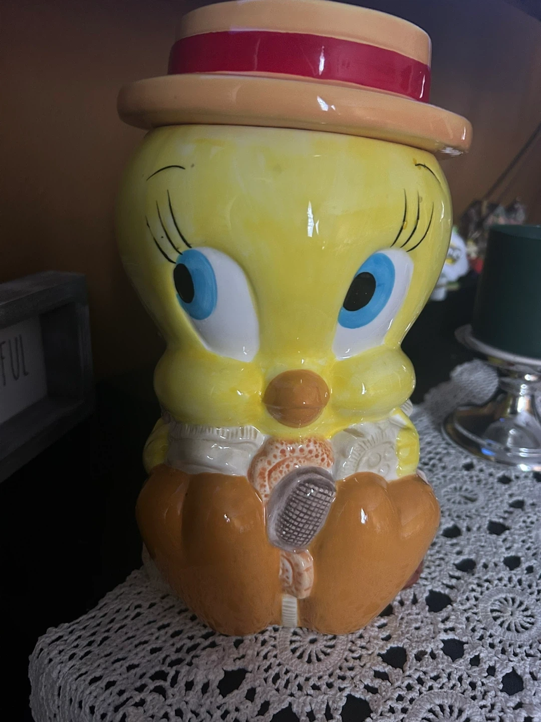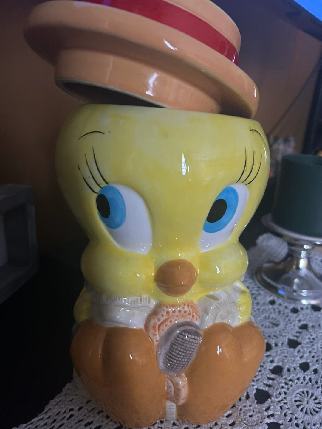 Looney Tunes Tweety Bird Glazed Ceramic Cookie Jar. Super cute cookie jar in wonderful vintage condition. Perfect for cookies, to add to a collection or display on its own. Colors are bright and vibrant. Condition is consistent with age and use. Approximately: 12” tall x 5” in diameter