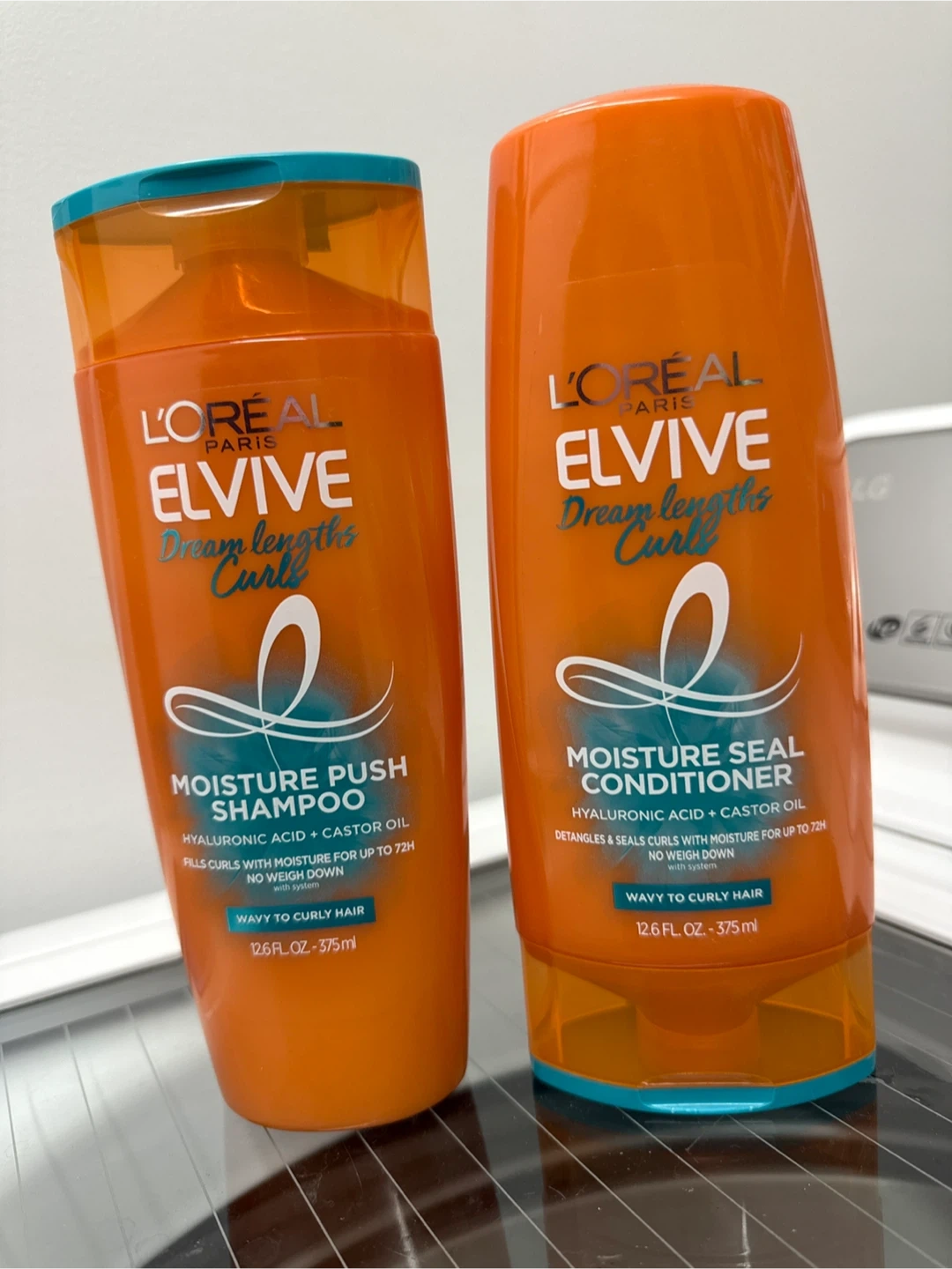 Selling a set of L'Oreal Elvive Dream Lengths Curls shampoo and conditioner. These are great for wavy to curly hair. They both contain hyaluronic acid and castor oil, which helps to fill and seal curls with moisture for up to 72 hours without weighing them down. Each bottle contains 12.6 fl oz (375 ml)