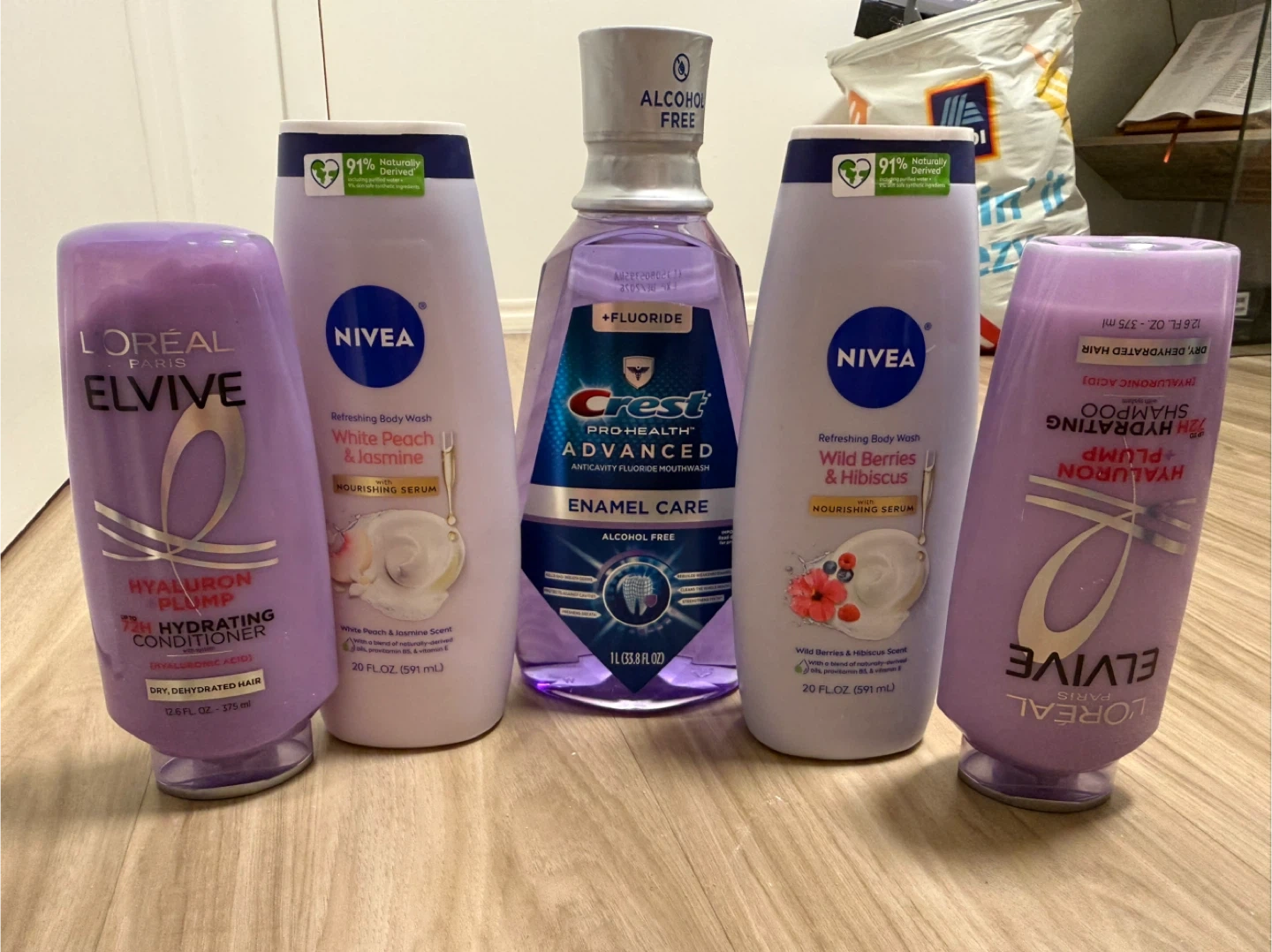 Selling a few different items here! I have L'Oreal Elvive Hyaluron Plump 72H Hydrating Conditioner and Shampoo for dry, dehydrated hair, Nivea Refreshing Body Wash in White Peach & Jasmine and Wild Berries & Hibiscus scents, and Crest Pro-Health Advanced Anticavity Fluoride Mouthwash