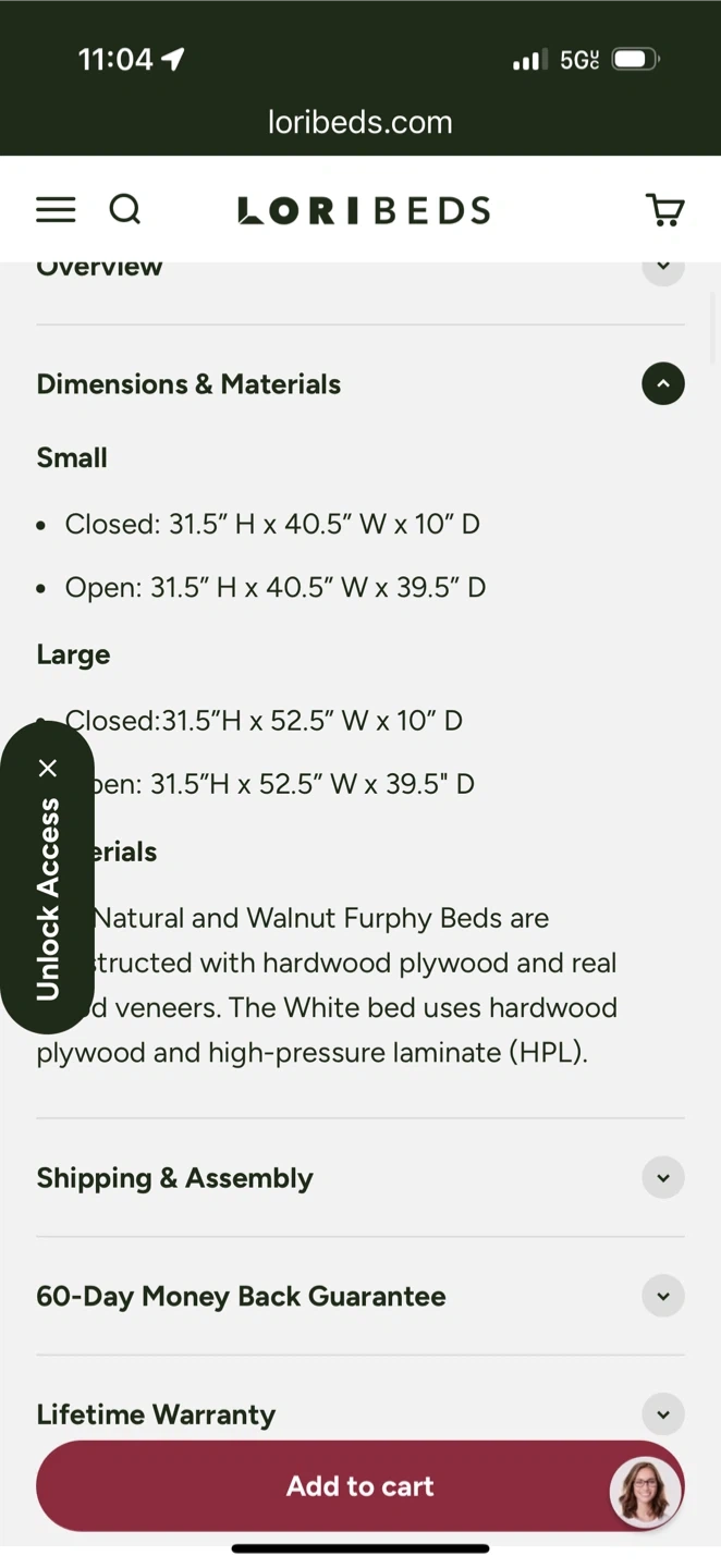 10Selling a Lori Beds The Furphy Bed Bundle! It's the small size and comes with its original box. Here are the dimensions: - Closed: 31.5" H x 40.5" W x 10" D - Open: 31.5" H x 40.5" W x 39.5" D These natural and walnut furphy beds are constructed with hardwood plywood and real wood veneers. The white bed uses hardwood plywood and high-pressure laminate (HPL)