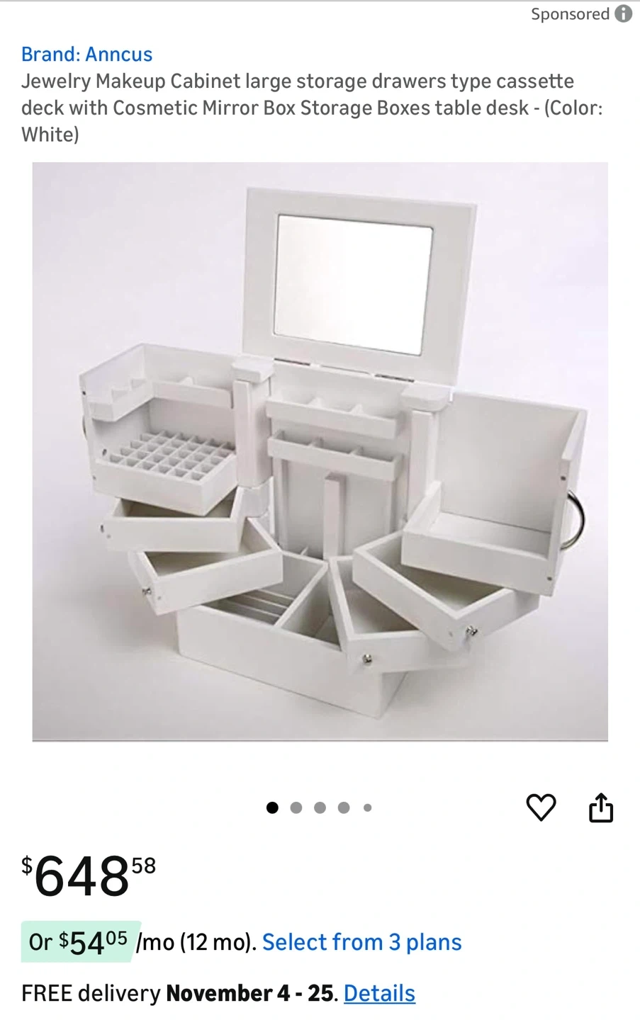 Selling a white lori greiner jewelry and makeup cabinet. It features large storage drawers and a cosmetic mirror box. It's a great way to organize your jewelry and makeup! Compare with original price is $648 on Amazon!!!