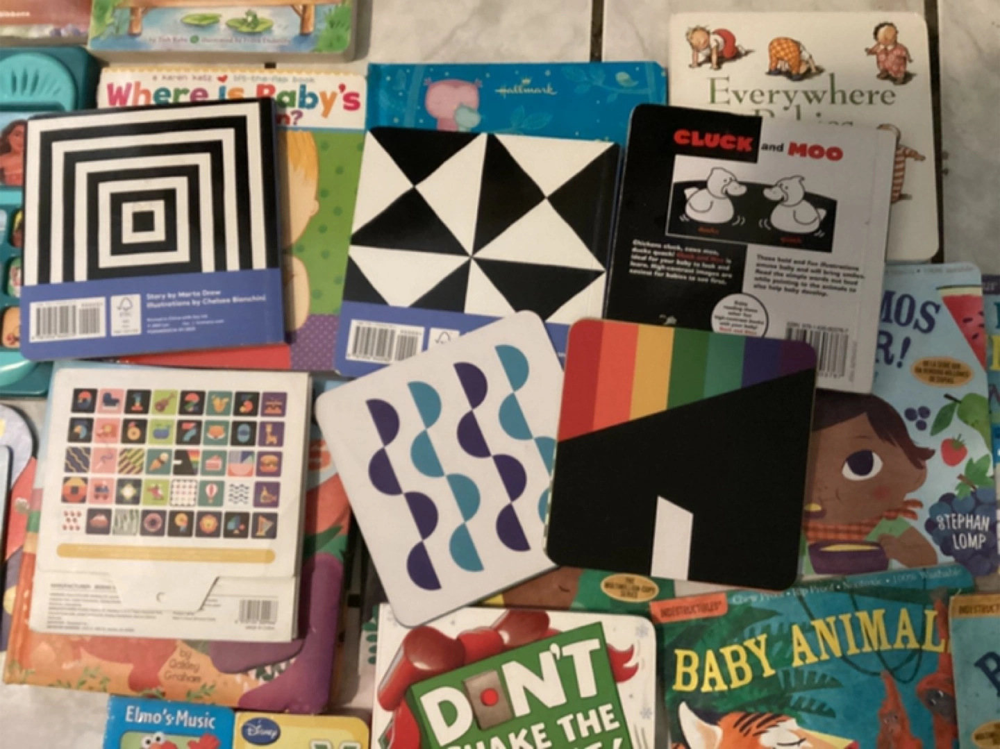 Collection of 20 baby and toddler books. Variety of subjects and styles. Has several high contrast books, unbreakable books and music book with sounds.