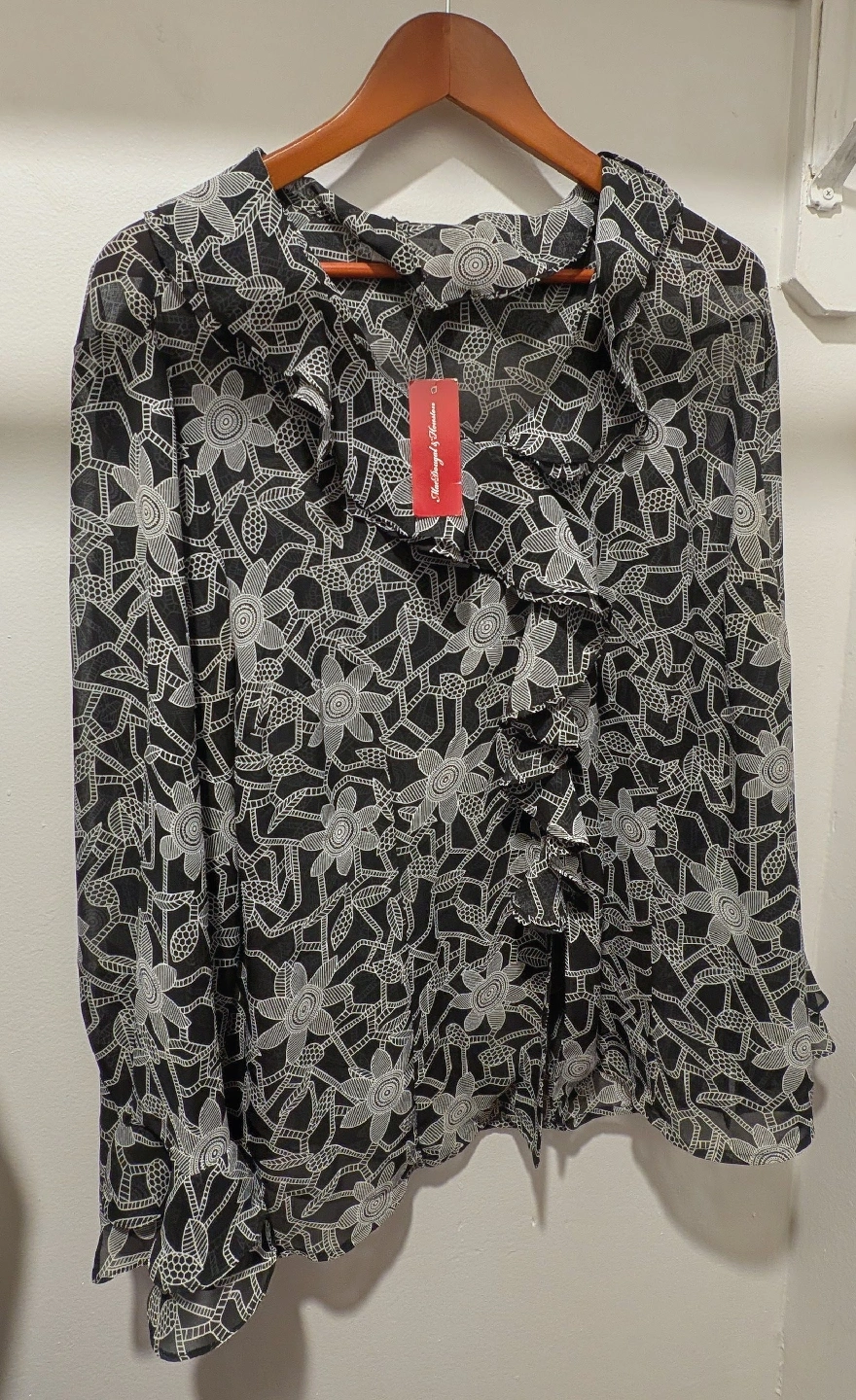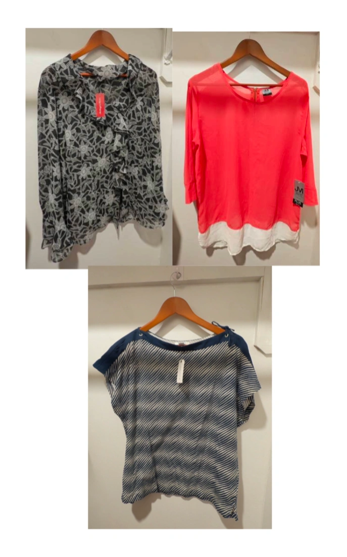 A great deal on a bundle of THREE brand new with tags (NWT) women's blouses/tops! Perfect for refreshing your wardrobe with versatile, never-worn pieces. 1. NAUTICA Nautical Stripe Off-Shoulder Top Brand: Nautica Size (Tag): L Style: Short sleeve, off-shoulder/wide neckline with navy trim and tie details on the shoulders. Diagonal navy/white stripe pattern. Material: 95% Cotton, 5% Spandex (soft, comfortable knit) 2. J.M. Collection Coral Sheer Layered Blouse Brand: J.M. Collection (Macy's brand) Size (Tag): XL Style: Vibrant coral/neon pink sheer top with 3/4 sleeves. Features a white layered hem and a small gold zipper detail on the back of the neck. Condition: NWT. 3. Ruffled Black & White Lace Print Blouse Size (Tag): L Style: Dramatic sheer long-sleeve blouse with an intricate black and white floral/lace print. Features a prominent cascading ruffle down the front and collar. Condition: NWT. Bundle Details: Condition for all: New With Tags (NWT) Selling as a lot only. Great deal for personal use or resale! Local pickup only.