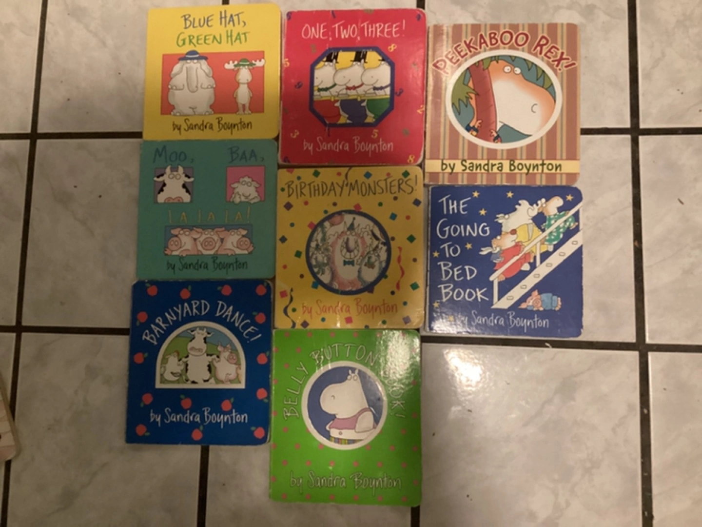 Collection of eight used Sandra Boynton board books. Titles include: Blue Hat, Green Hat; One, Two, Three; Peekaboo Rex!; Moo, Baa, La La La!; Birthday Monsters!; The Going to Bed Book; Barnyard Dance!; Belly Button. Great for young children.