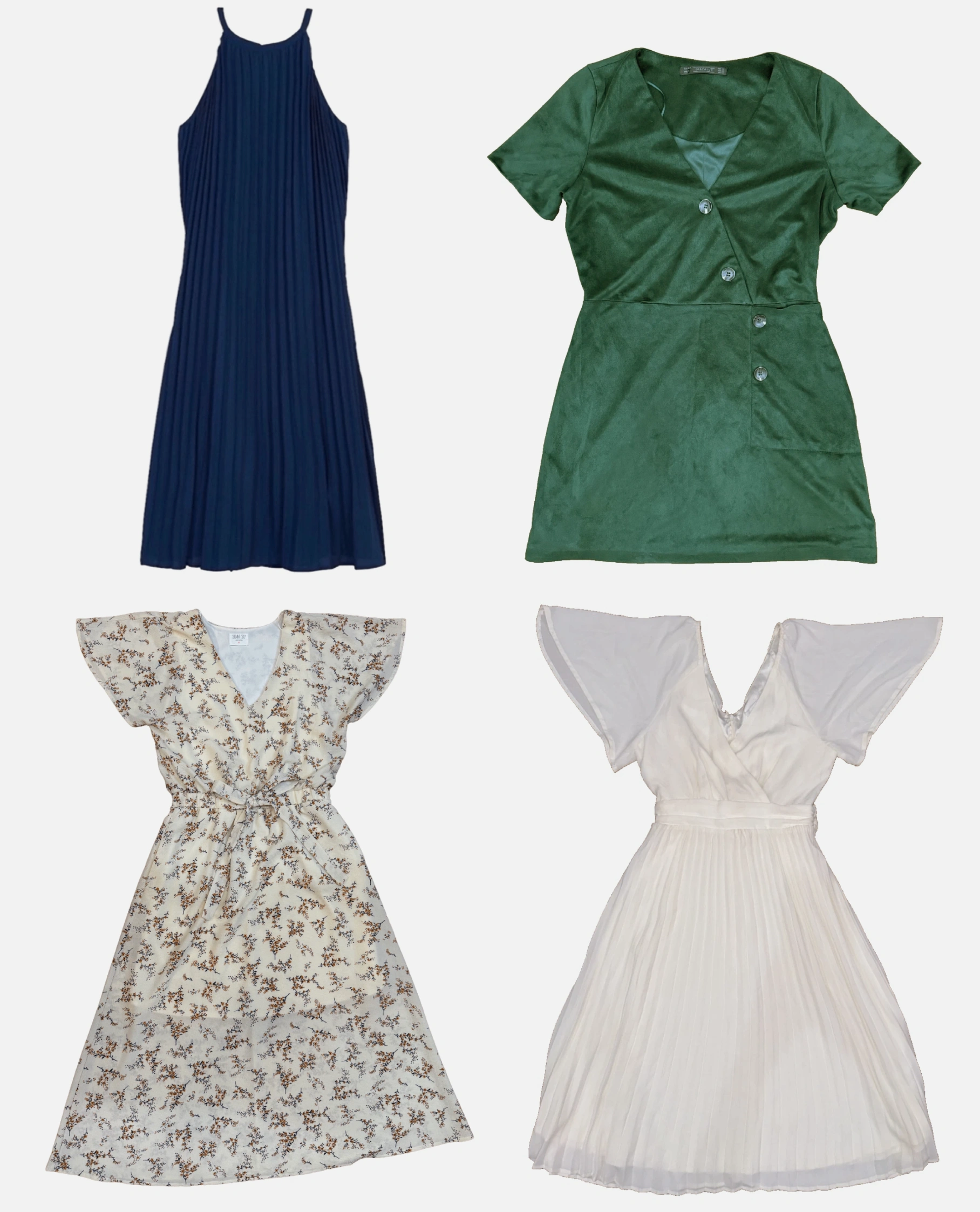 10Selling a mixed lot of women’s dresses, great condition, clean, and from a smoke- and pet-free home. Perfect for casual, brunch, work, or summer outfits. Includes: 1. Green Zara Trafaluc Dress – Size M Soft faux-suede feel, button front, short sleeves. 2. Navy Express Pleated Dress – Size XS (fits like S) Flowy pleated design, high-neck, perfect for layering. 3. Floral Midi Dress – Size M Light, airy, tie waist, flattering flutter sleeves. 4. ModCloth White Pleated Dress – Size 6 (like M) Flutter sleeves, wrap-front style, pleated skirt. Condition: Gently used to excellent. No major flaws.