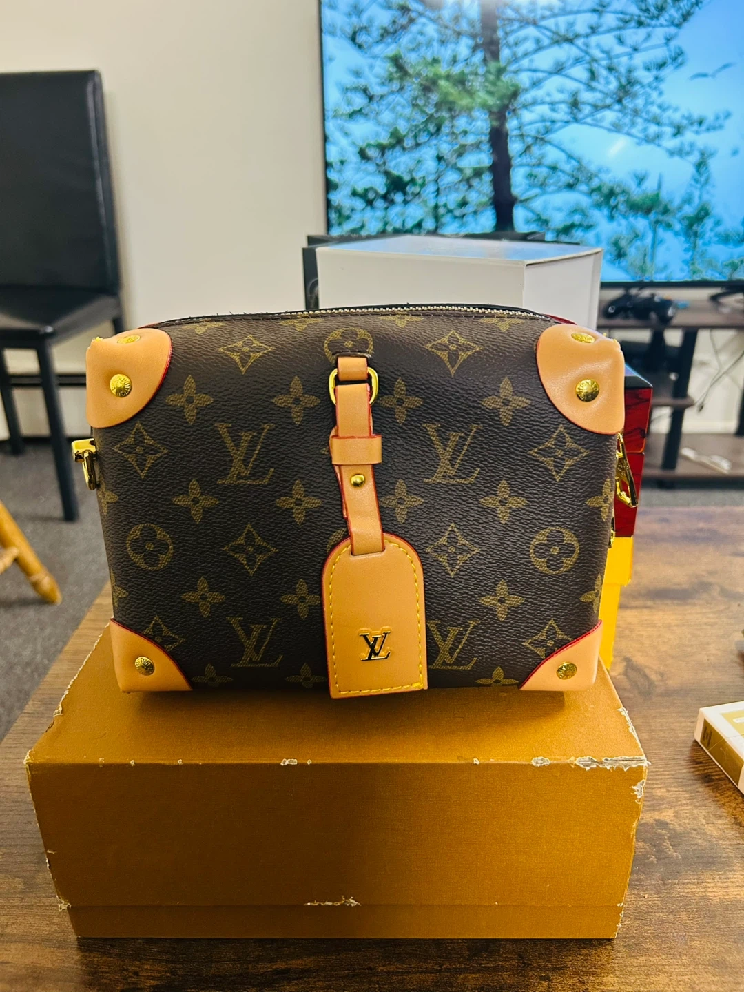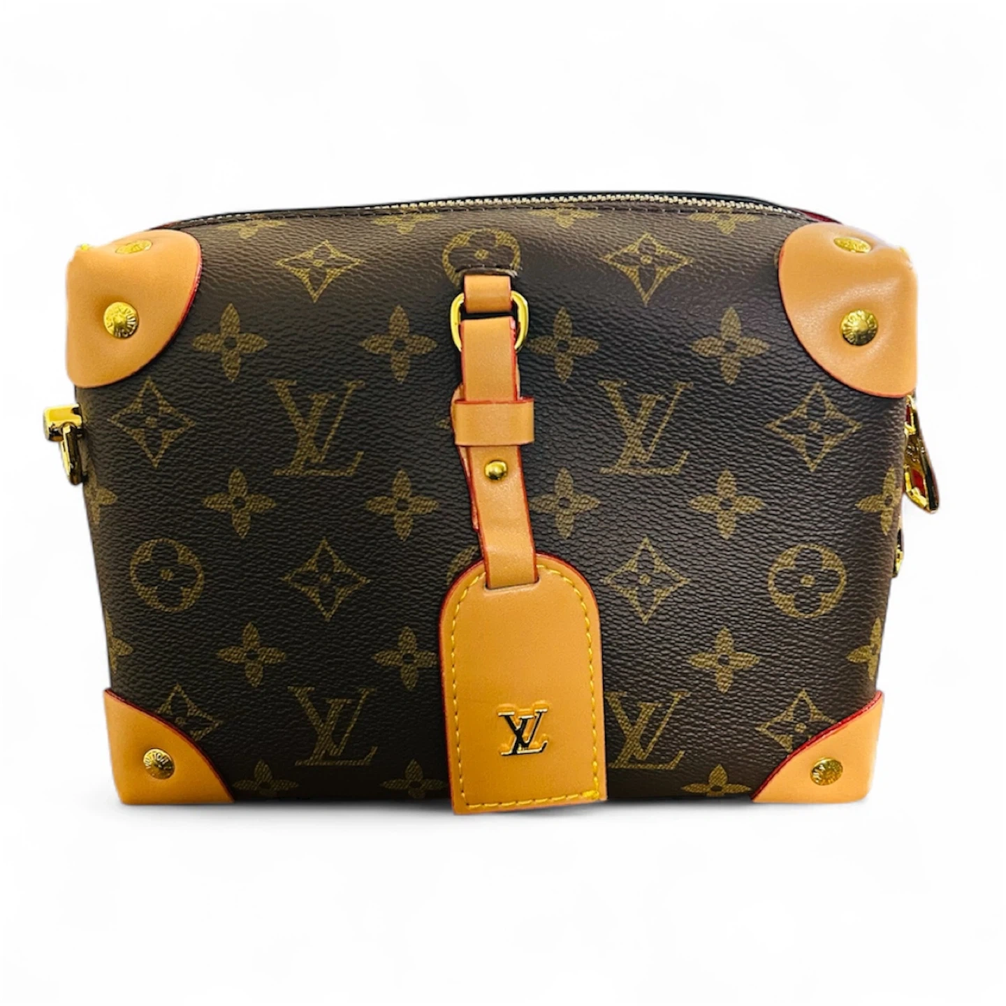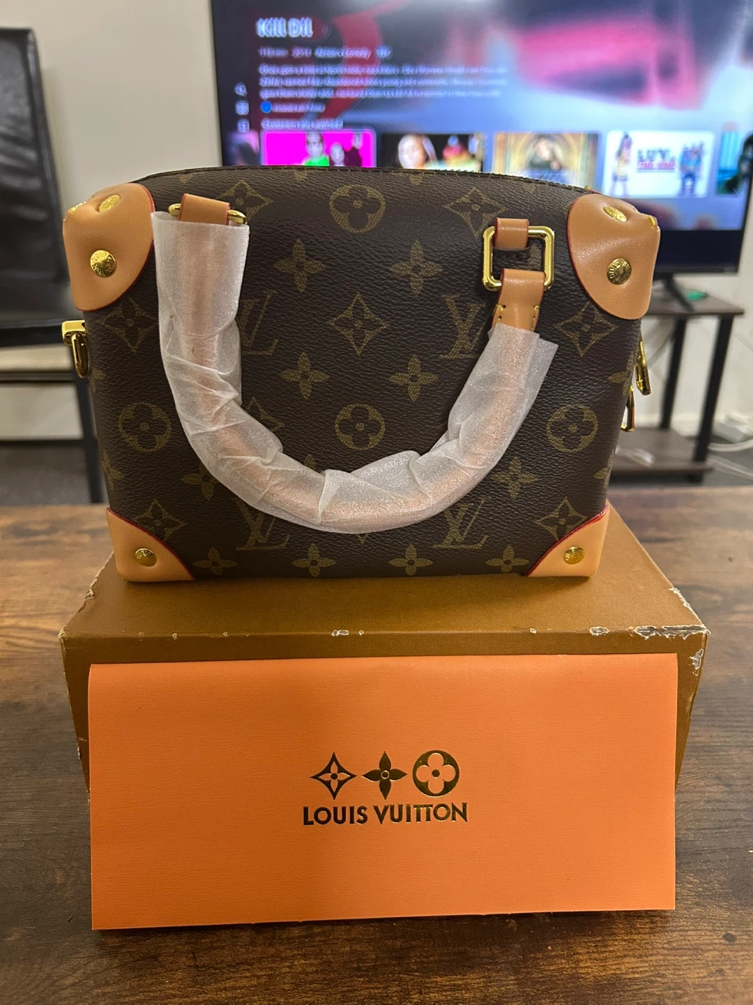 The Louis Vuitton petite malle shoulder bag is a stylish and high-quality accessory crafted from brown leather with the iconic monogram pattern. Featuring a zip closure and a medium size, it is perfect for everyday use. The gold hardware adds a touch of luxury, while the adjustable shoulder strap offers versatility. Made in France, this designer handbag comes with its original dust bag, and box making it a timeless and chic addition to any woman's wardrobe.
