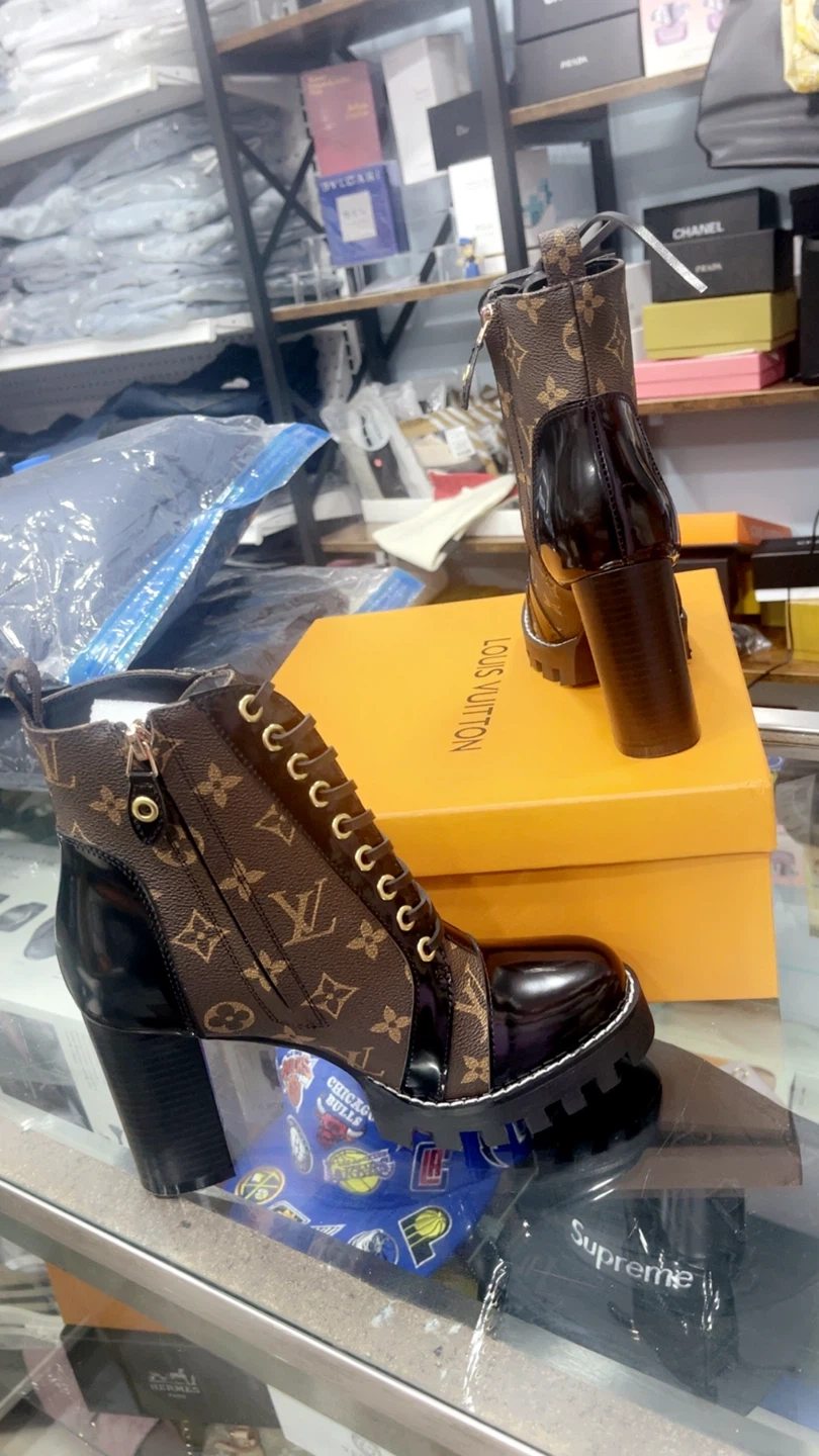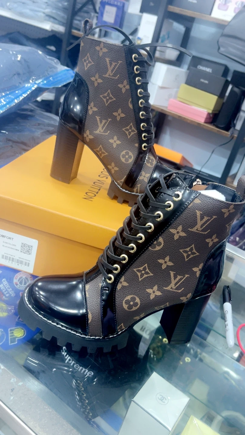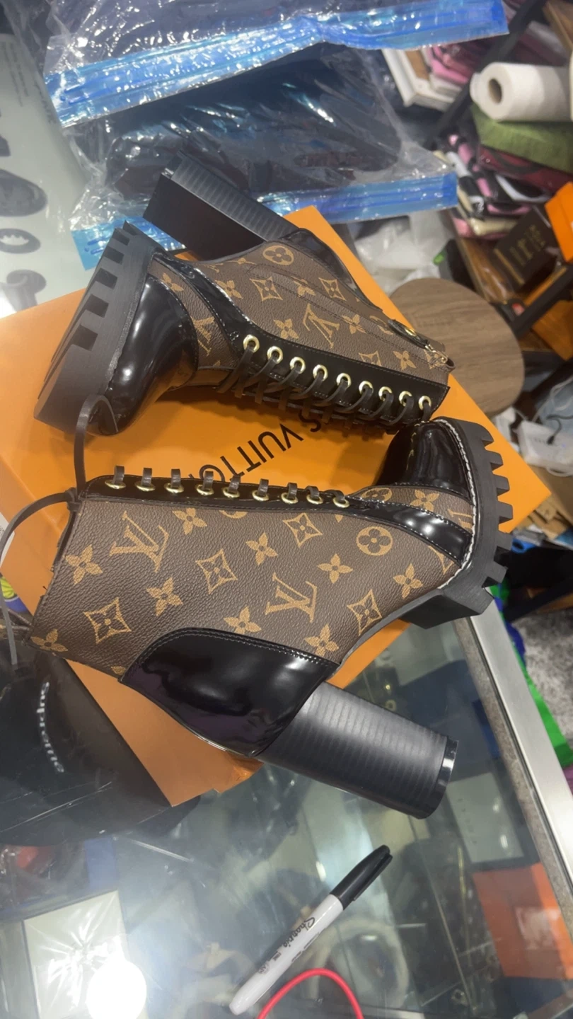 82Selling a pair of Louis Vuitton booties in a size US 6, 6.5, 7! They feature the classic LV monogram pattern in brown with black patent leather accents. These boots have a chunky heel and lace-up design. Comes with the original box! Www.royalmantle.shop