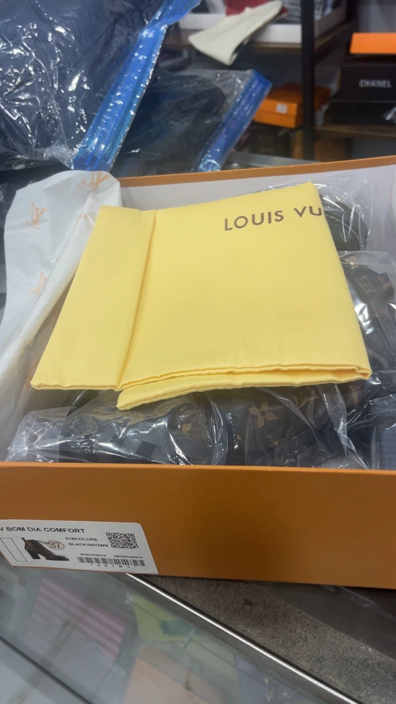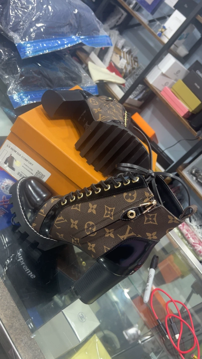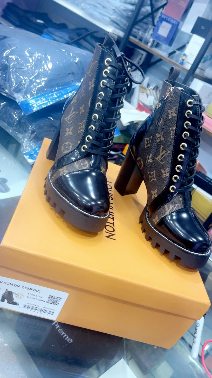 82Selling a pair of Louis Vuitton booties in a size US 6, 6.5, 7! They feature the classic LV monogram pattern in brown with black patent leather accents. These boots have a chunky heel and lace-up design. Comes with the original box! Www.royalmantle.shop