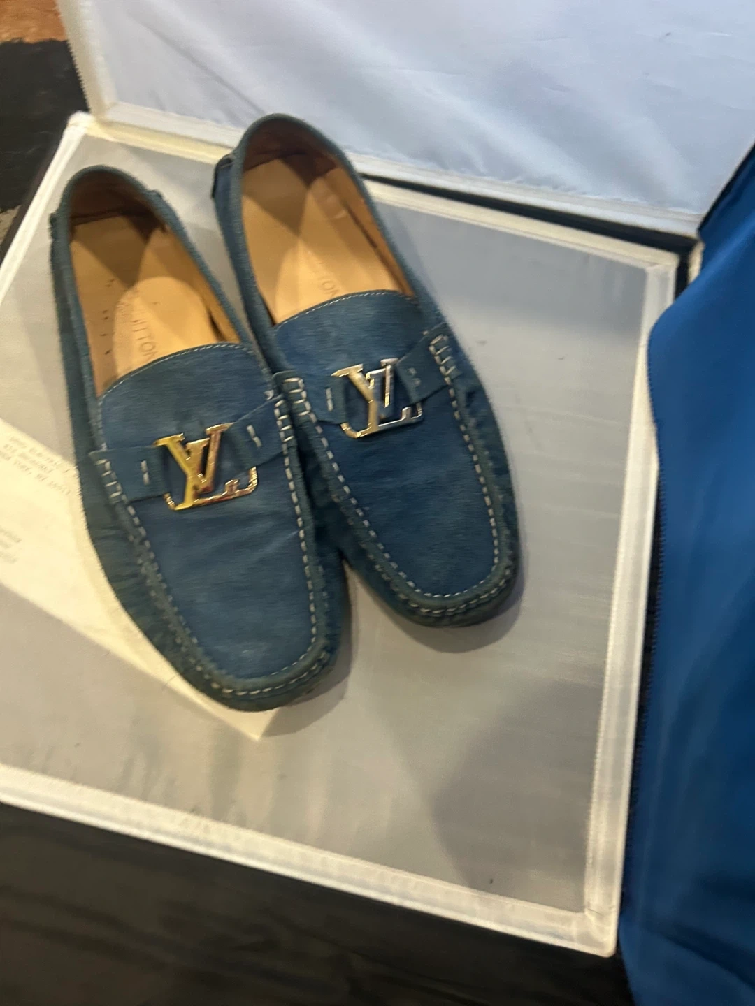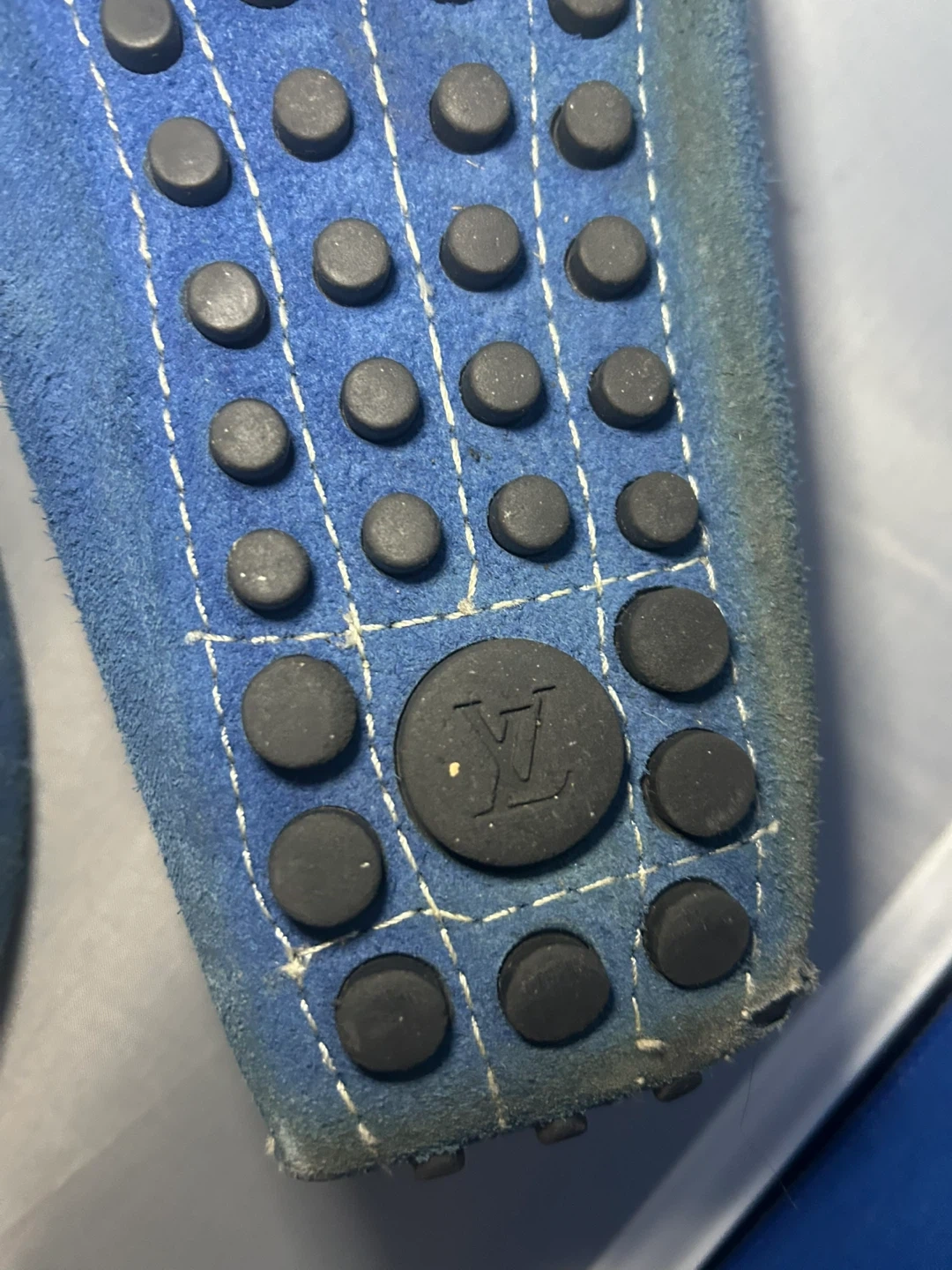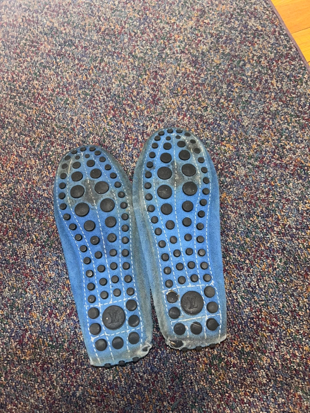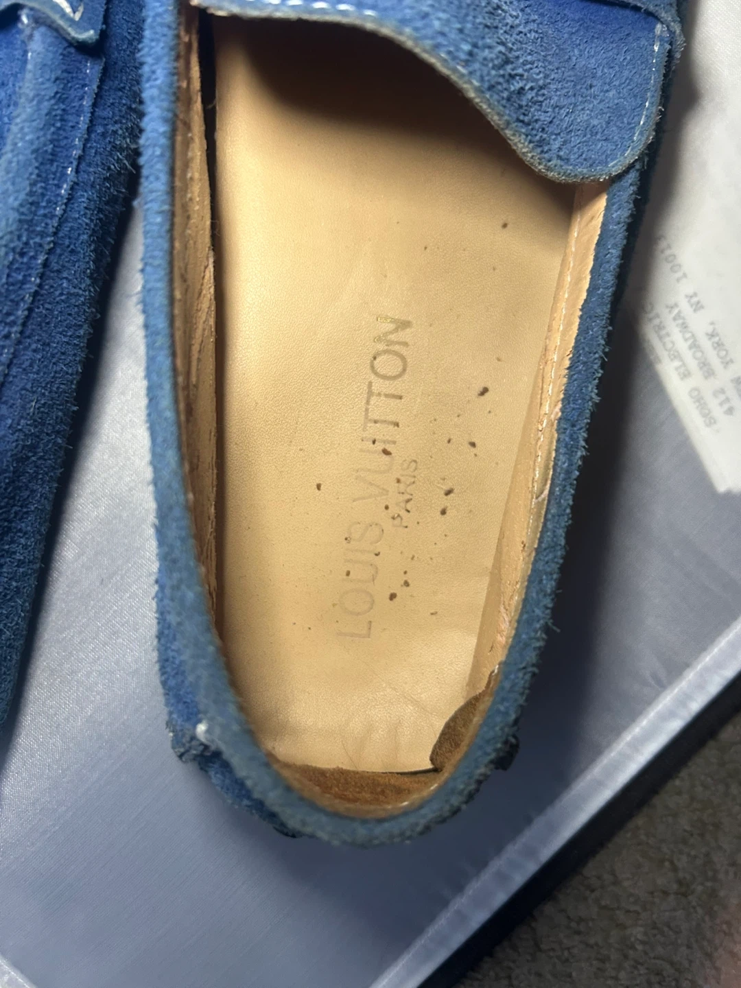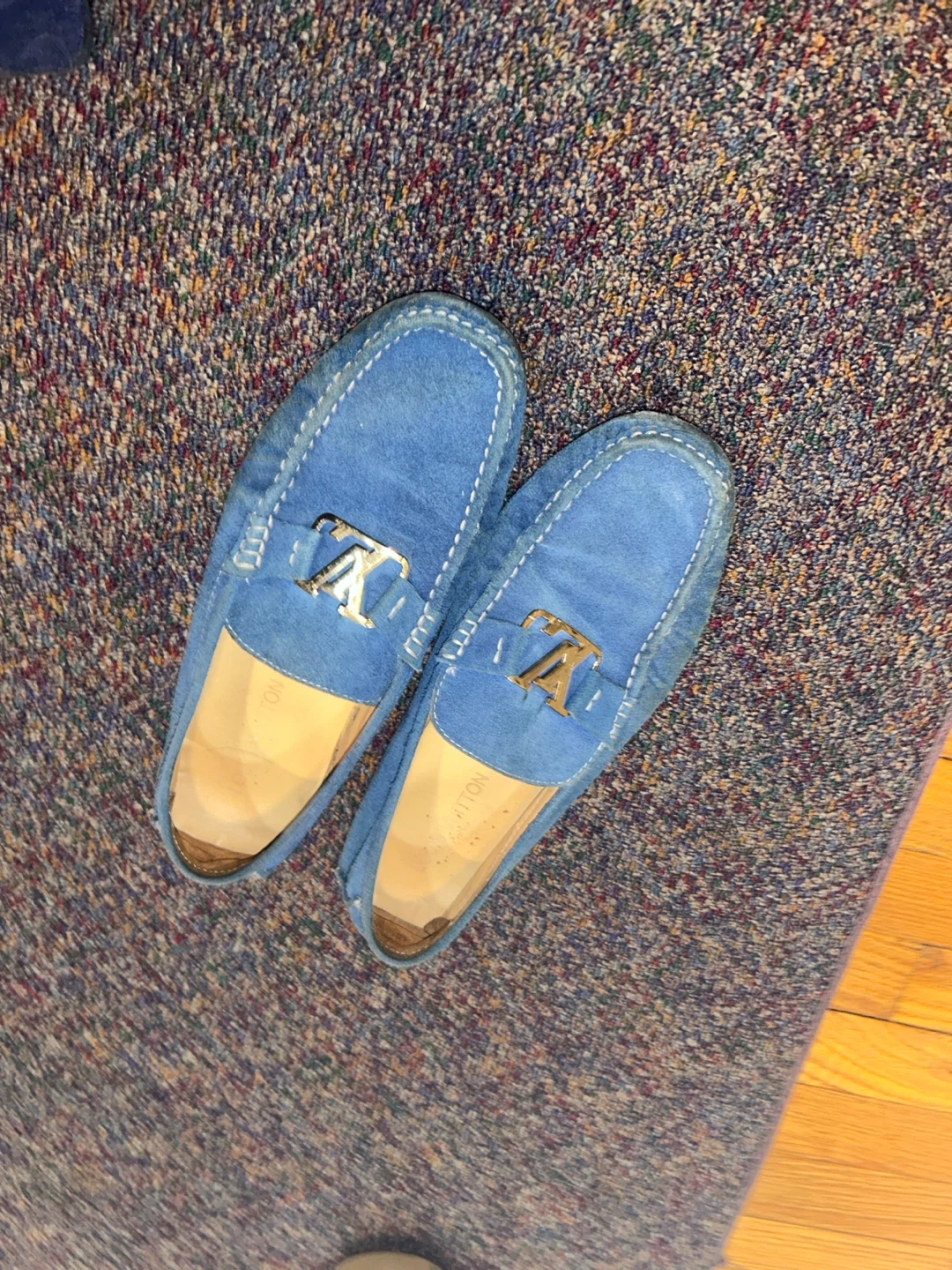 10Selling a pair of Louis Vuitton blue suede loafers in size 45. They show some signs of wear, as pictured, but still have a lot of life left! The iconic LV logo is prominently displayed on the top of each shoe. Perfect for adding a touch of luxury to your everyday style