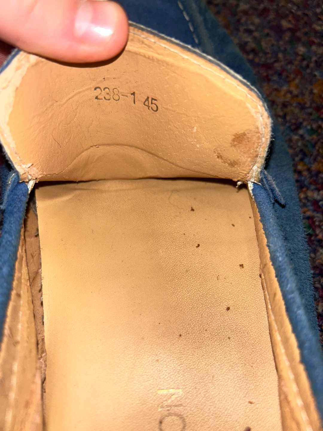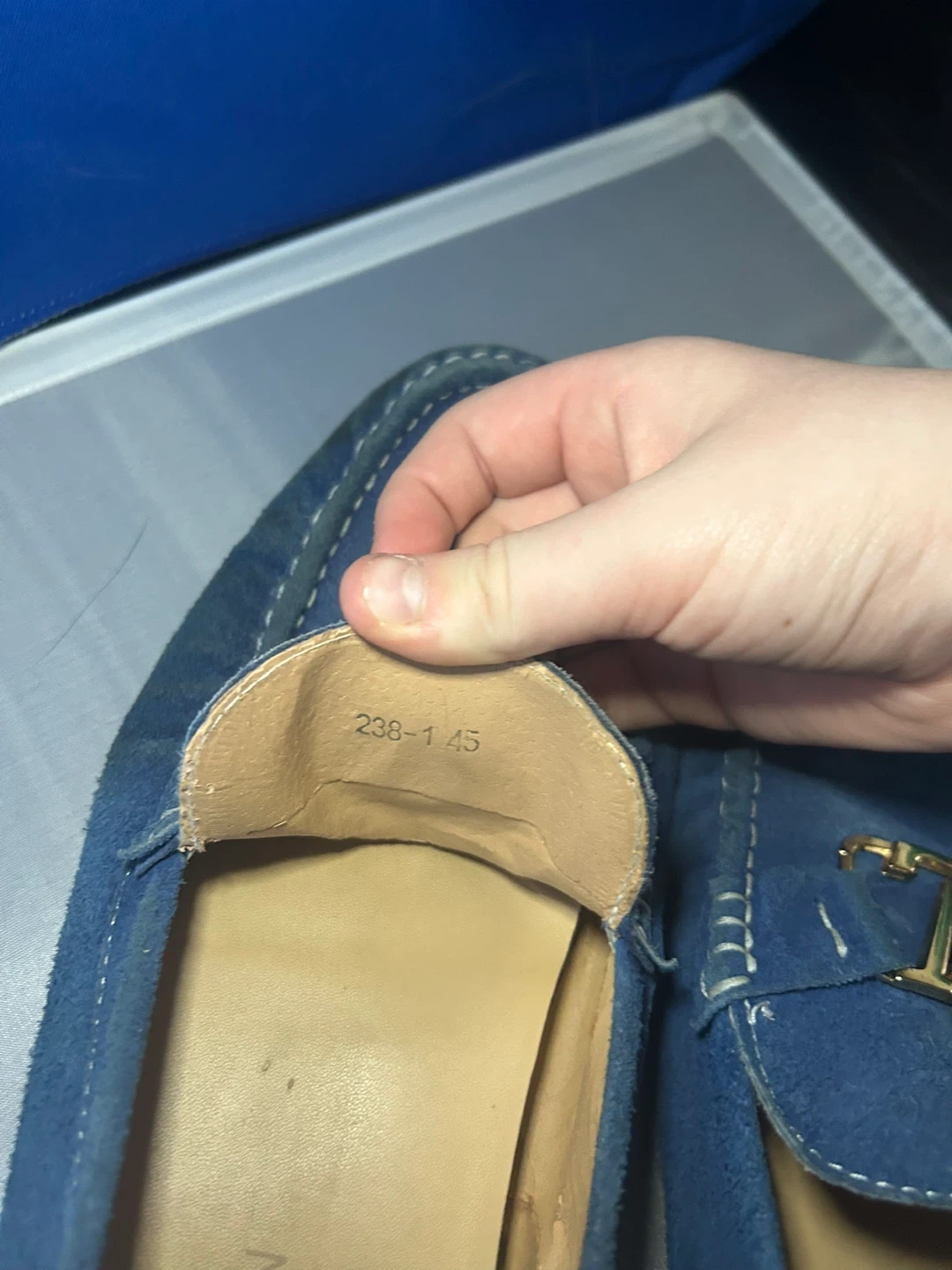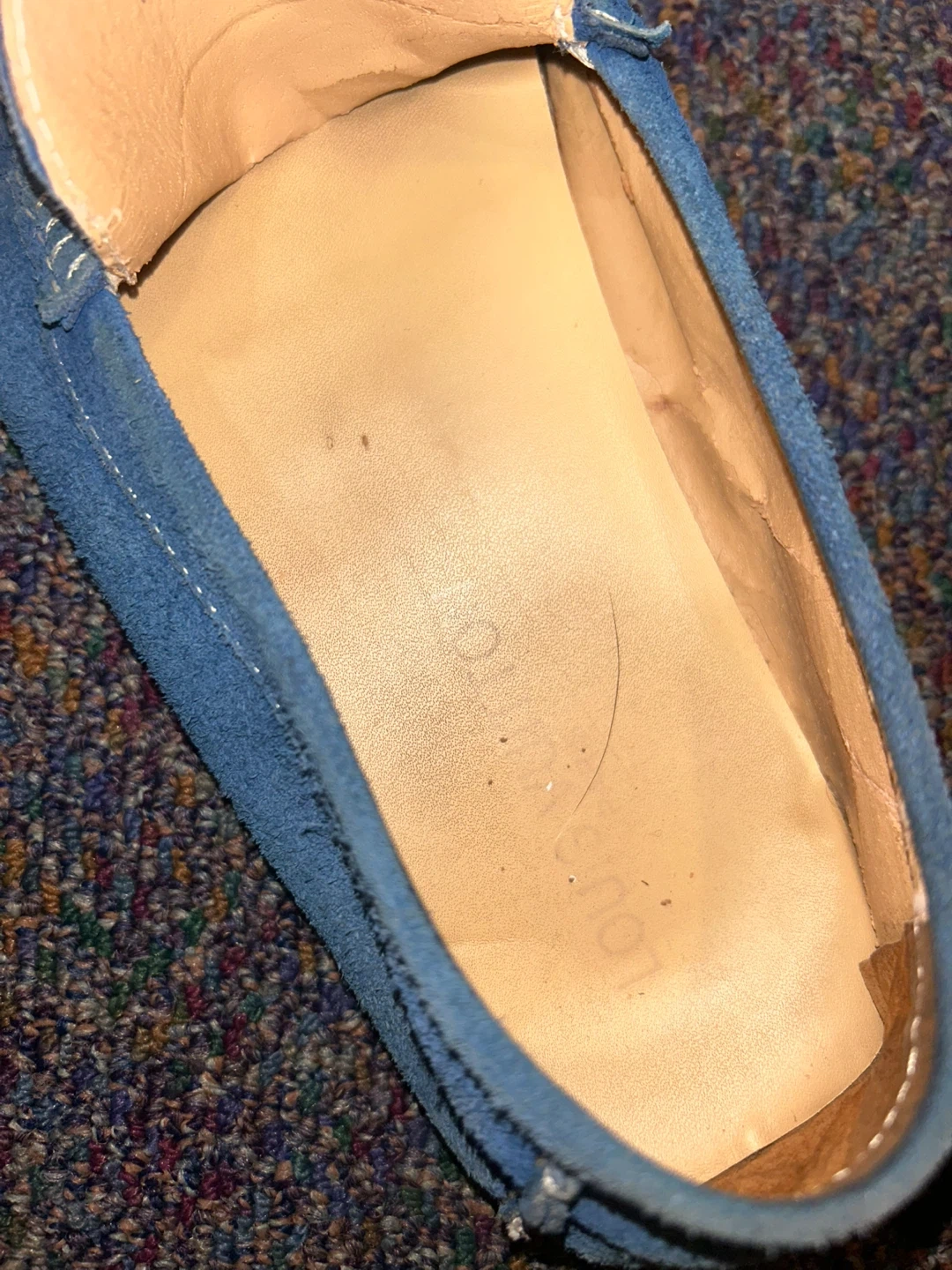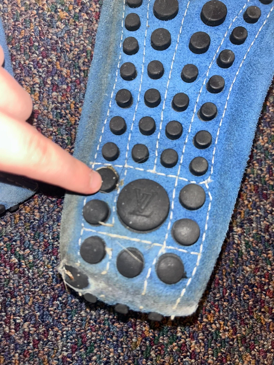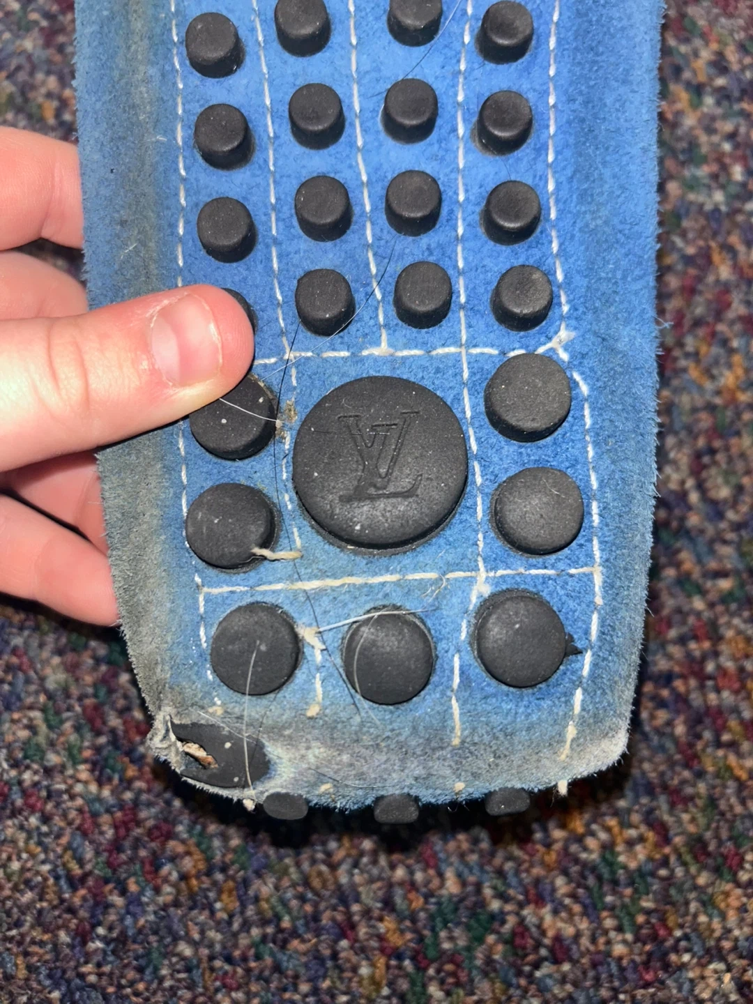 10Selling a pair of Louis Vuitton blue suede loafers in size 45. They show some signs of wear, as pictured, but still have a lot of life left! The iconic LV logo is prominently displayed on the top of each shoe. Perfect for adding a touch of luxury to your everyday style