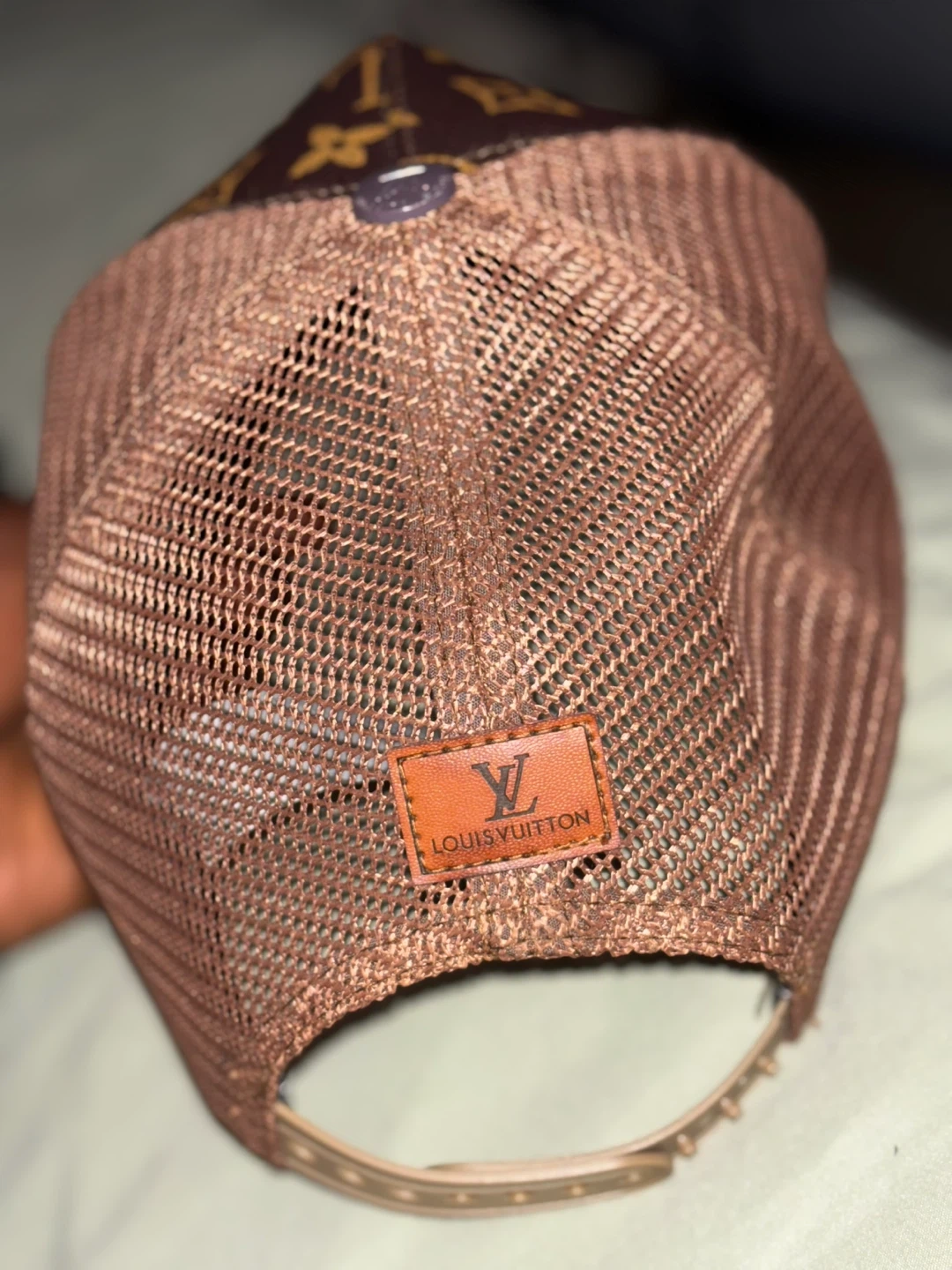 Selling a Louis Vuitton hat in brown. It's made of 100% cotton and features the iconic LV pattern. The hat has a mesh back for breathability. Stylish and perfect for any casual outfit!