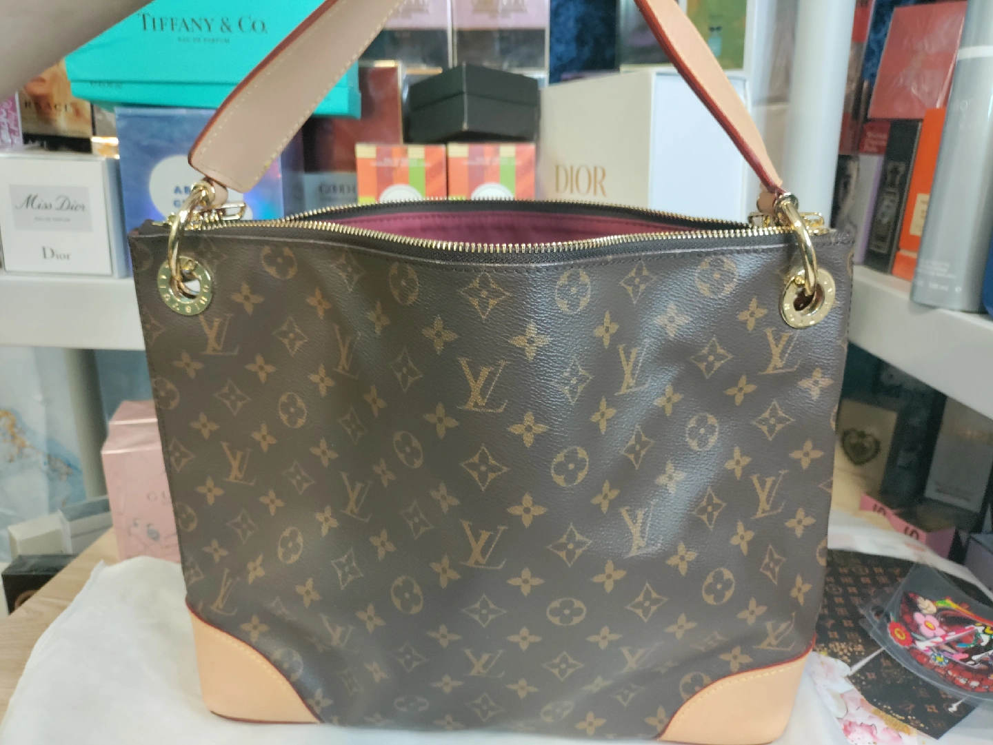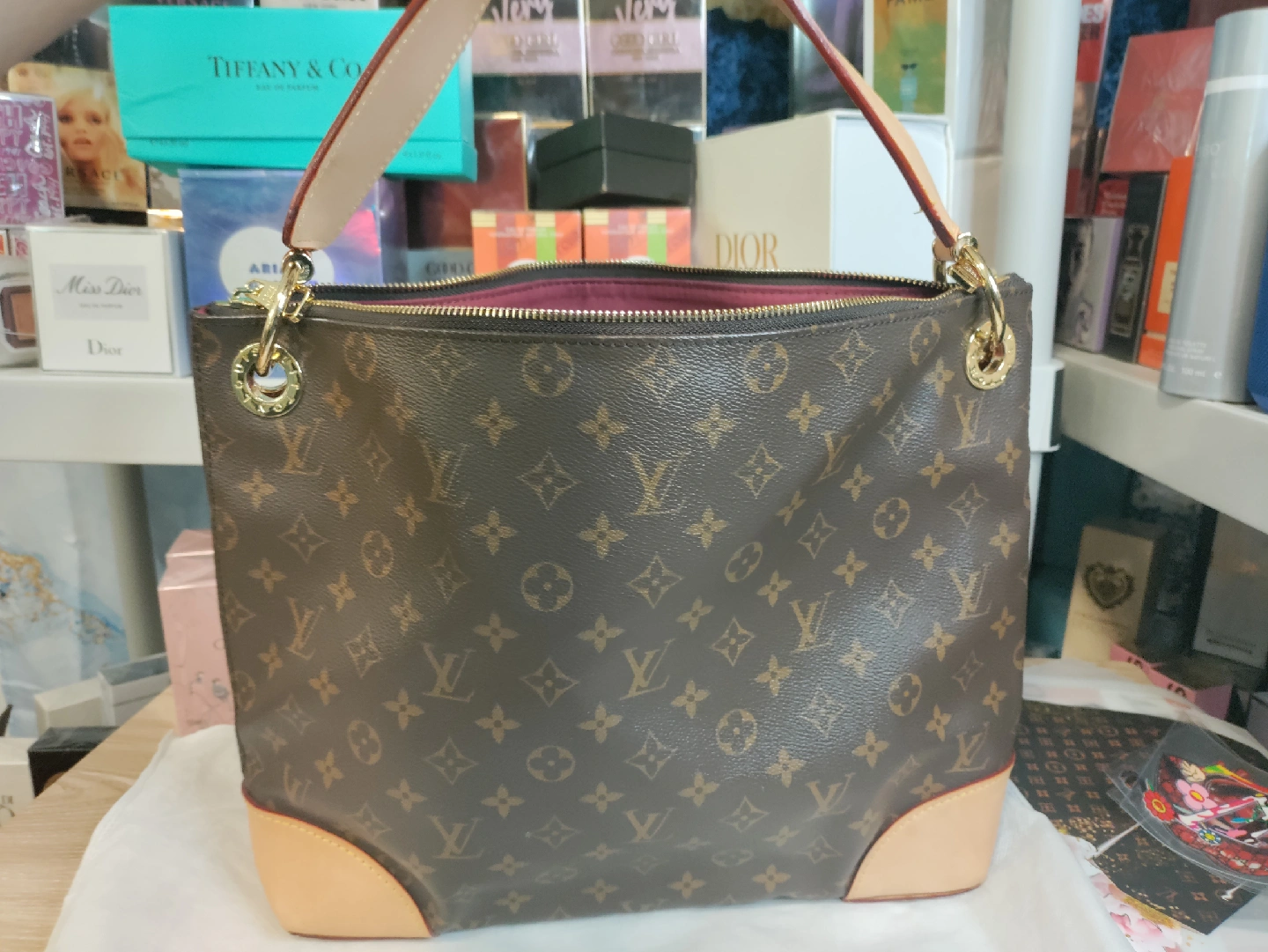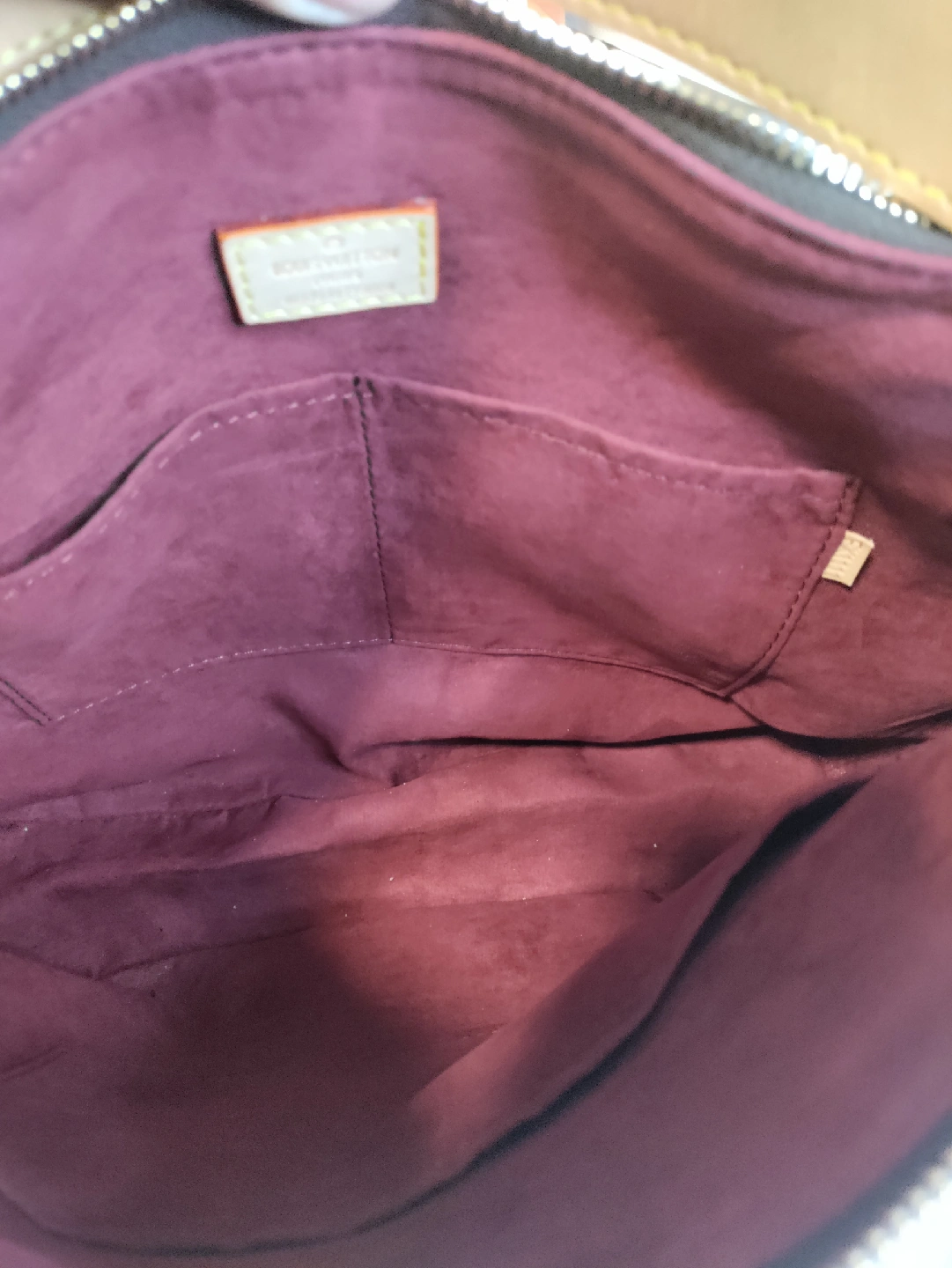 Selling a Louis Vuitton tote bag in brown. It features the classic LV monogram pattern. The interior is a deep burgundy color. Perfect for everyday use!