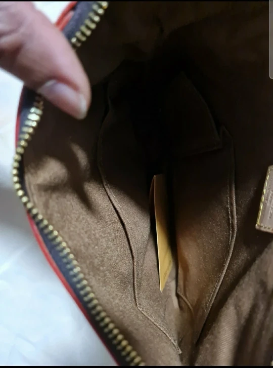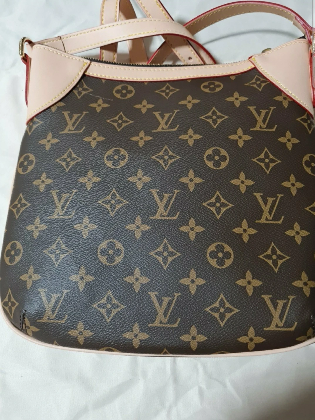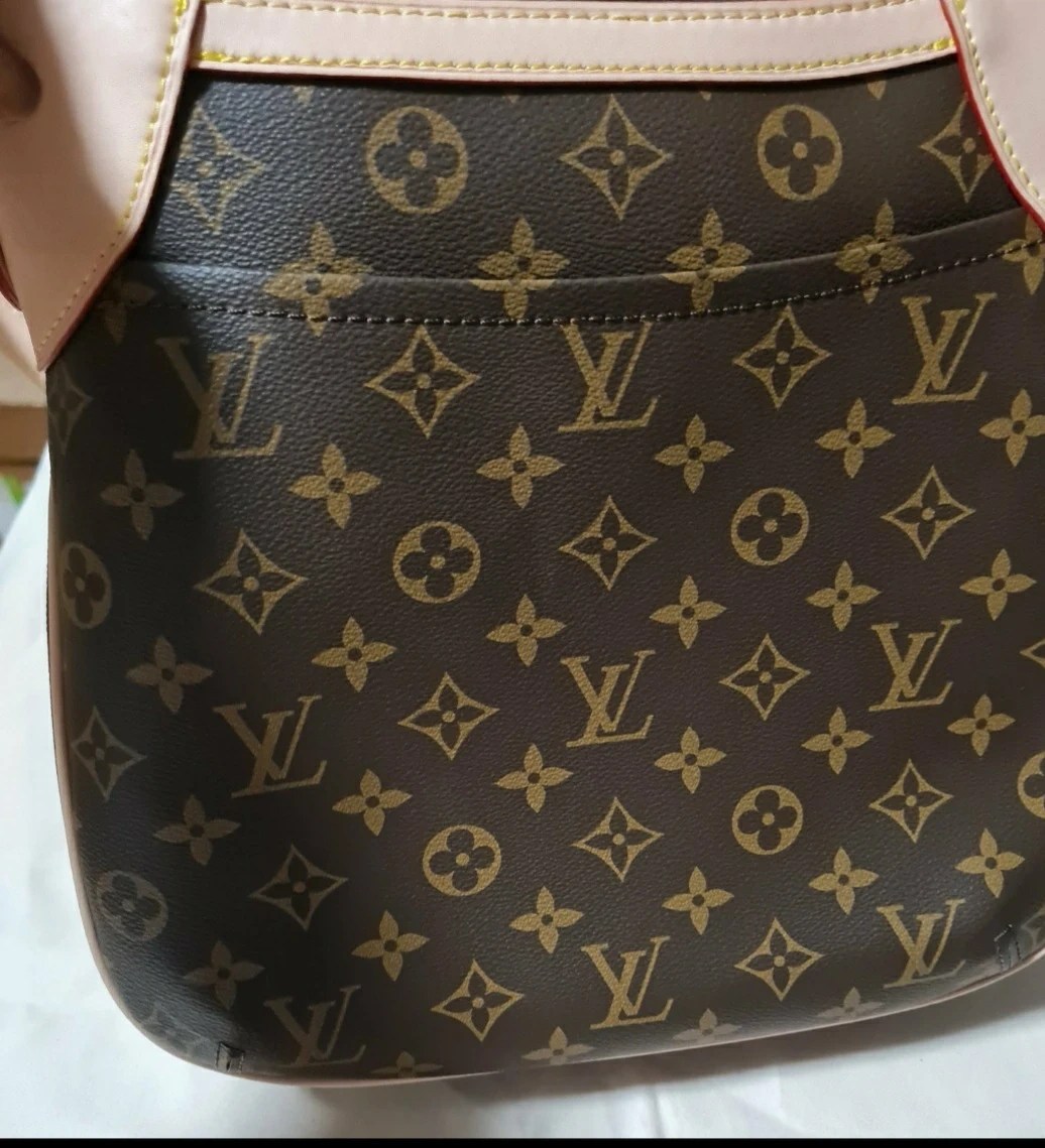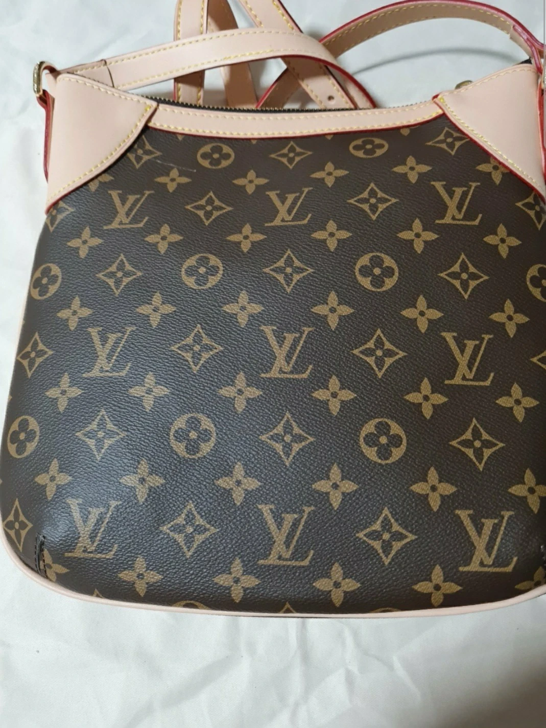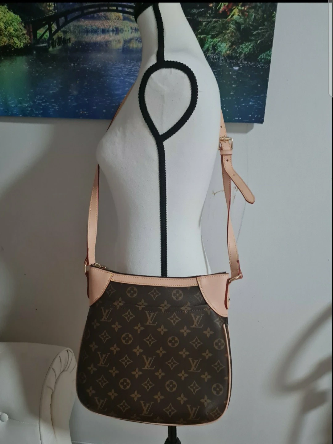 95Brown and tan designer crossbody bag with a front flap and adjustable strap. The bag has a brown canvas exterior with a monogram pattern and a light brown leather trim. The interior is a brown fabric. The bag features a single main compartment and an internal slip pocket. pleass contact seller for more details. thank you!