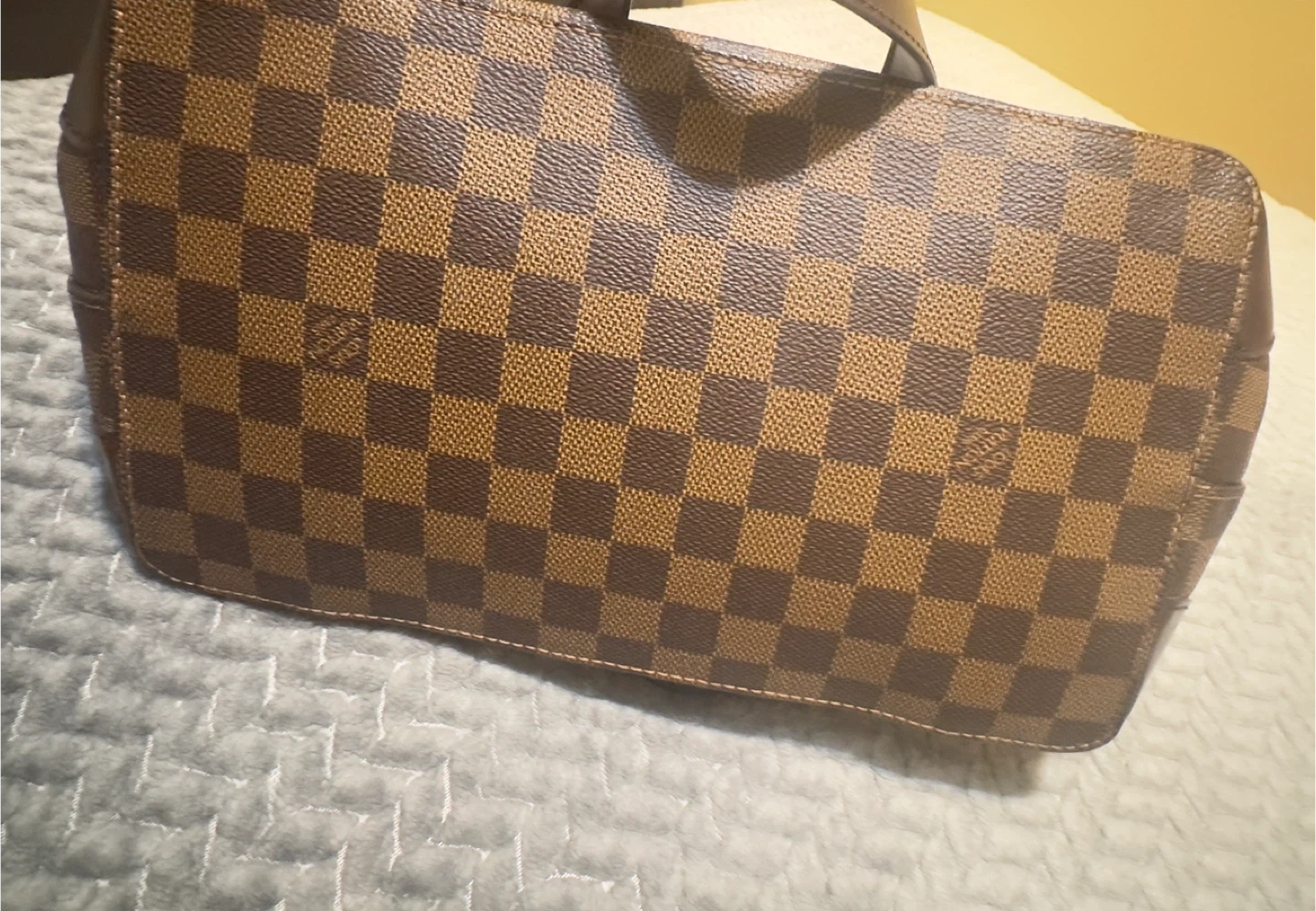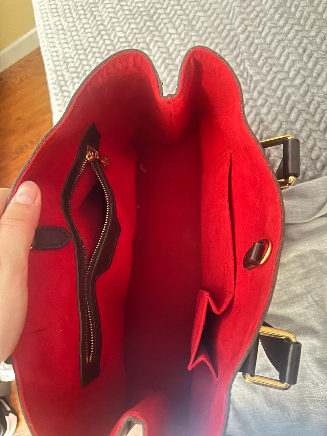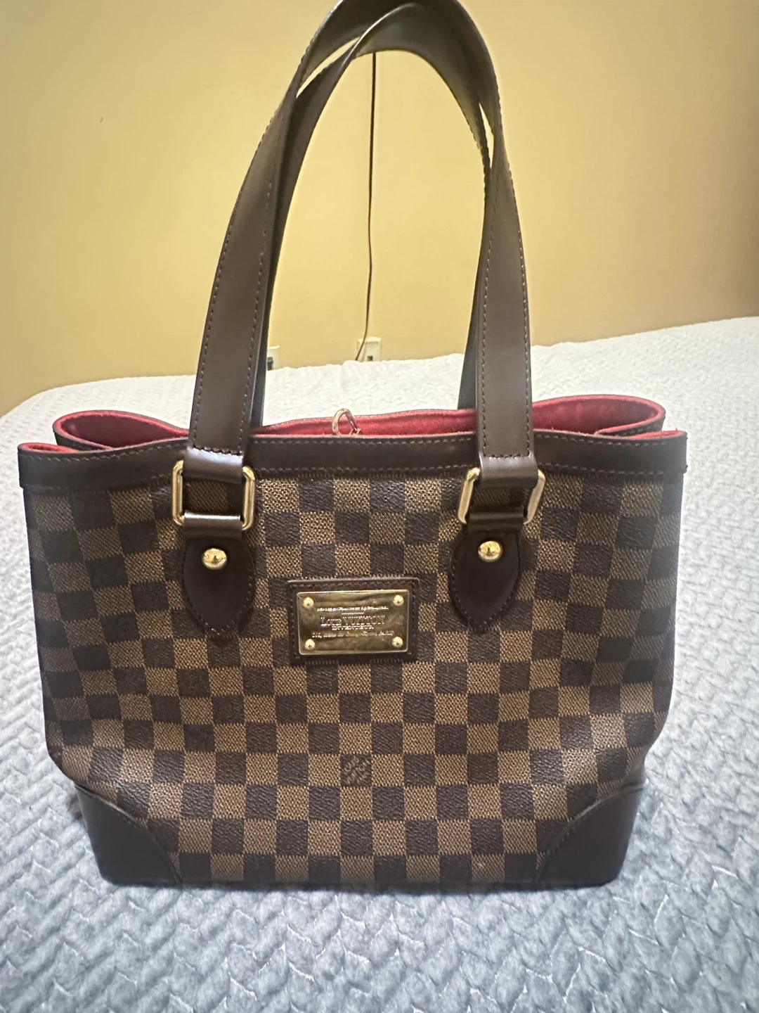 60Selling a Louis Vuitton Damier Ebene Verona PM handbag. It features a classic checkered pattern in brown tones with a red interior. This stylish bag is perfect for everyday use