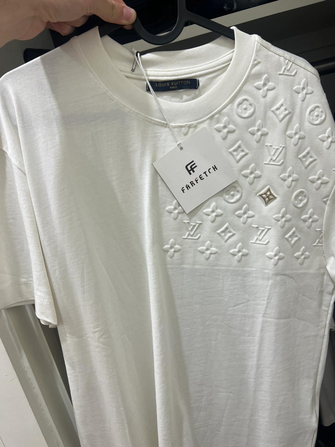 White Louis Vuitton t-shirt. Embossed logo detail. Short sleeves. Crew neck. Farfetch tag.