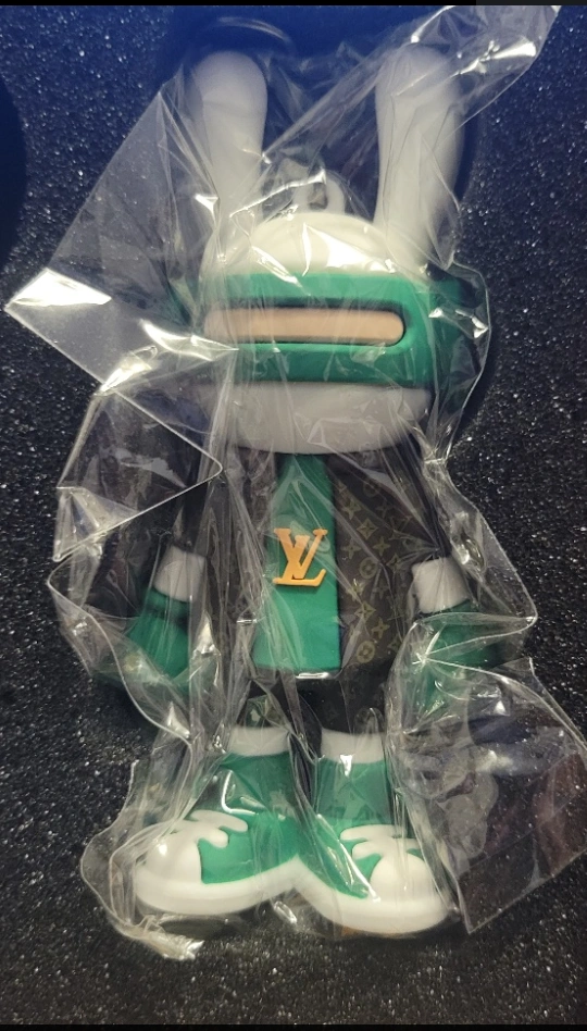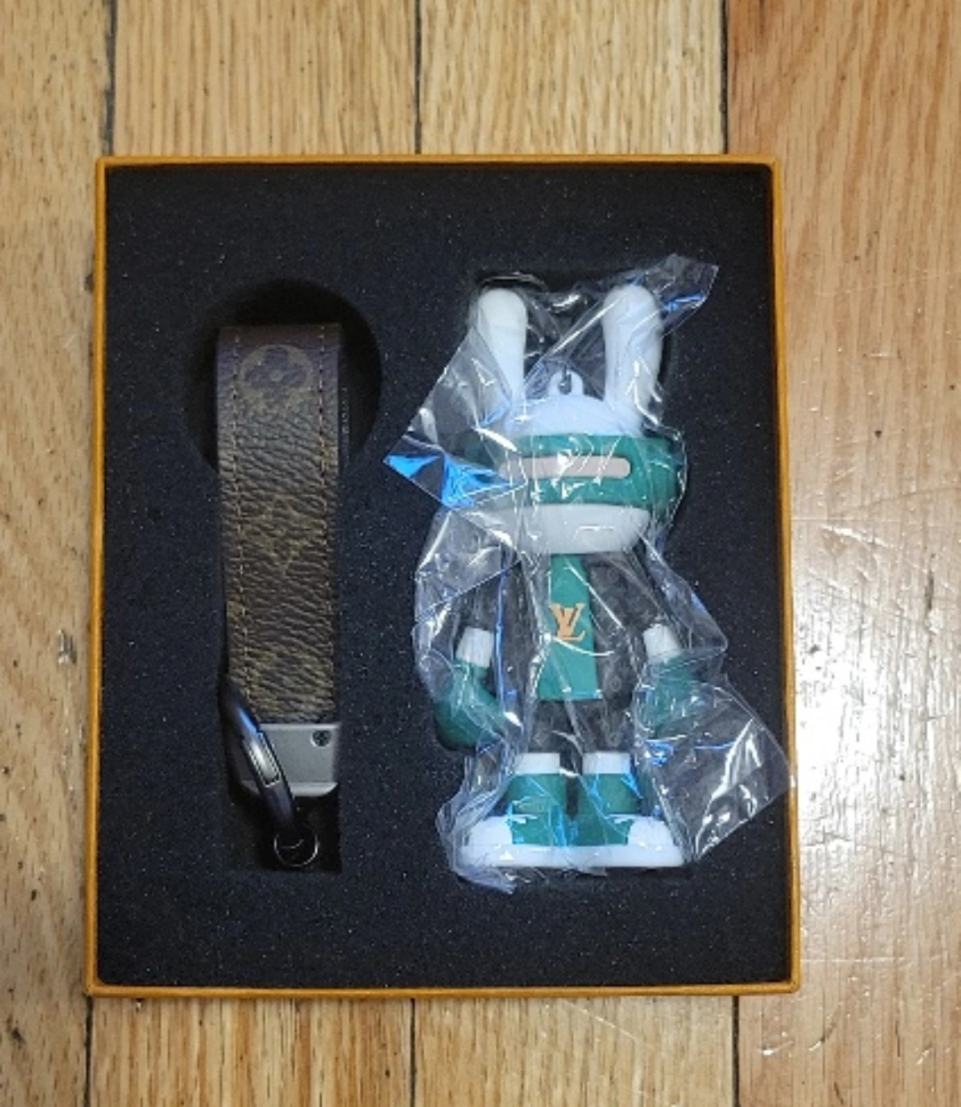 This is a Louis Vuitton key chain and Vivienne bag charm set. It comes with the original box. The key chain has the classic LV pattern. The Vivienne bag charm is still in its original packaging.