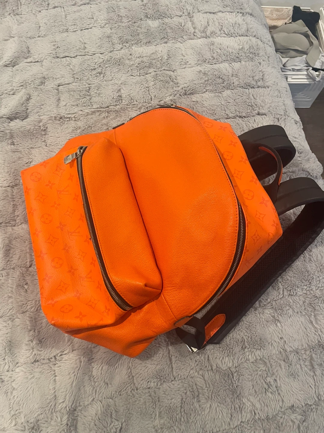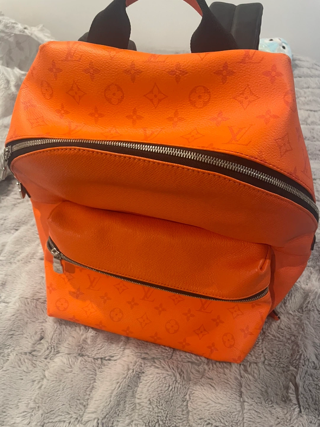 This is a Louis Vuitton patent leather travel backpack in orange. It's in very good condition and ready for your next adventure!