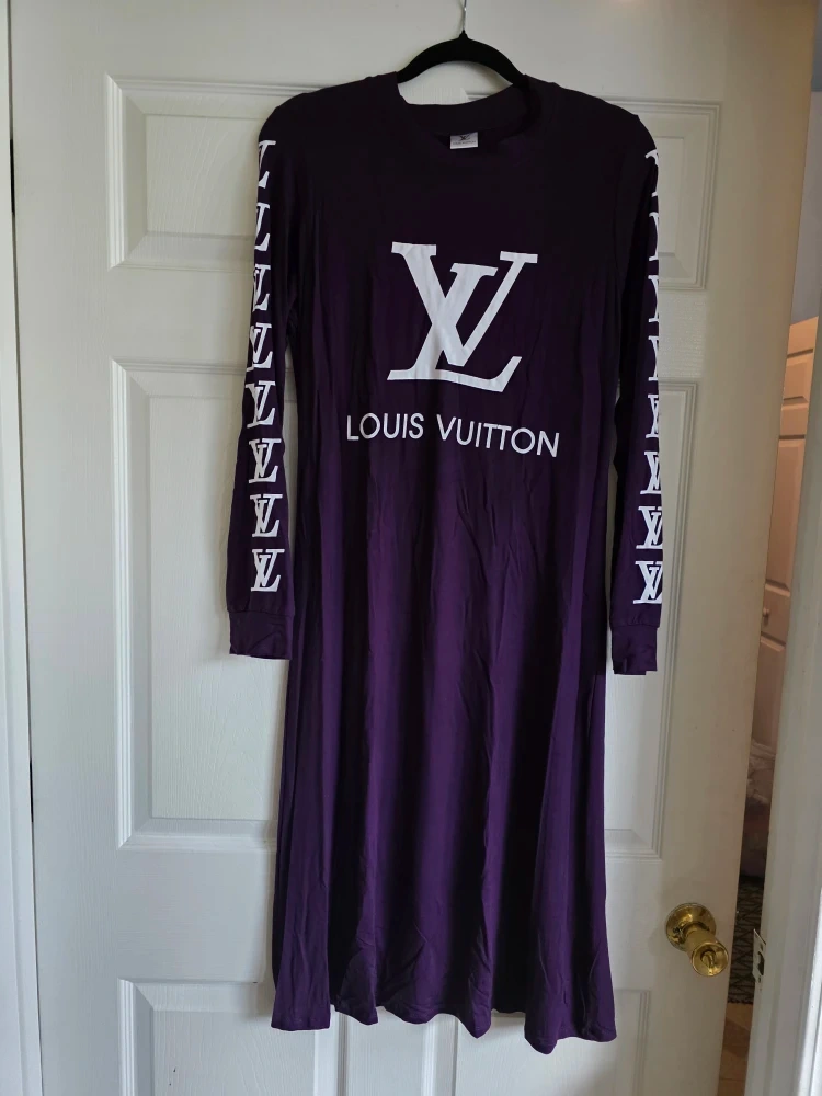 465Selling a stylish Louis Vuitton long sleeve dress in a beautiful purple color. It features the iconic LV logo prominently on the front and down the sleeves. Great for adding a touch of luxury to your wardrobe!