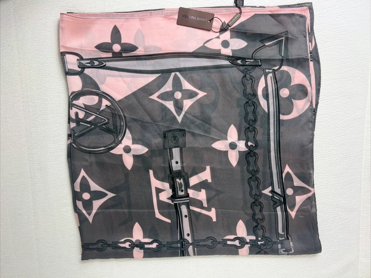 Selling a Louis Vuitton silk scarf features a stylish design with the iconic LV logos and belt detailing in black and pink. It's a beautiful accessory to elevate any outfit!