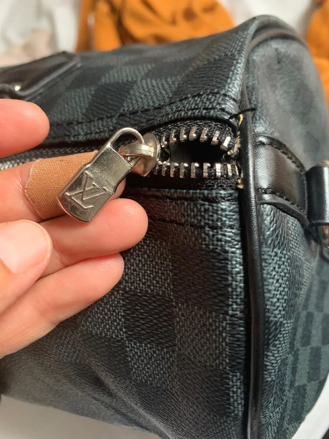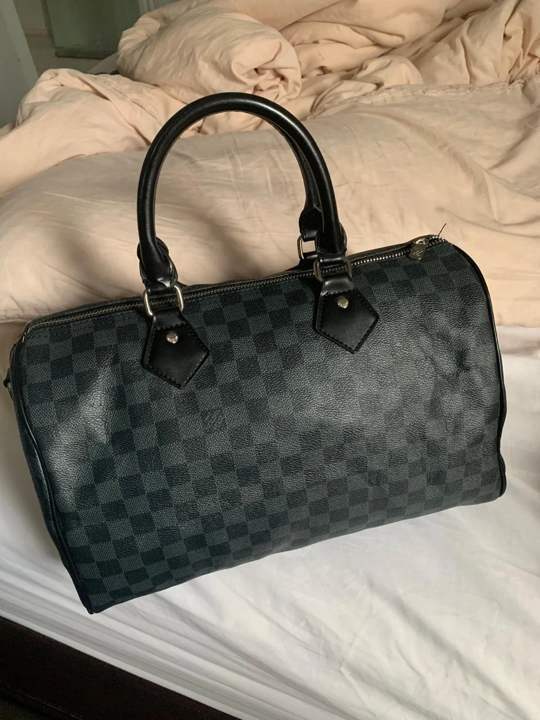Selling a Louis Vuitton Speedy Bandouliere 25 in Damier Ebene. It's a stylish and classic handbag, perfect for everyday use. The iconic checkered pattern and comfortable shoulder strap make it a versatile accessory. The zipper pull has the LV logo.