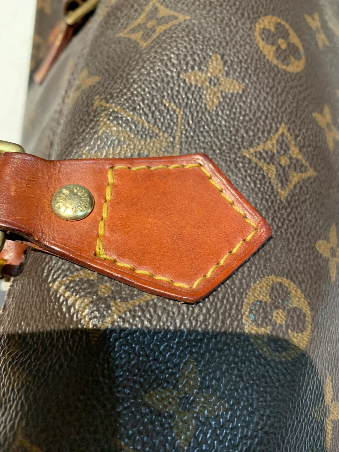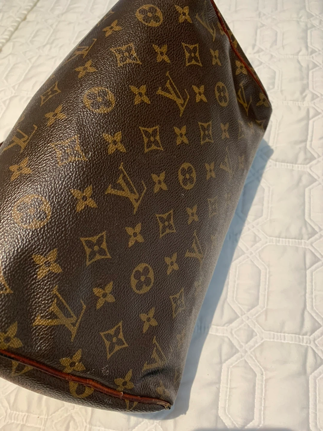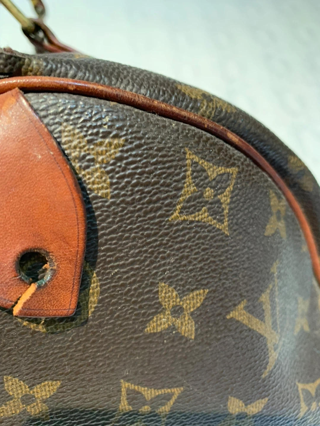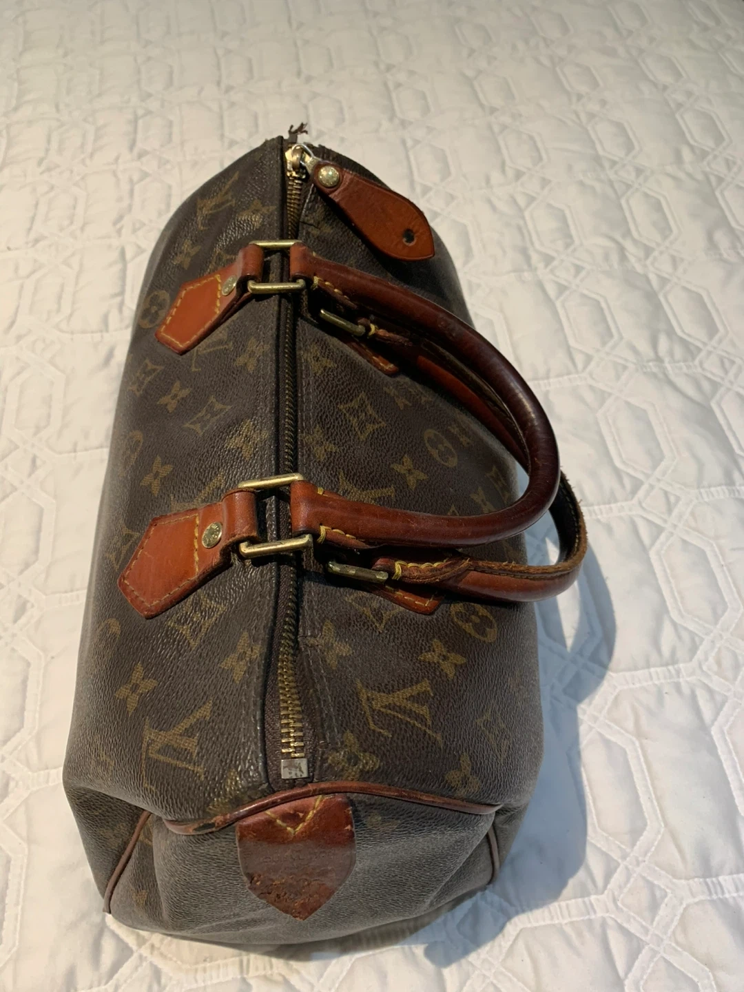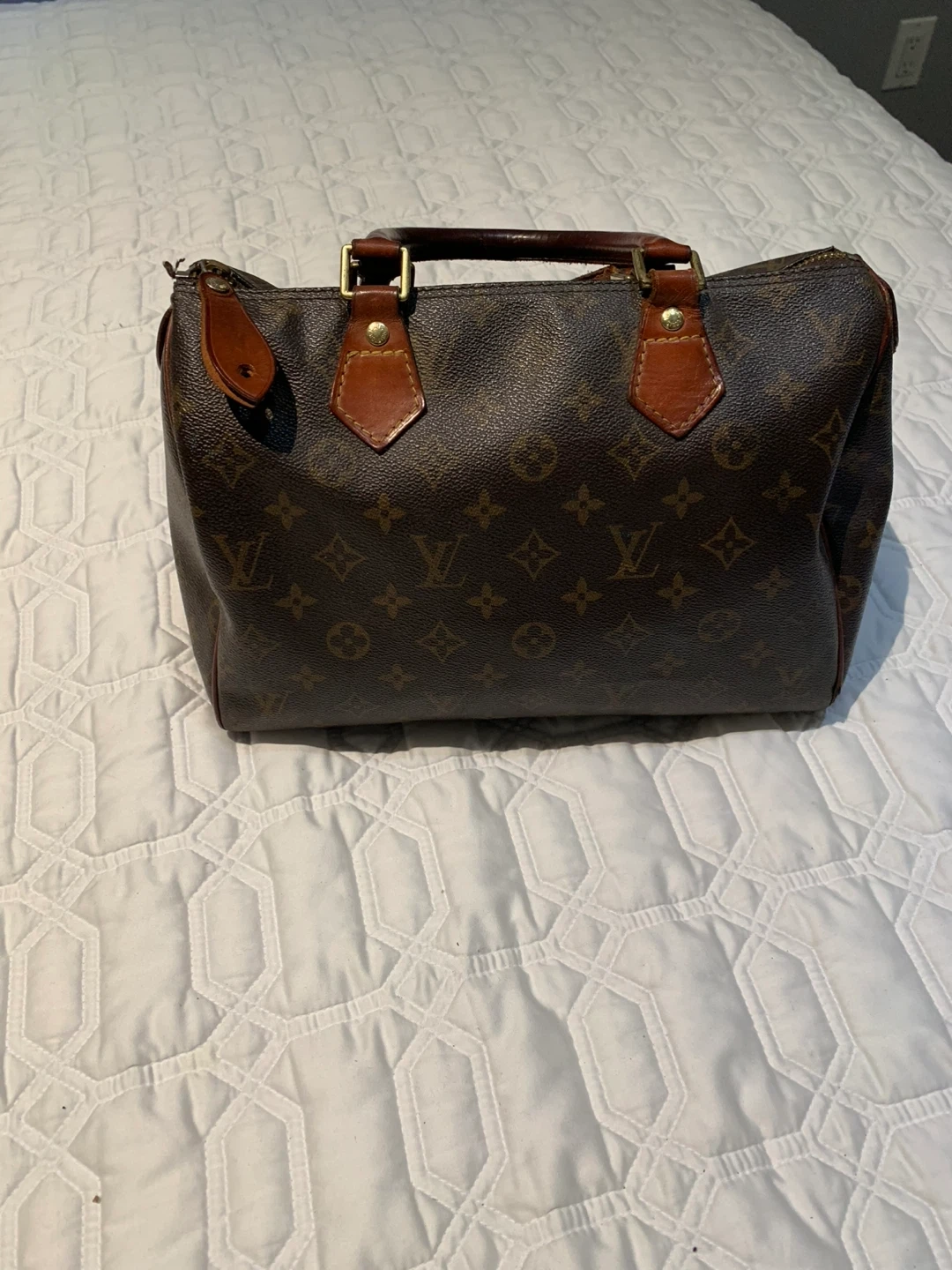Selling a Louis Vuitton Speedy handbag. It has the classic LV monogram pattern on a brown coated canvas. The handles and trim are made of leather. It's a stylish and timeless piece! Needs some restoration work