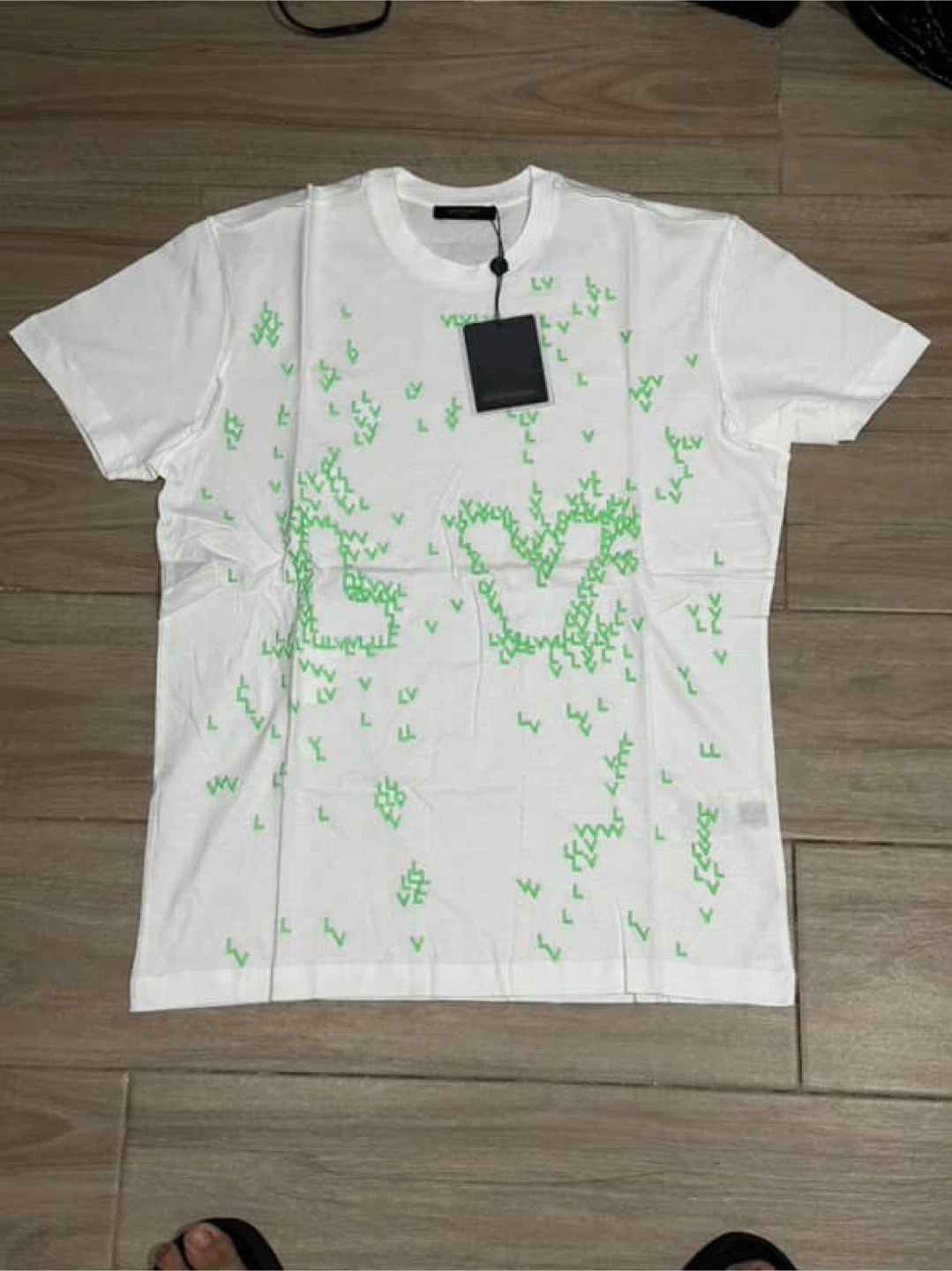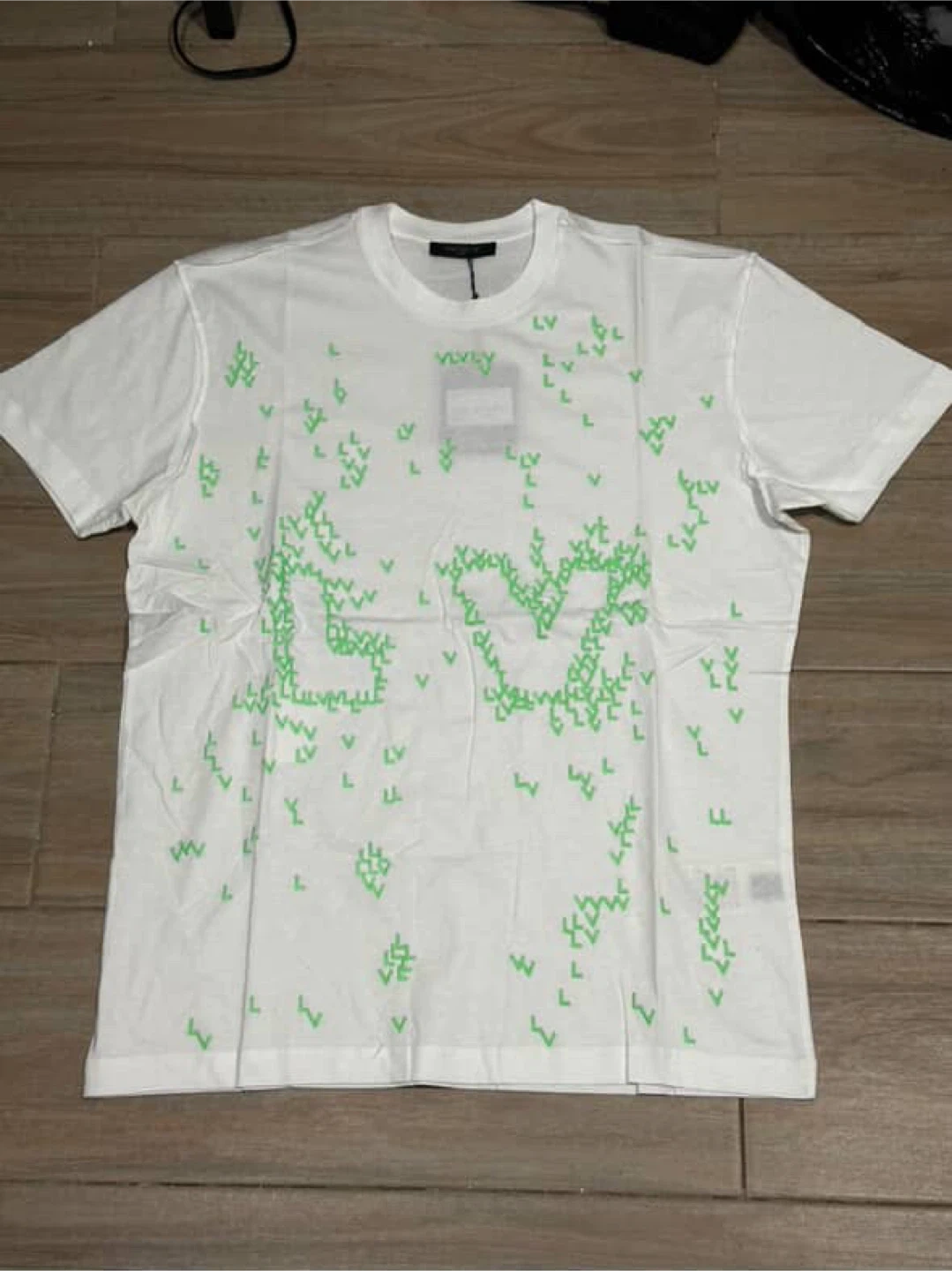 Selling a Louis Vuitton white t-shirt in size L. It's in new condition and has a cool design with green LV logos scattered throughout