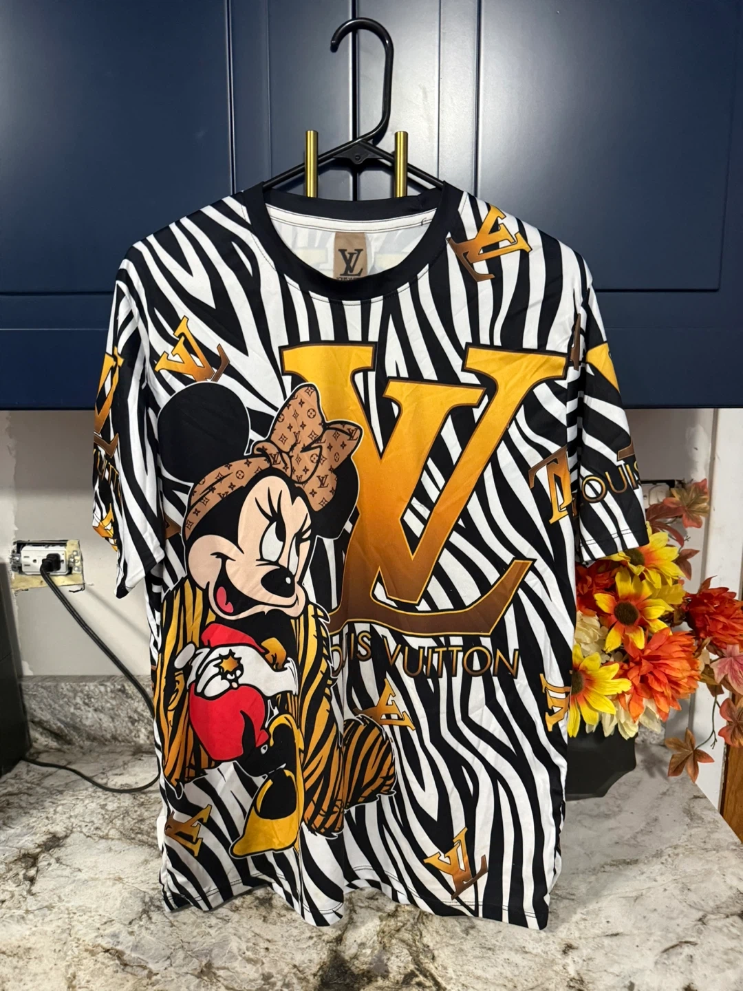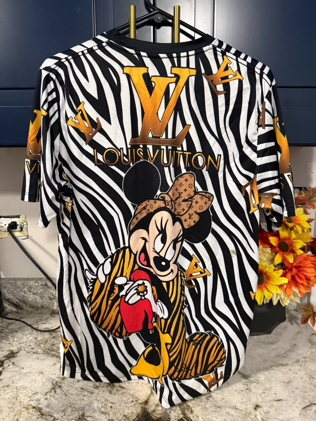 Not real brand Selling a Louis Vuitton x Disney T-shirt. The shirt features a zebra print with Louis Vuitton logos and a Minnie Mouse graphic. It's a unique and eye-catching piece!