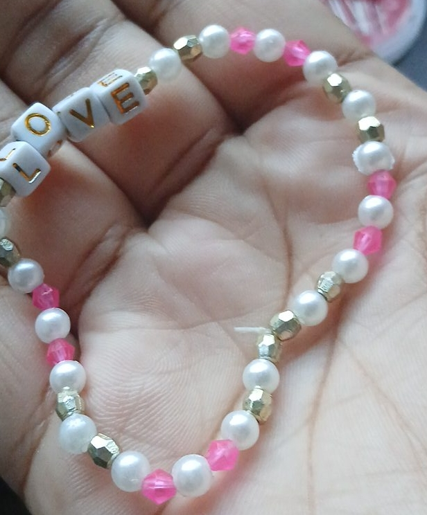 Cute beaded bracelet with "LOVE" spelled out in white and gold letter beads! Features pink, white, and gold beads. Perfect for adding a touch of sweetness to any outfit