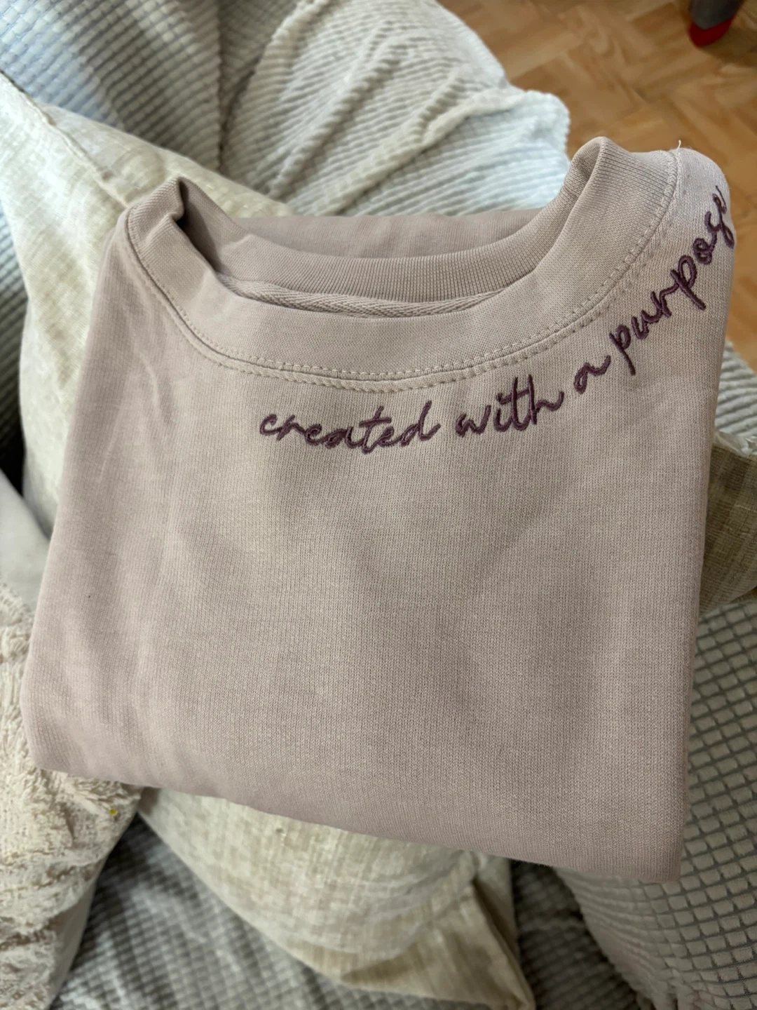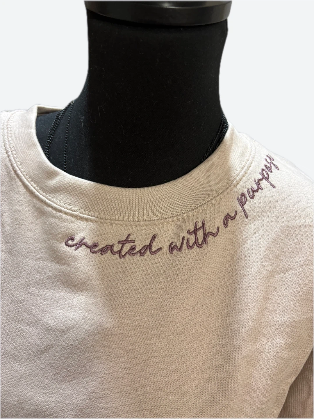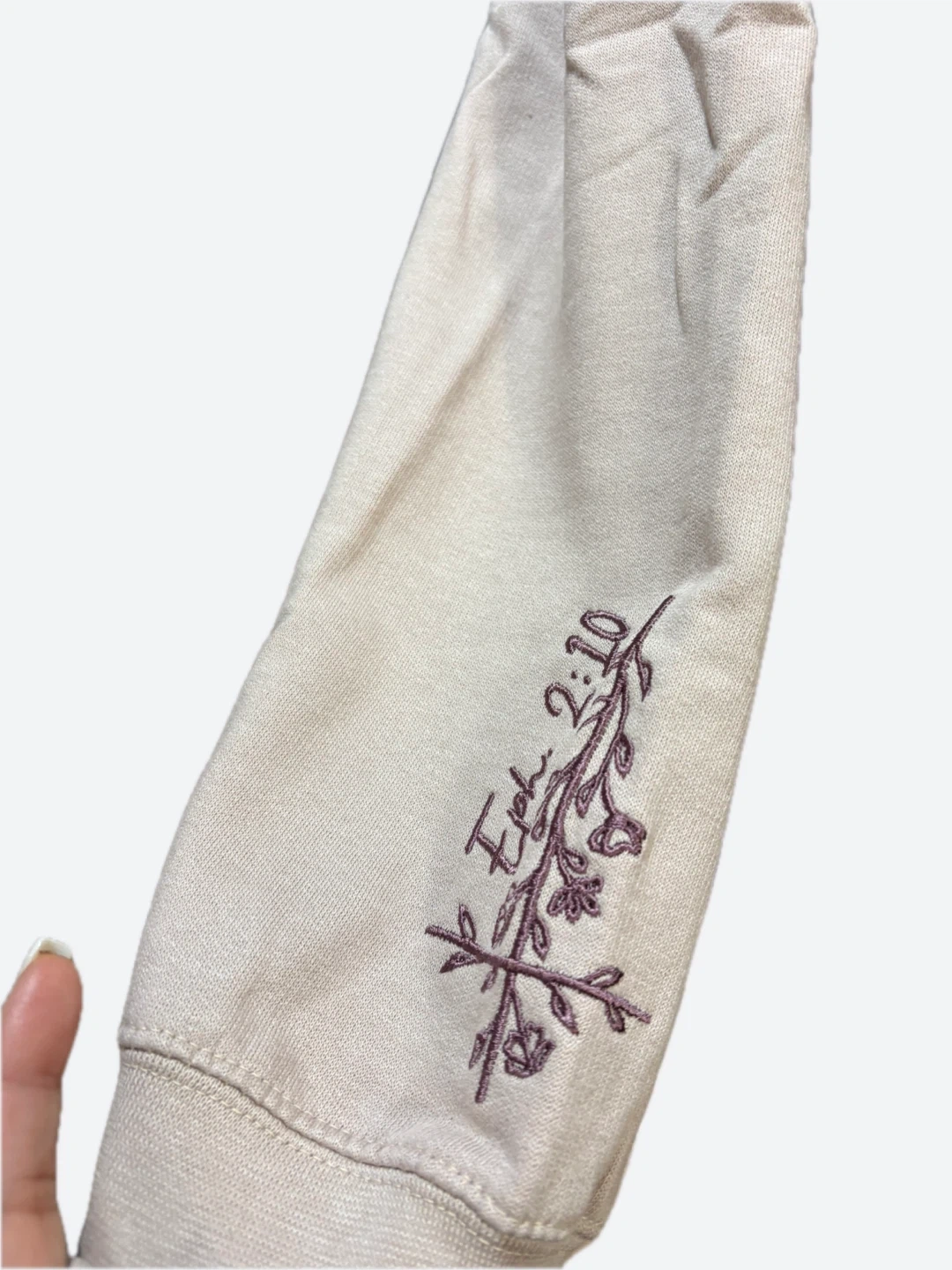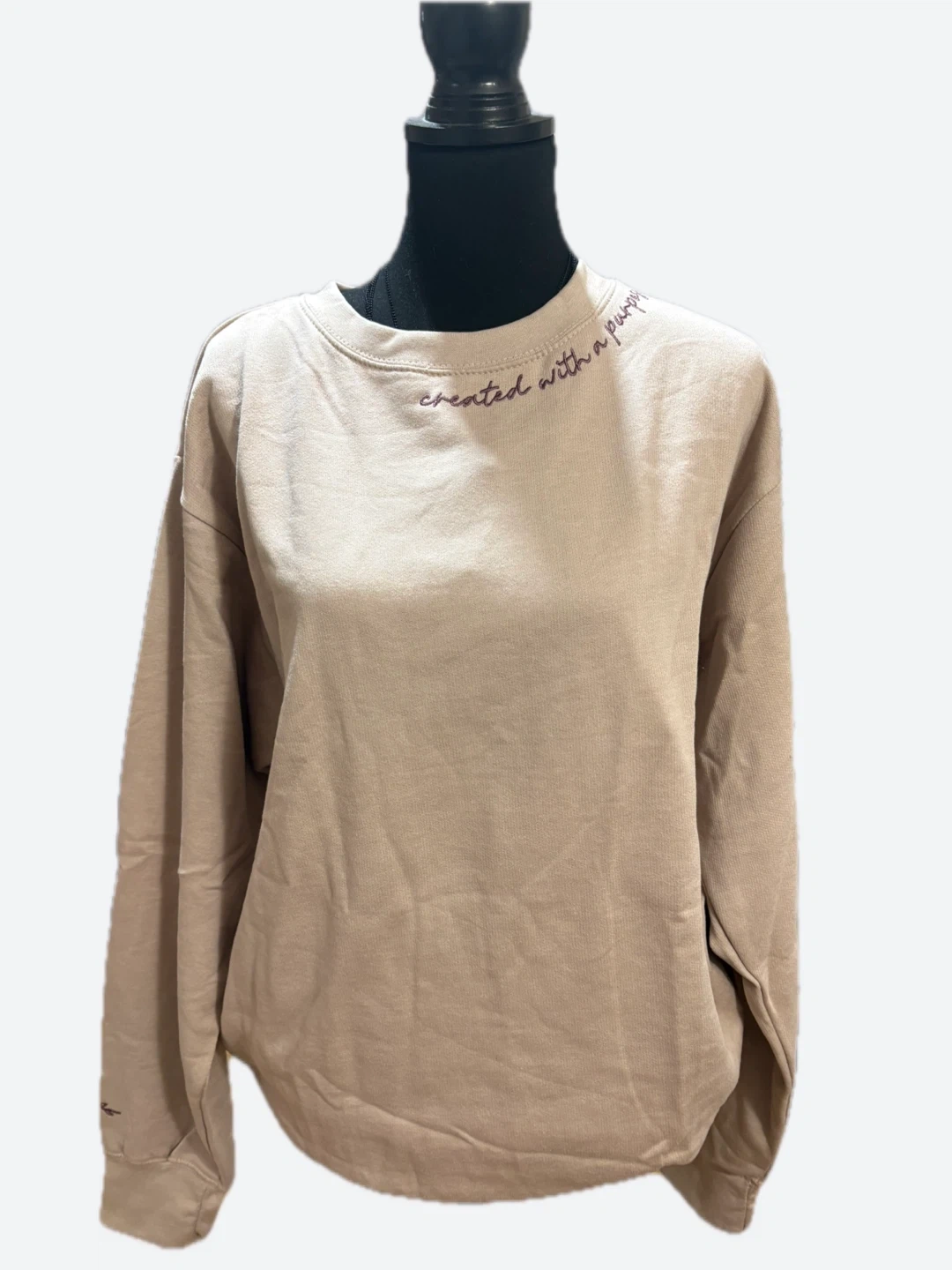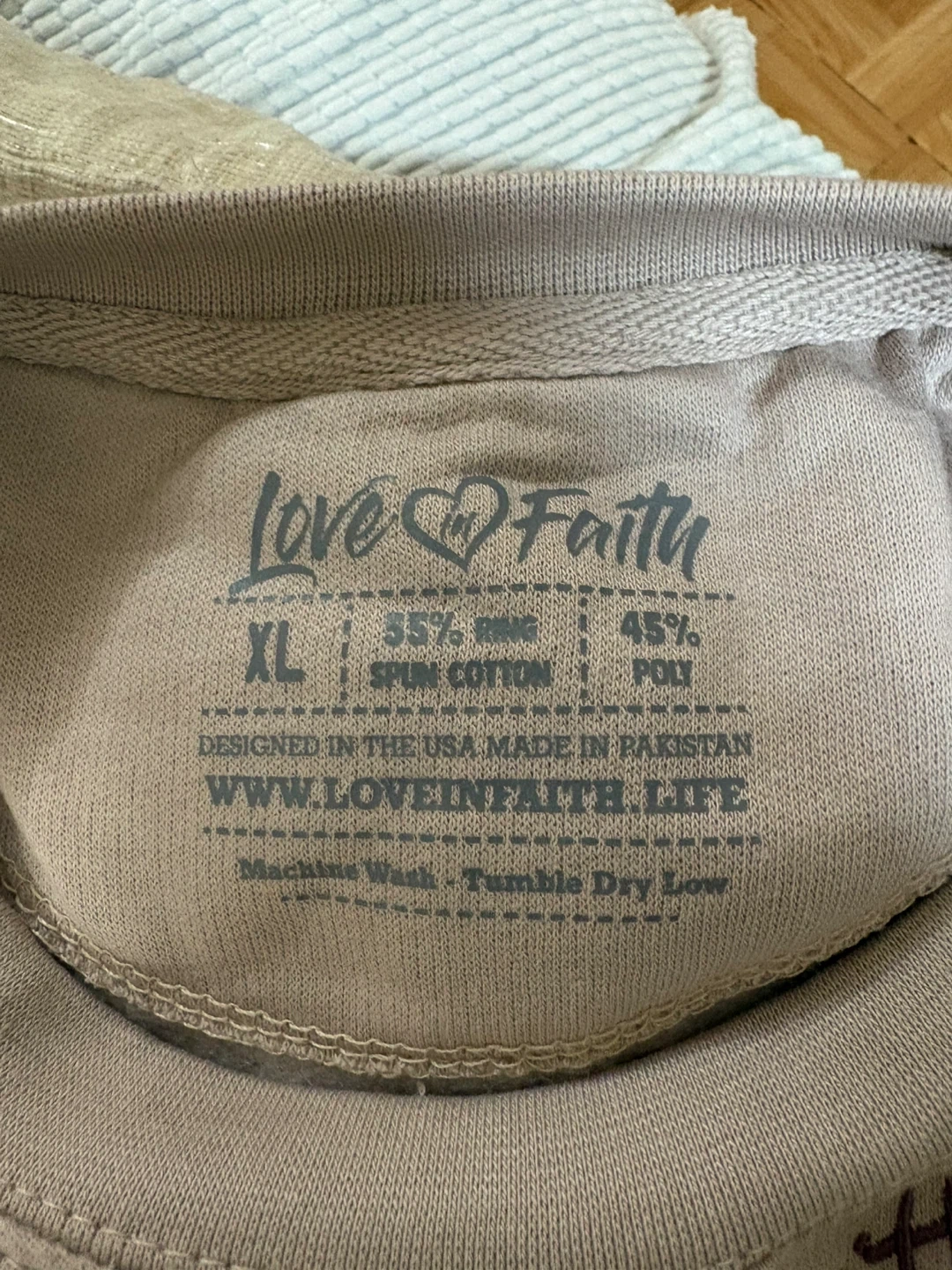 65Love & Faith sweatshirt in size XL. It's a light beige color with embroidered details. The material is 55% spun cotton and 45% poly