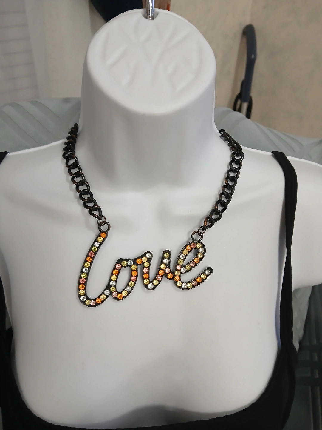 This is a beautiful necklace with the word "love" spelled out in rhinestones. It's in great condition and ready to wear