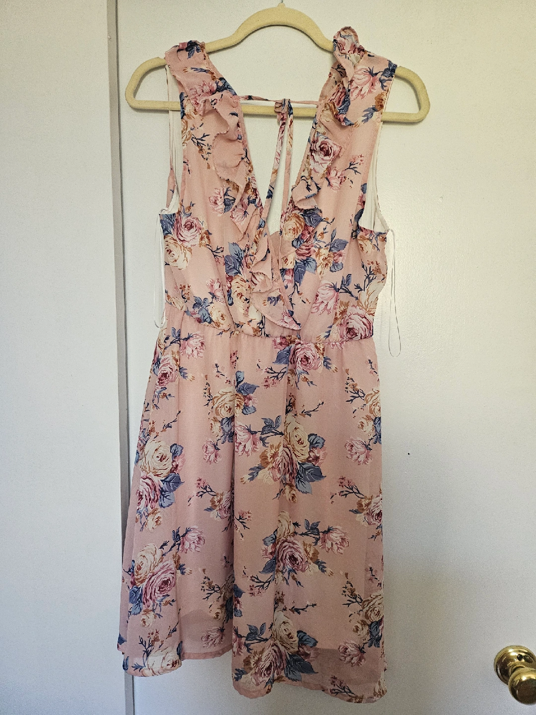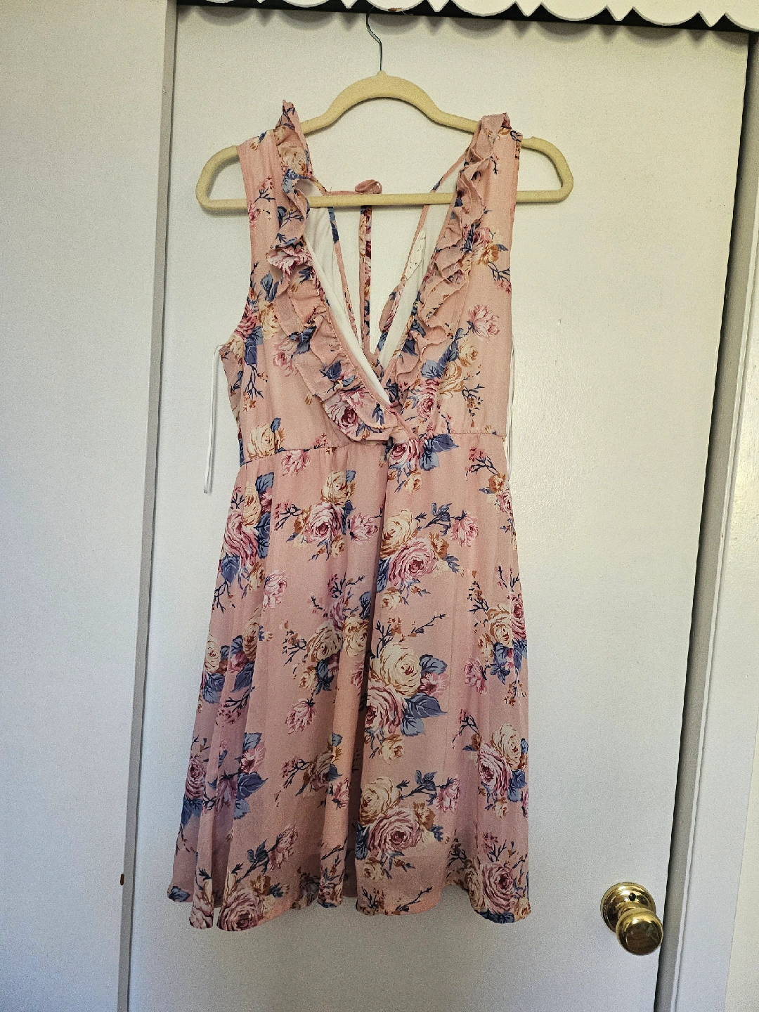 65Selling a Love Tree dress in size large. It features a beautiful floral pattern and a flattering V-neck design with ruffles. Perfect for a summer day or a special occasion!