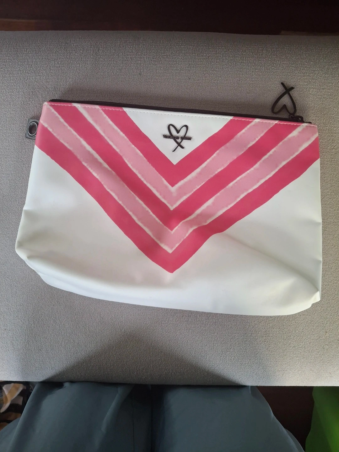 60Cute Love Victoria cosmetic bag with a pink and white chevron pattern. Perfect for storing your makeup or toiletries!