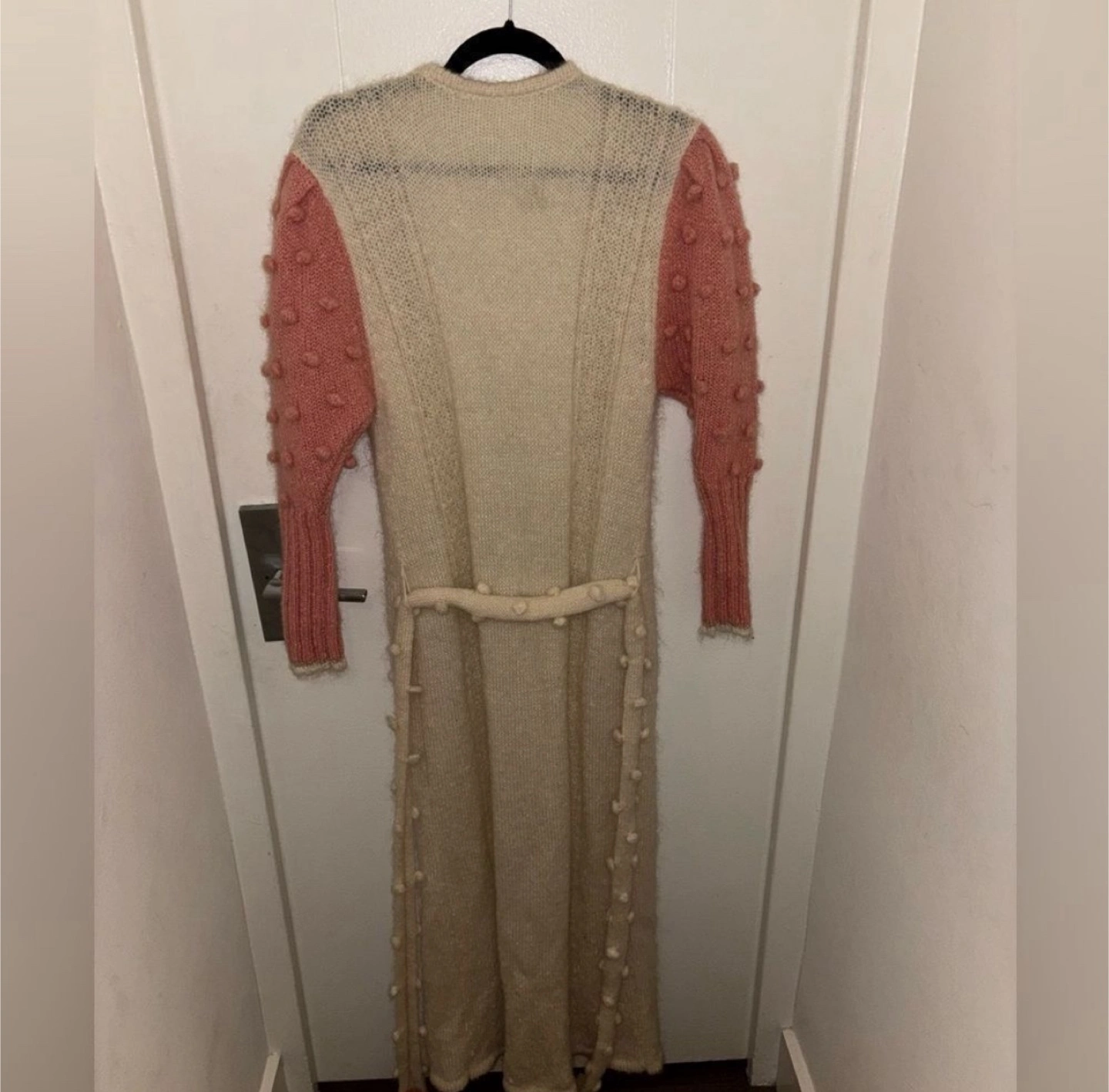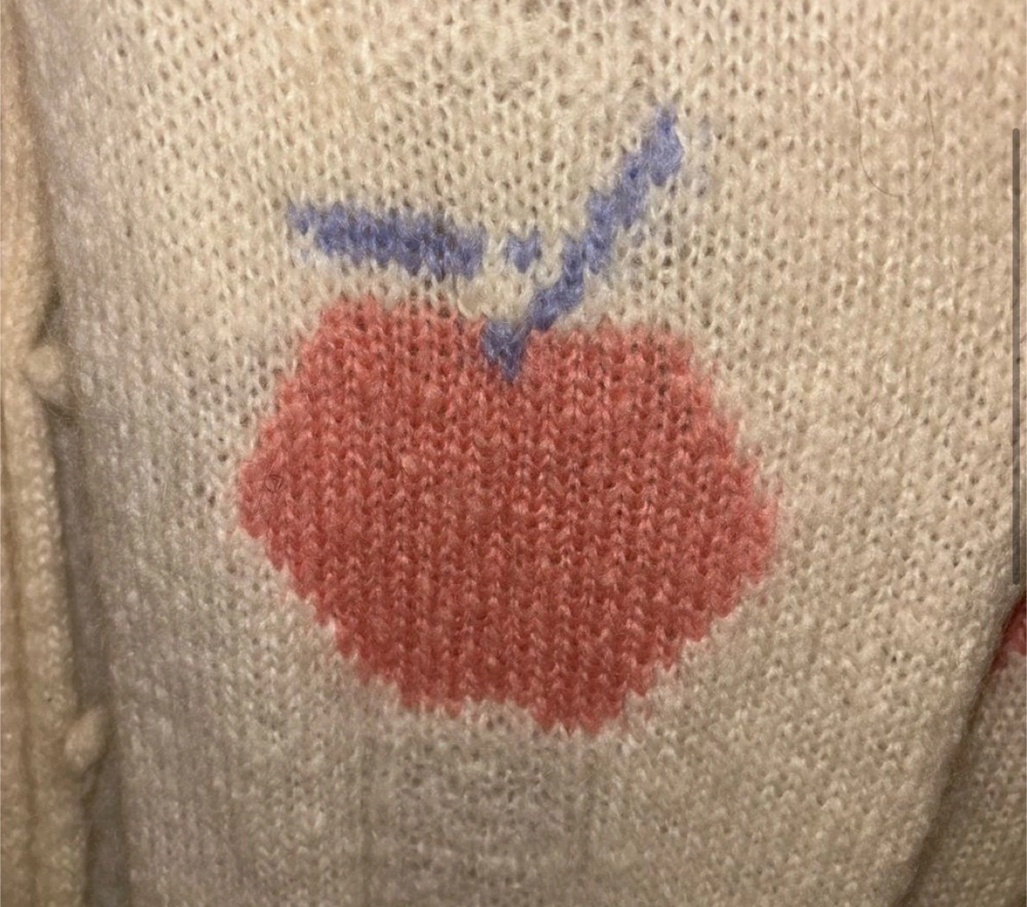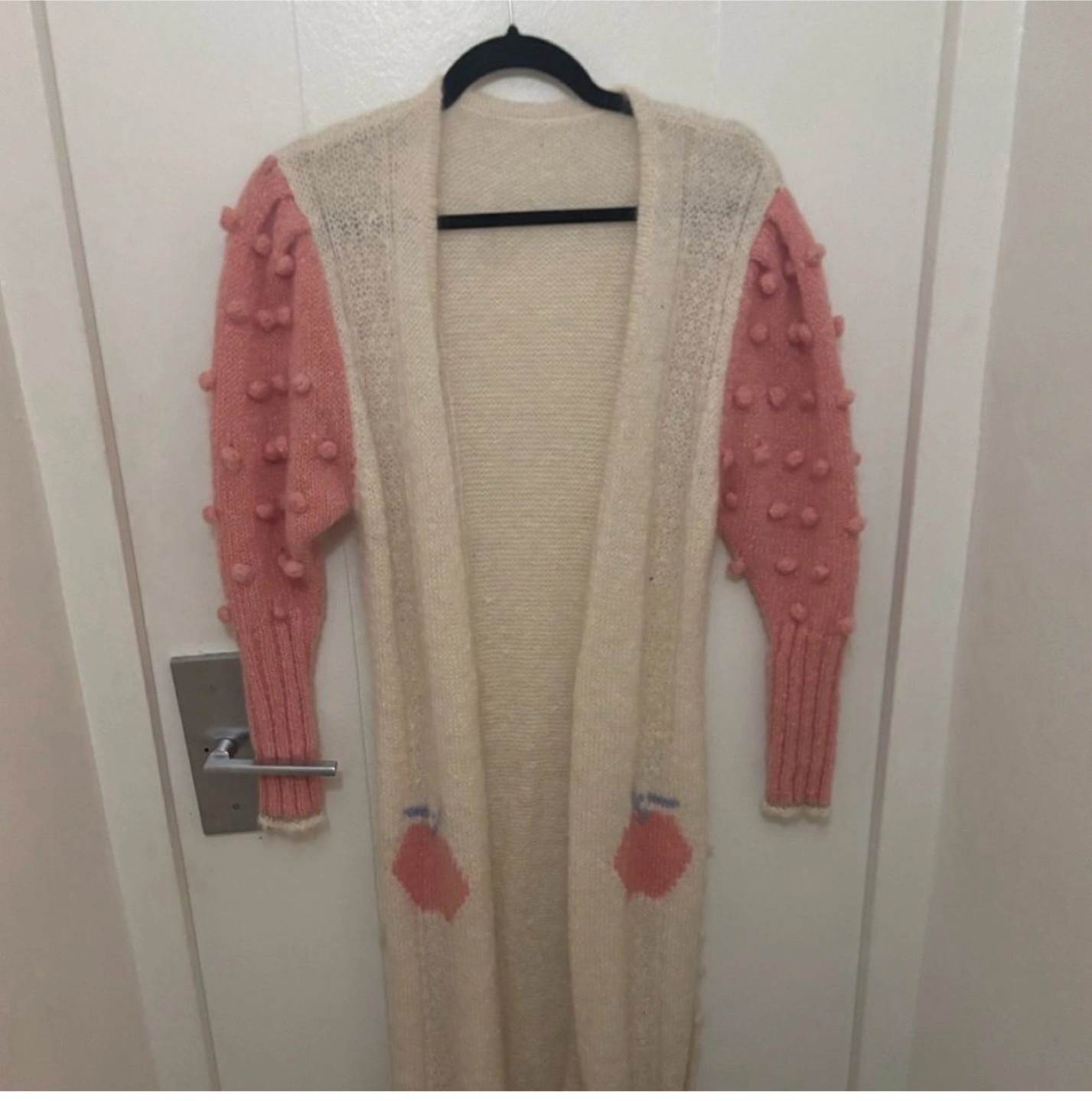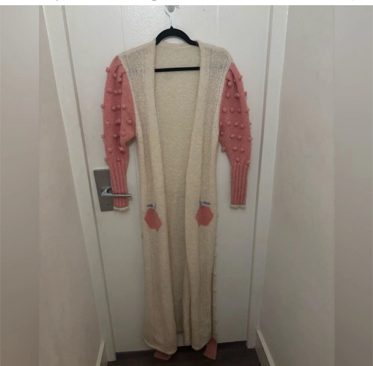 This is a long cardigan with apple graphic. It's a cream and peach color with pom pom detailing on the sleeves Mohair blend