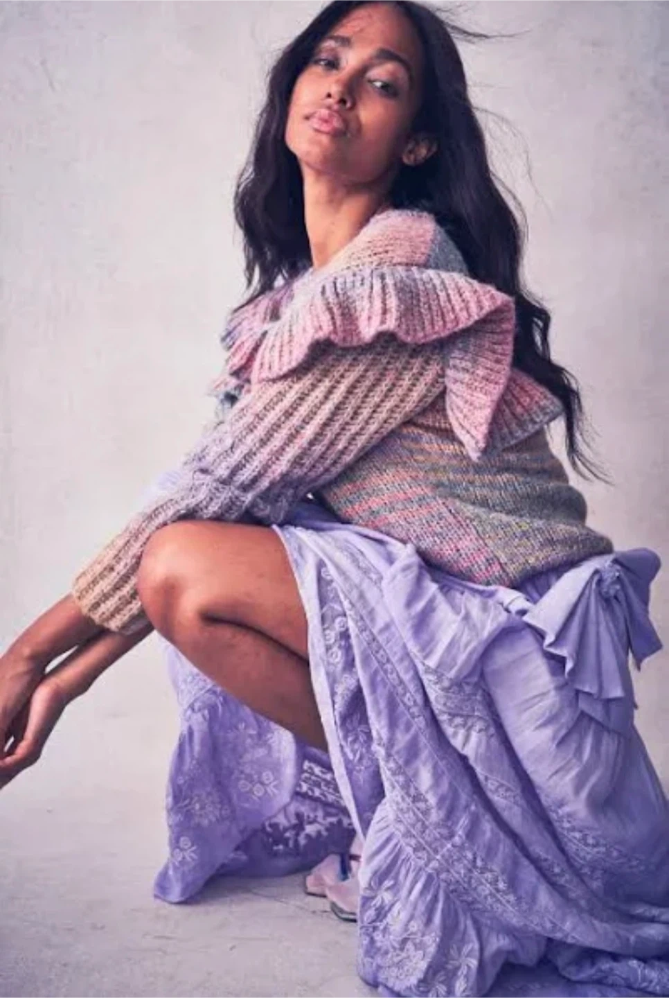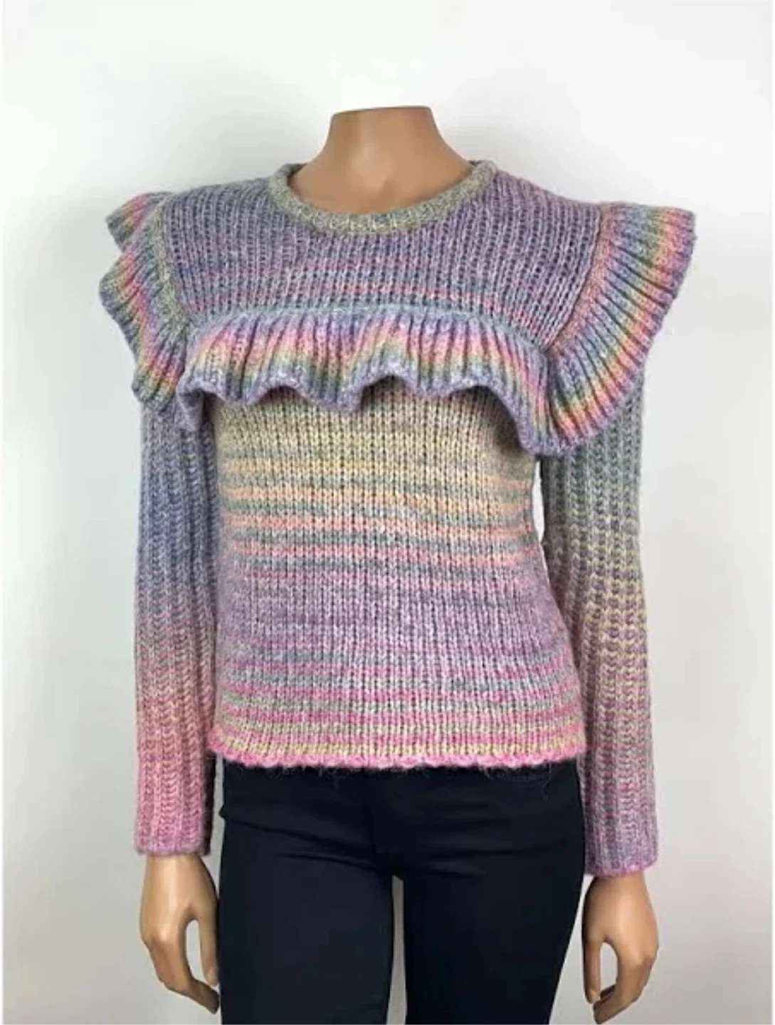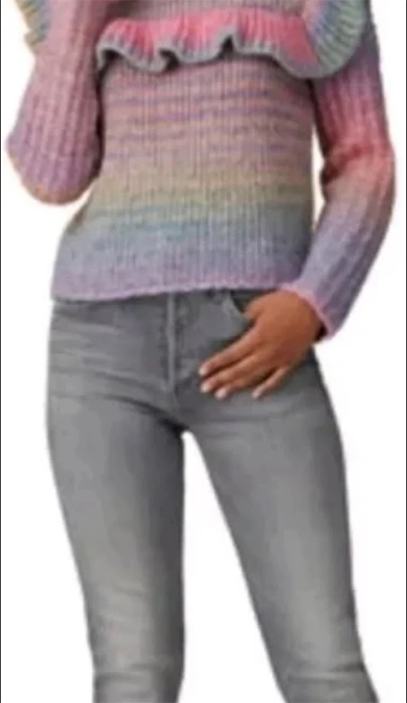 This LoveShackFancy sweater features a beautiful rainbow knit design with charming ruffle details. It's perfect for adding a touch of whimsy to your wardrobe. The sweater appears to be in great condition and ready for a new home!