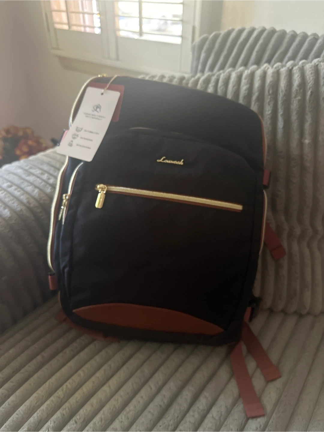 This is a Lovevook diaper bag backpack in black and brown. It appears to be in good condition and ready for a new home! It has gold zippers and a tag still attached.
