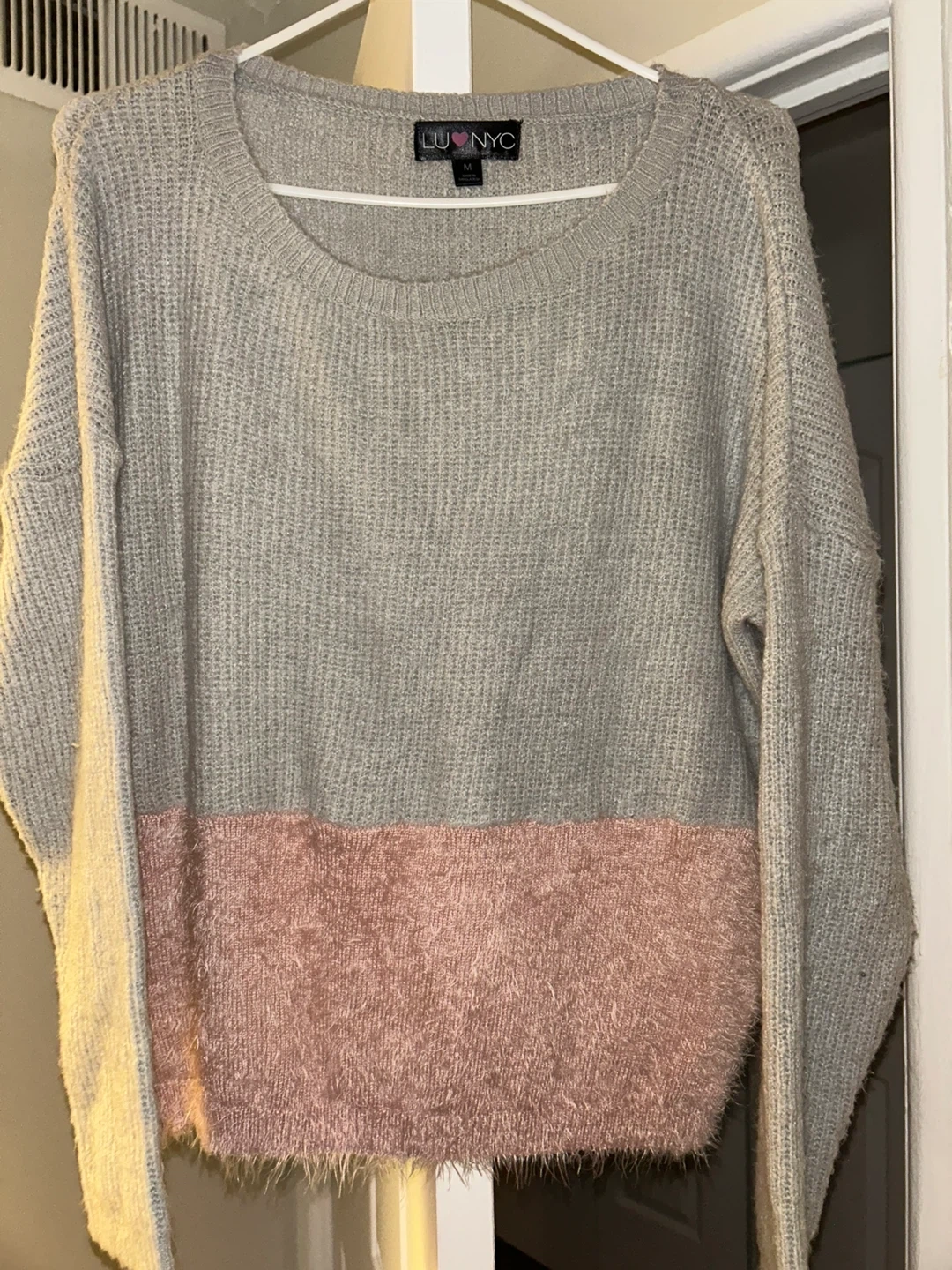 Selling a cute LU NYC sweater in size medium! It's gray on top and has a fuzzy pink accent at the bottom. Perfect for staying cozy and stylish.