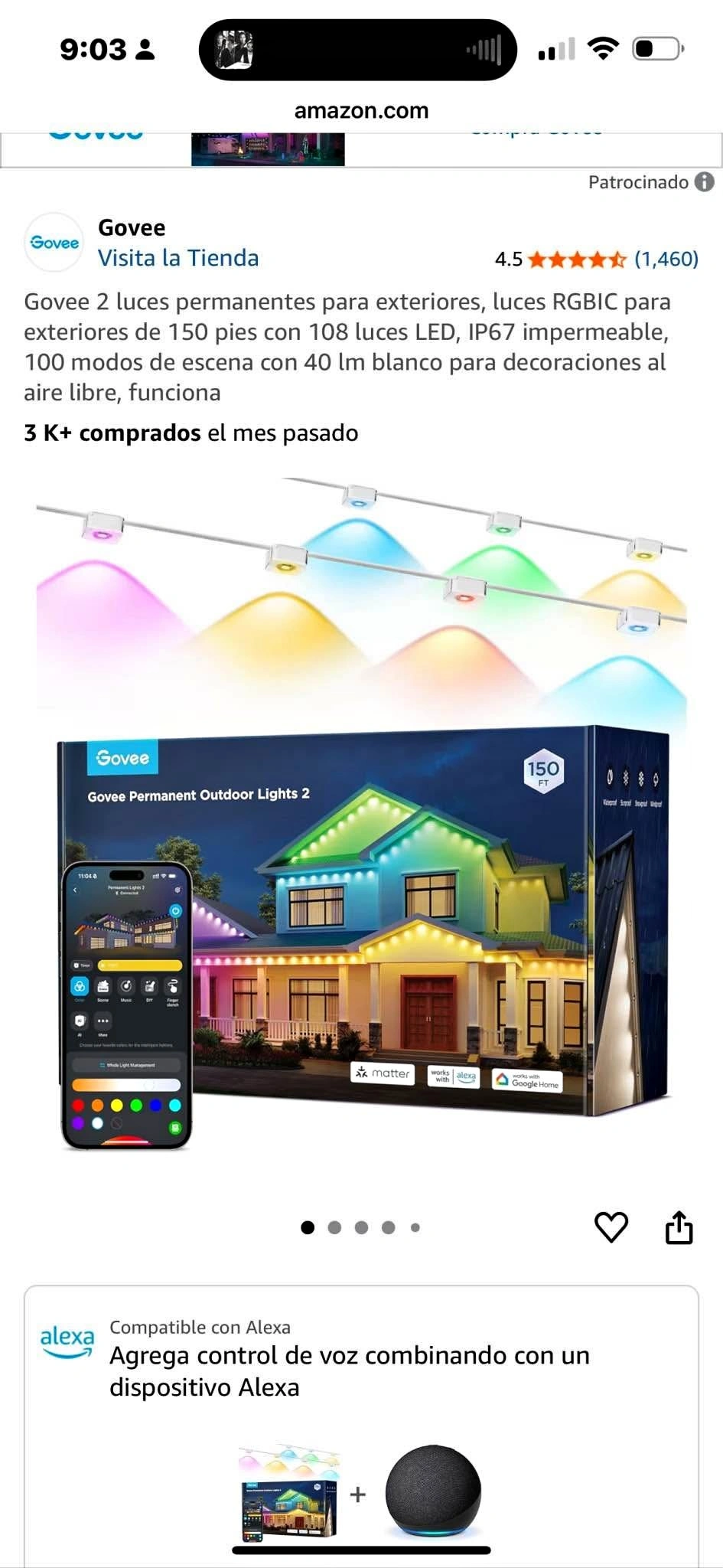 10Govee 2 luces permanentes para exteriores, luces RGBIC para exteriores de 150 pies con 108 luces LED, IP67 impermeable, 100 modos de escena con 40 lm blanco para decoraciones al aire libre.