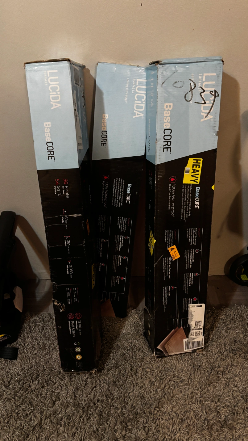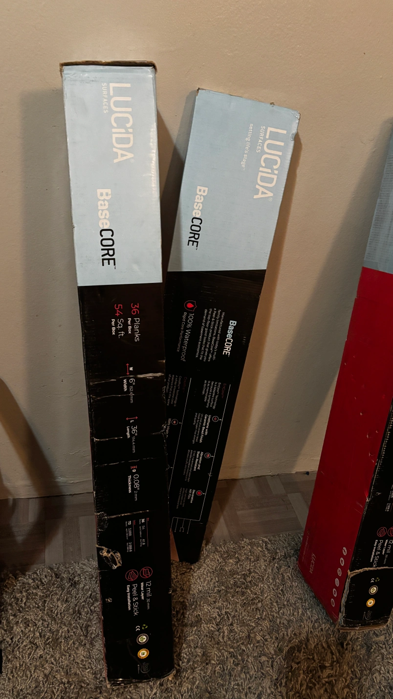 Selling LUCIDA SURFACES BaseCore flooring. Each box contains 36 planks, covering 54 sq ft. These are peel and stick vinyl floor tiles for DIY installation. They are 100% waterproof and have a 0.08" thickness
