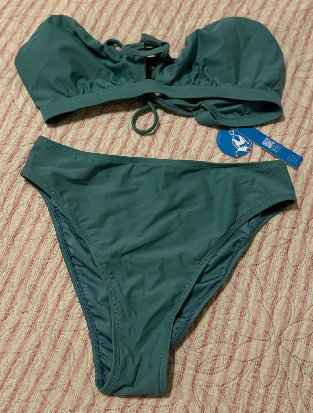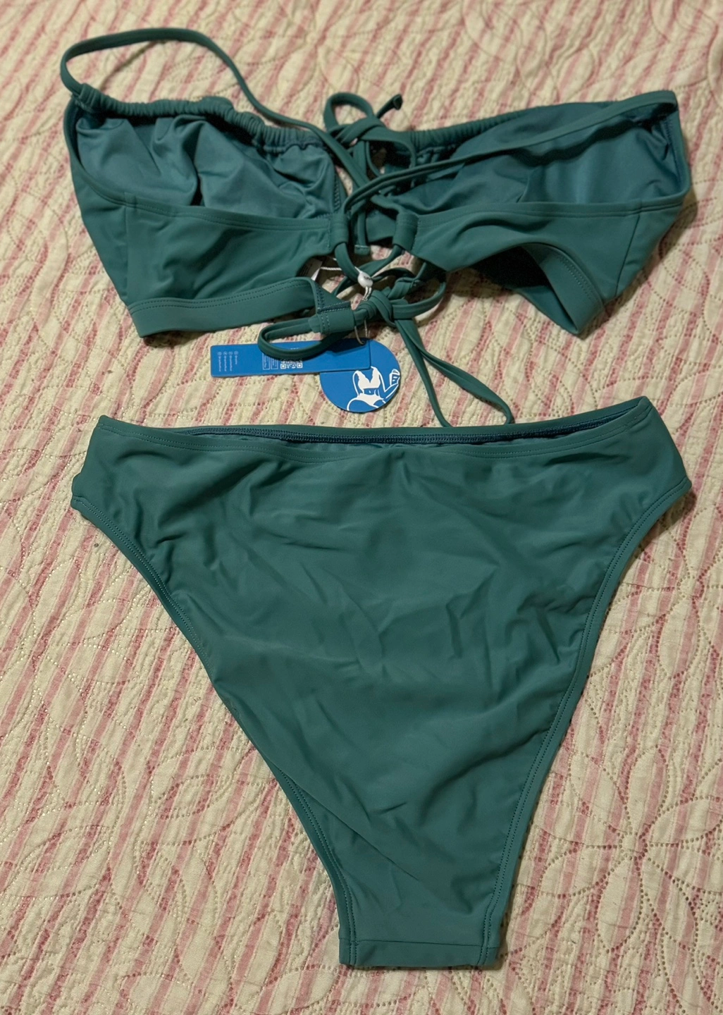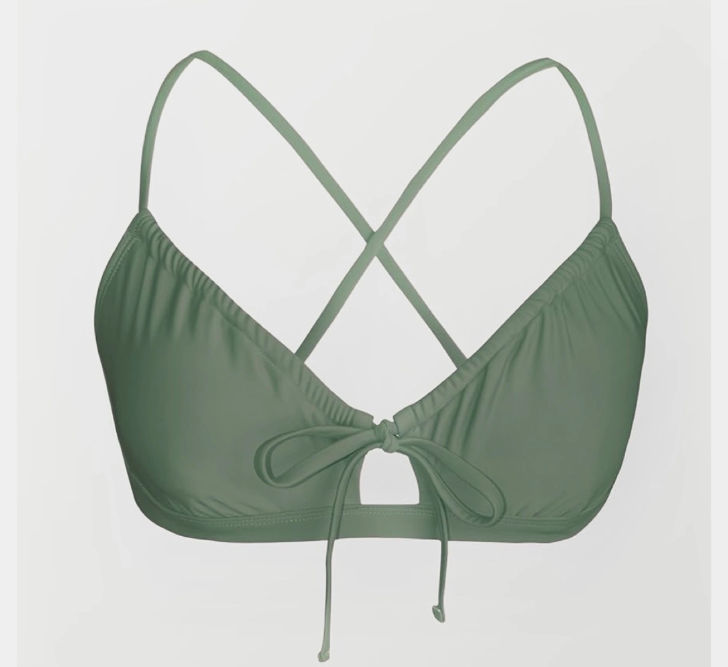 New Luli Fama bikini. Sage green color. High-waisted bottoms. Adjustable straps. Top ties in the front and back. Perfect for summer.