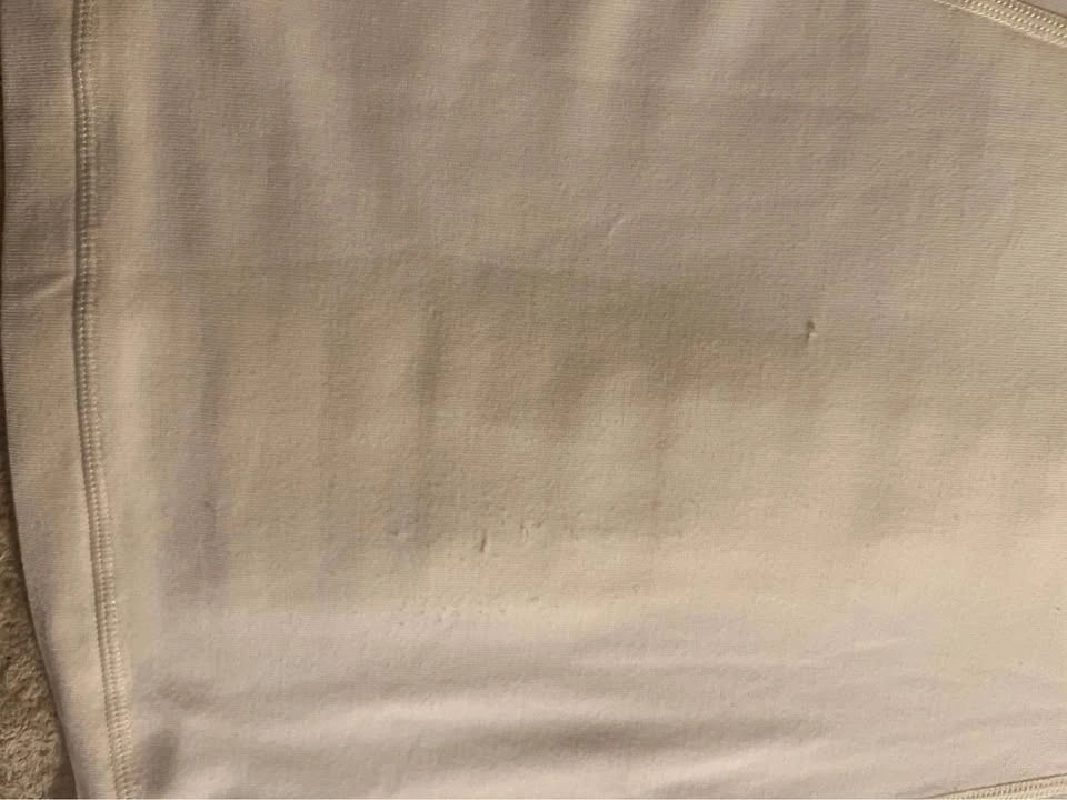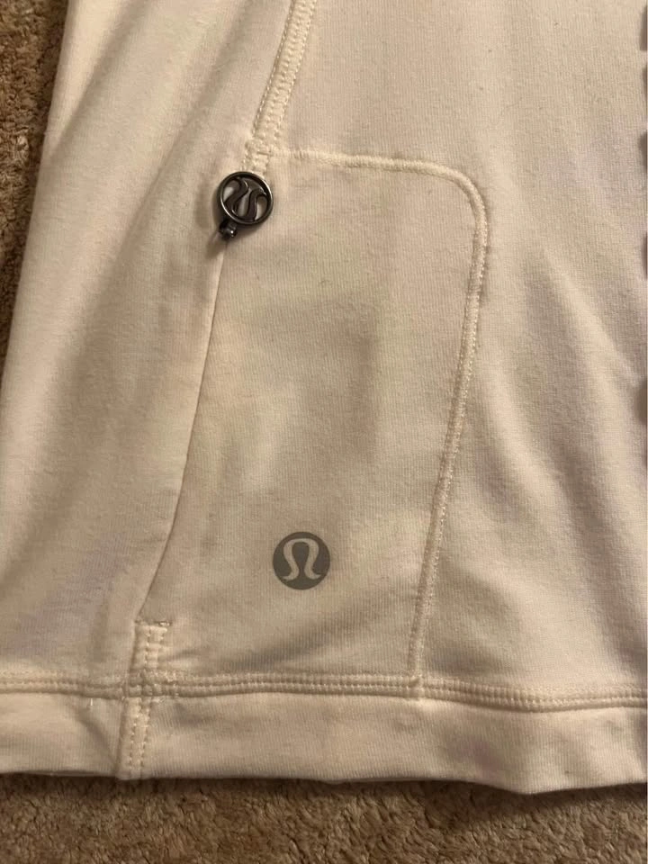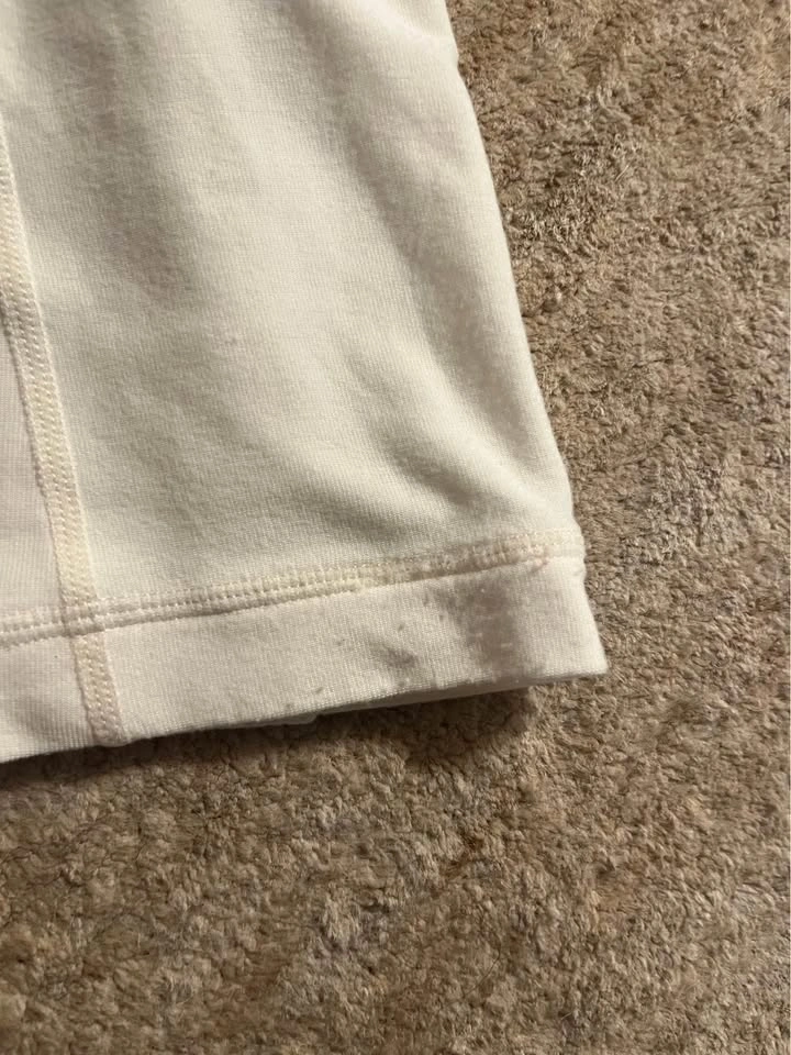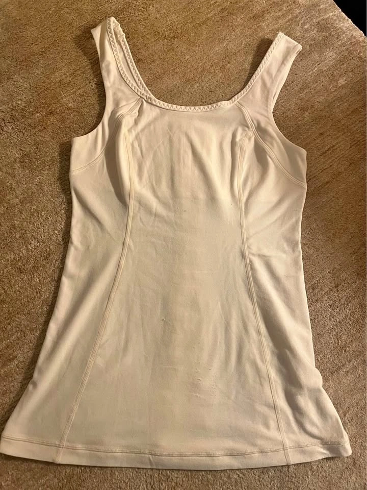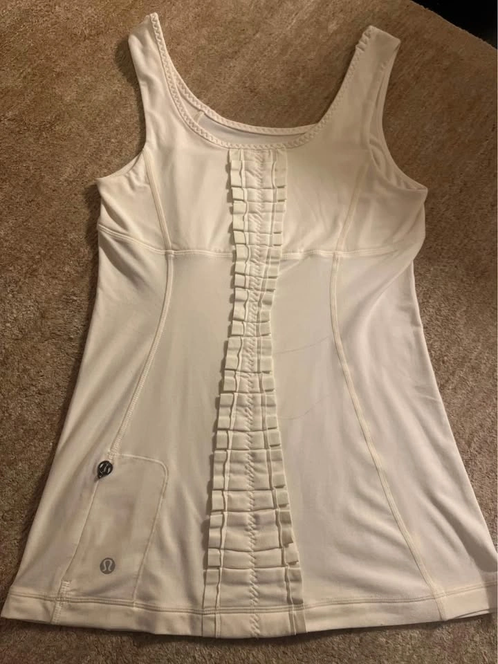Very pale butter colored Lycra tank with ruffled detail and pocket on back. Size 6 Slight pilling on bottom right side at hem and on center panel at bottom area as per the photos. No stains and color is consistent throughout. Photo is a bit deceiving.