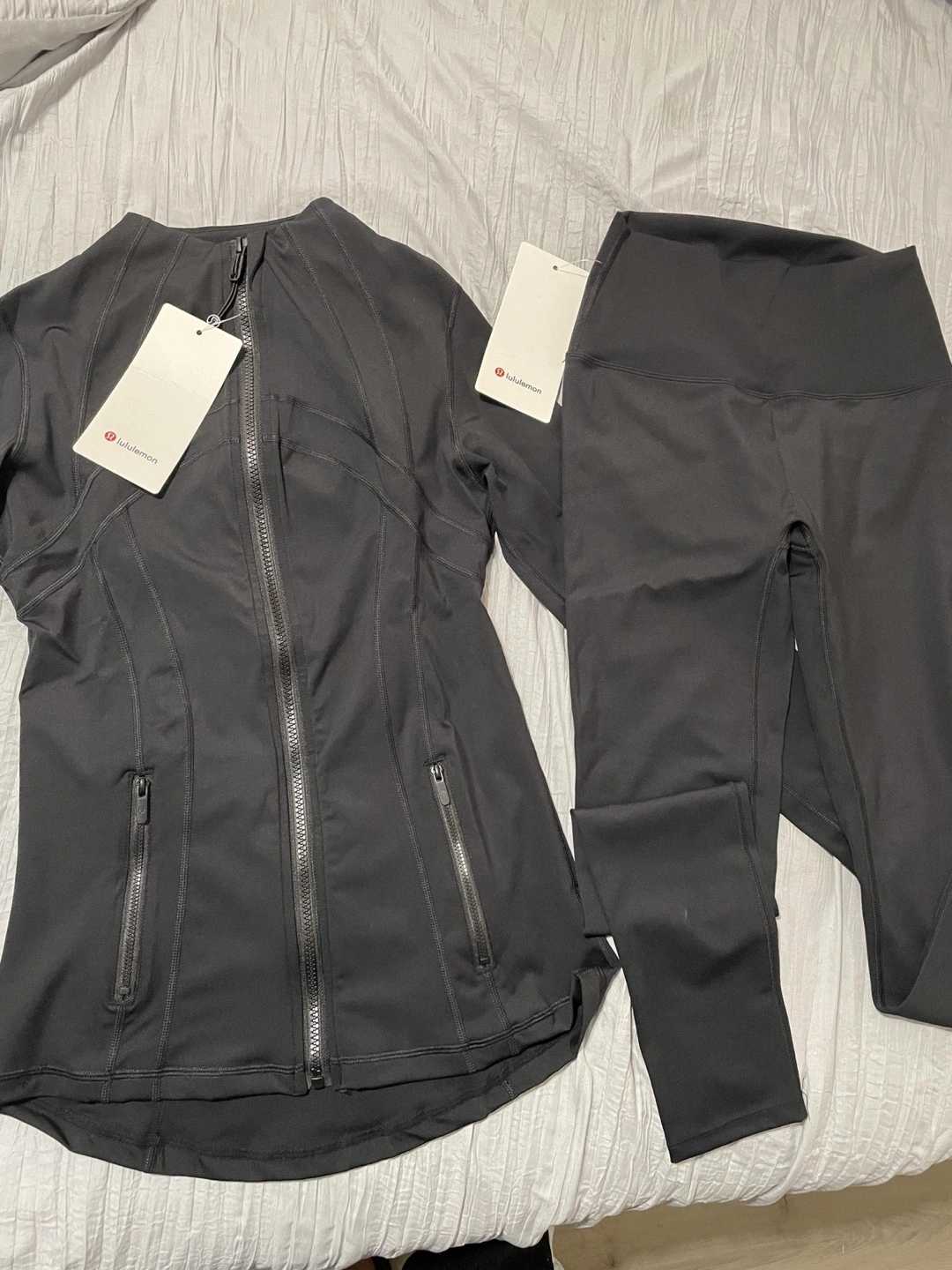 Amazing quality. The Sizes are 6, 8, 10, they’re new with tags. Lululemon set Includes black leggings. Price always negotiate. Price includes both Jacket & Leggings.