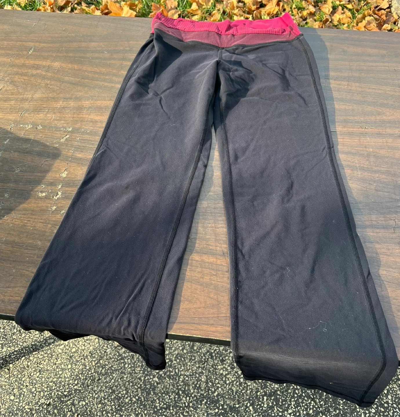 60Selling a pair of Lululemon yoga pants in black. They feature a pink waistband. Great for yoga or everyday wear!