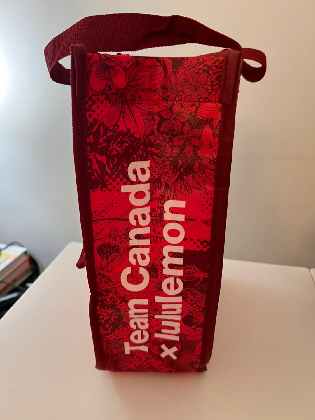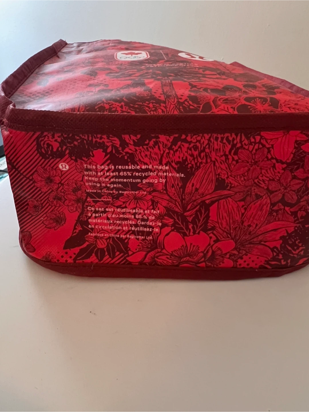 45This Lululemon tote bag is in great condition and ready for a new home! It's a reusable bag made with at least 65% recycled materials. The bag features a unique design collaboration with Team Canada. Perfect for groceries, gym gear, or everyday use!