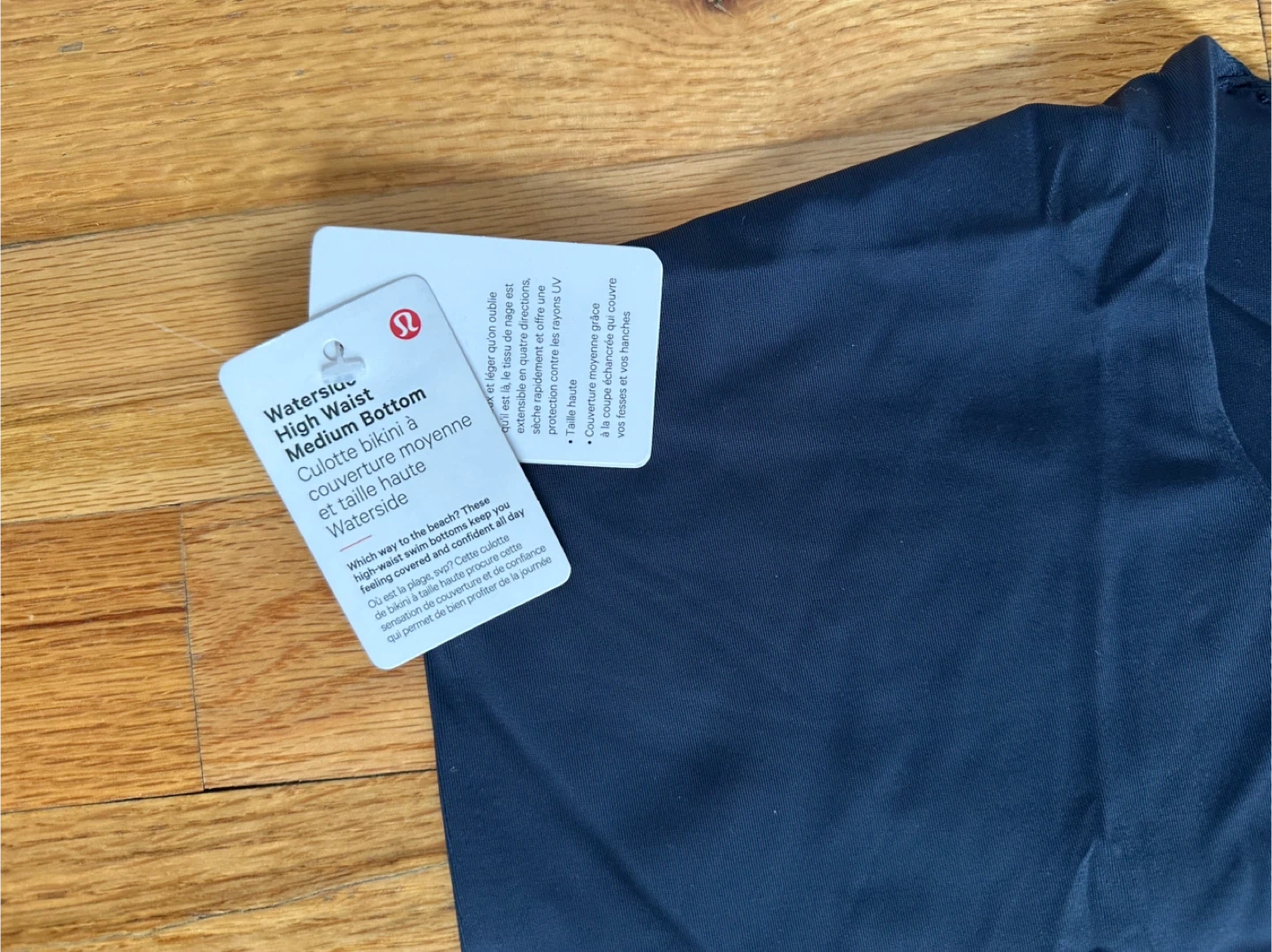 10Here's a Lululemon Waterside High Waist Medium Bottom in the color TRNV! It's a bikini bottom with medium coverage and a high waist. Perfect for the beach or pool